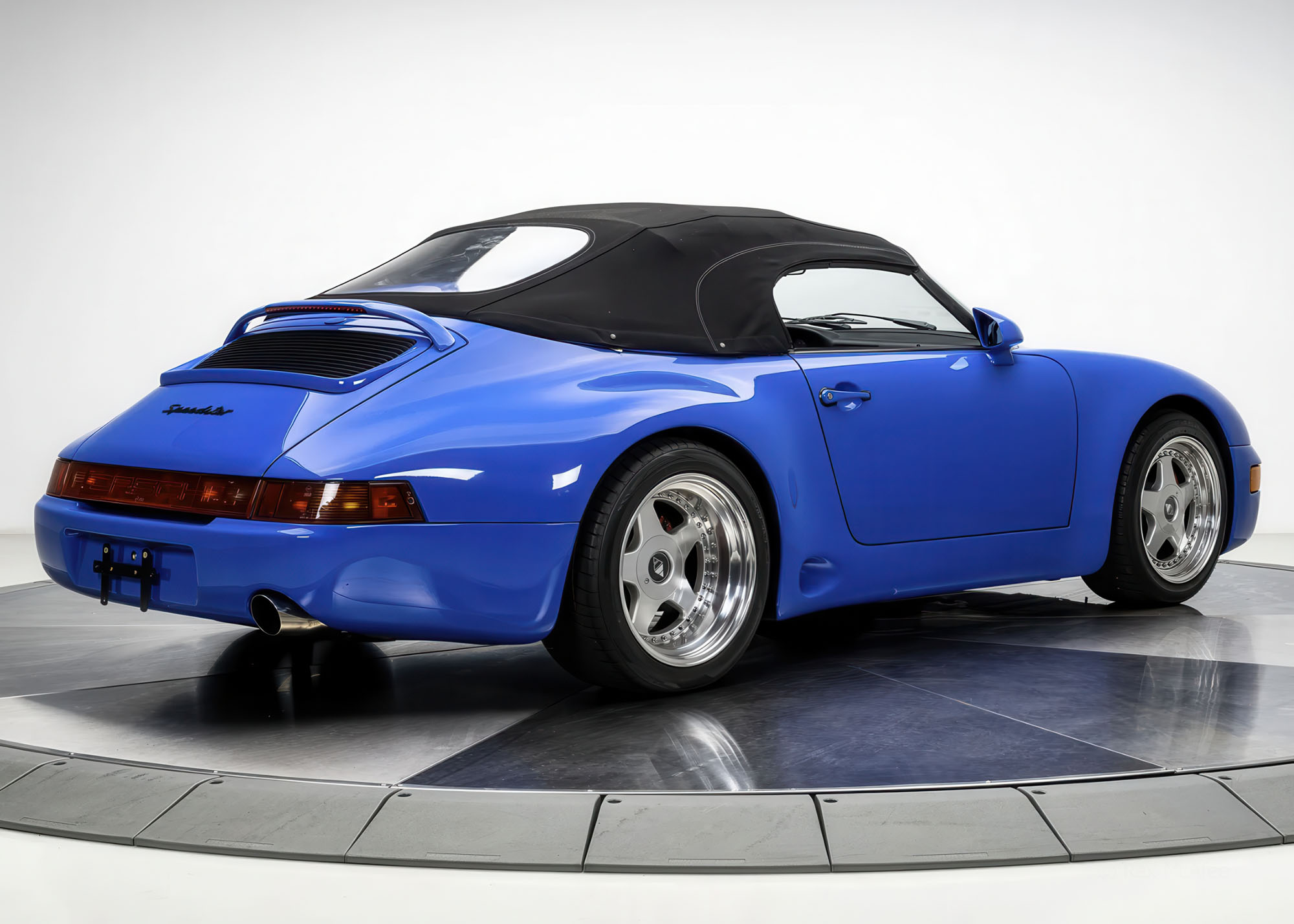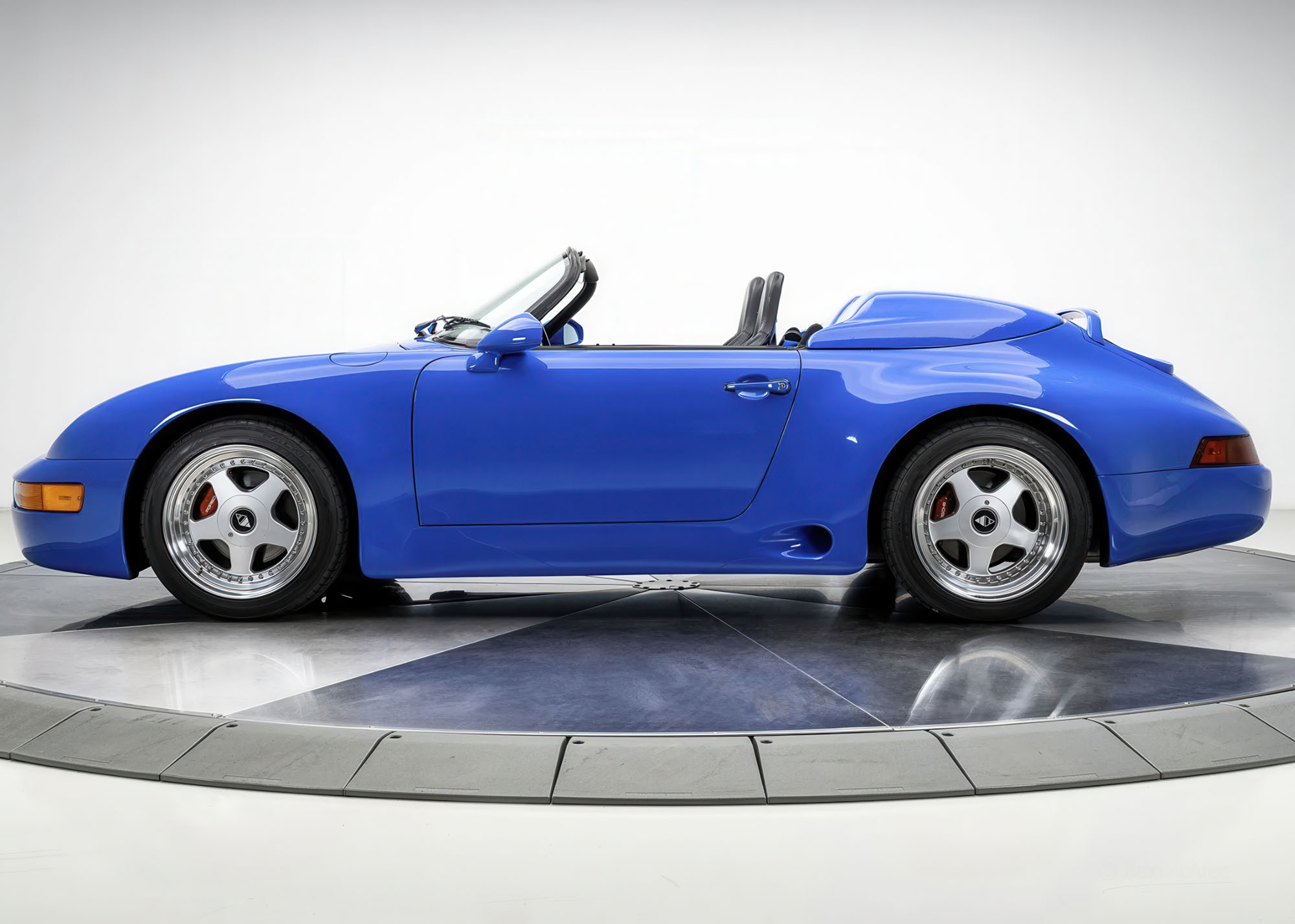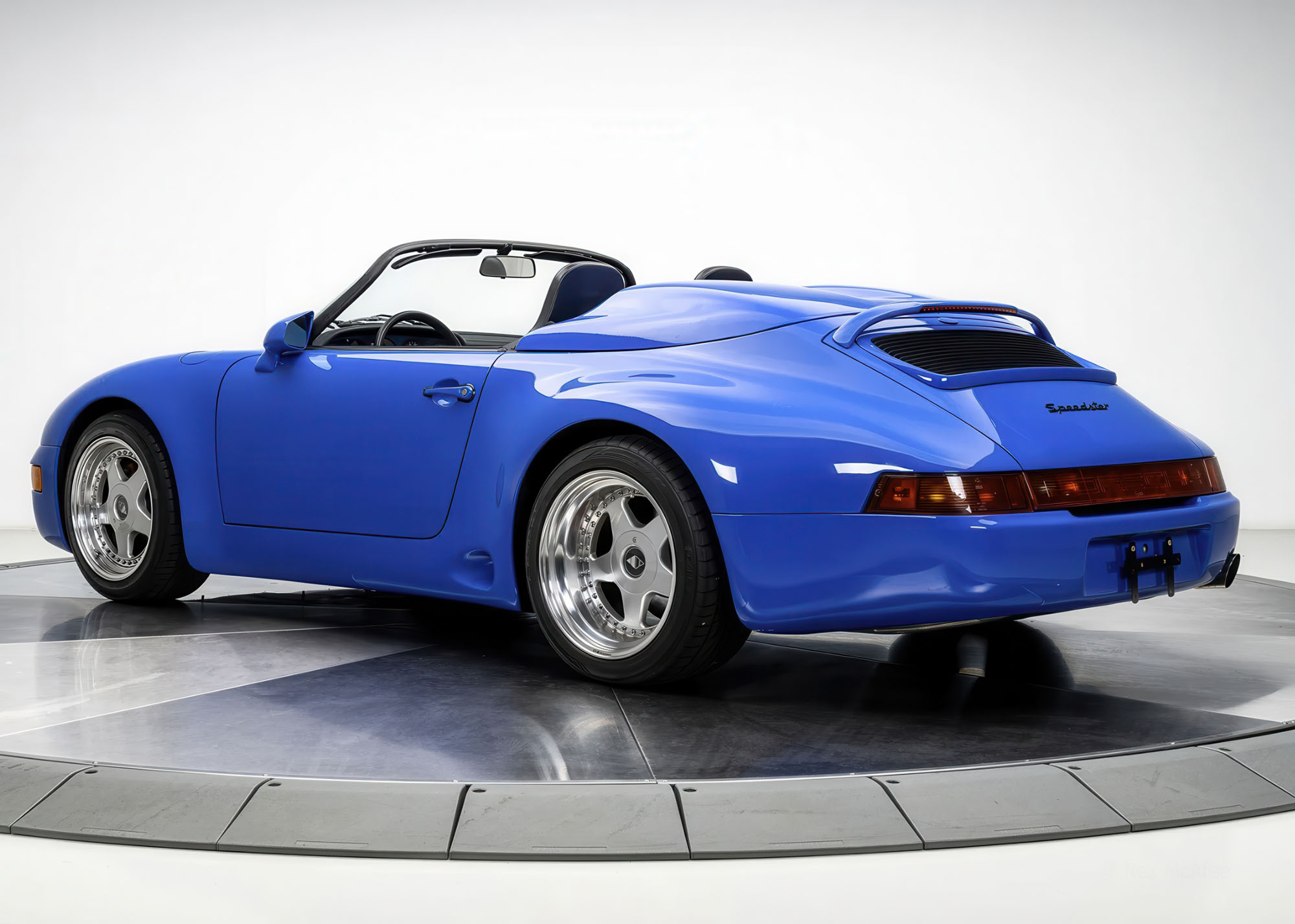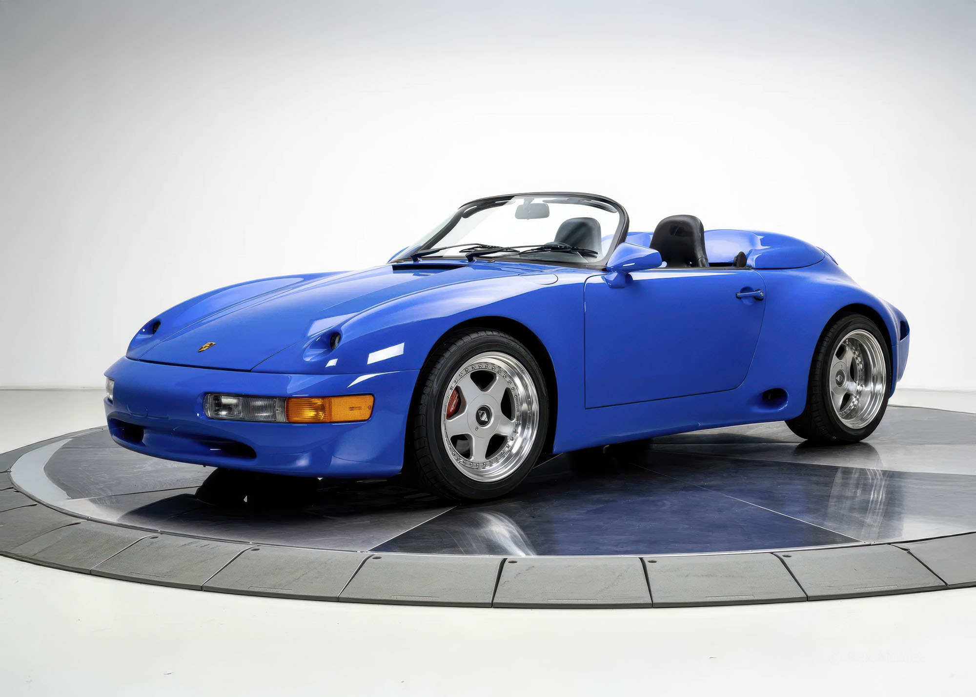 This 1994 Porsche 911 is one of 936 Speedsters produced for the single model year and was delivered new in Maritime Blue before it was modified by Vittorio Strosek with widened bodywork, a restyled front fascia, and a lowered suspension. The car features fixed-back bucket seats with black and blue leather upholstery, and power comes from a 3.6-liter flat-six paired with a five-speed manual transaxle. It also has a black soft top, a rear clamshell cover, three-piece 17″ OZ Racing wheels, air conditioning, and a Sony Bluetooth stereo. The car was sold on BaT in December 2021 before it was acquired by the current owner in 2024, and it now shows 6k miles. This modified 964 Speedster is offered on consignment in North Carolina by the selling dealer, a BaT Local Partner, with a clean Carfax report and a Montana title.