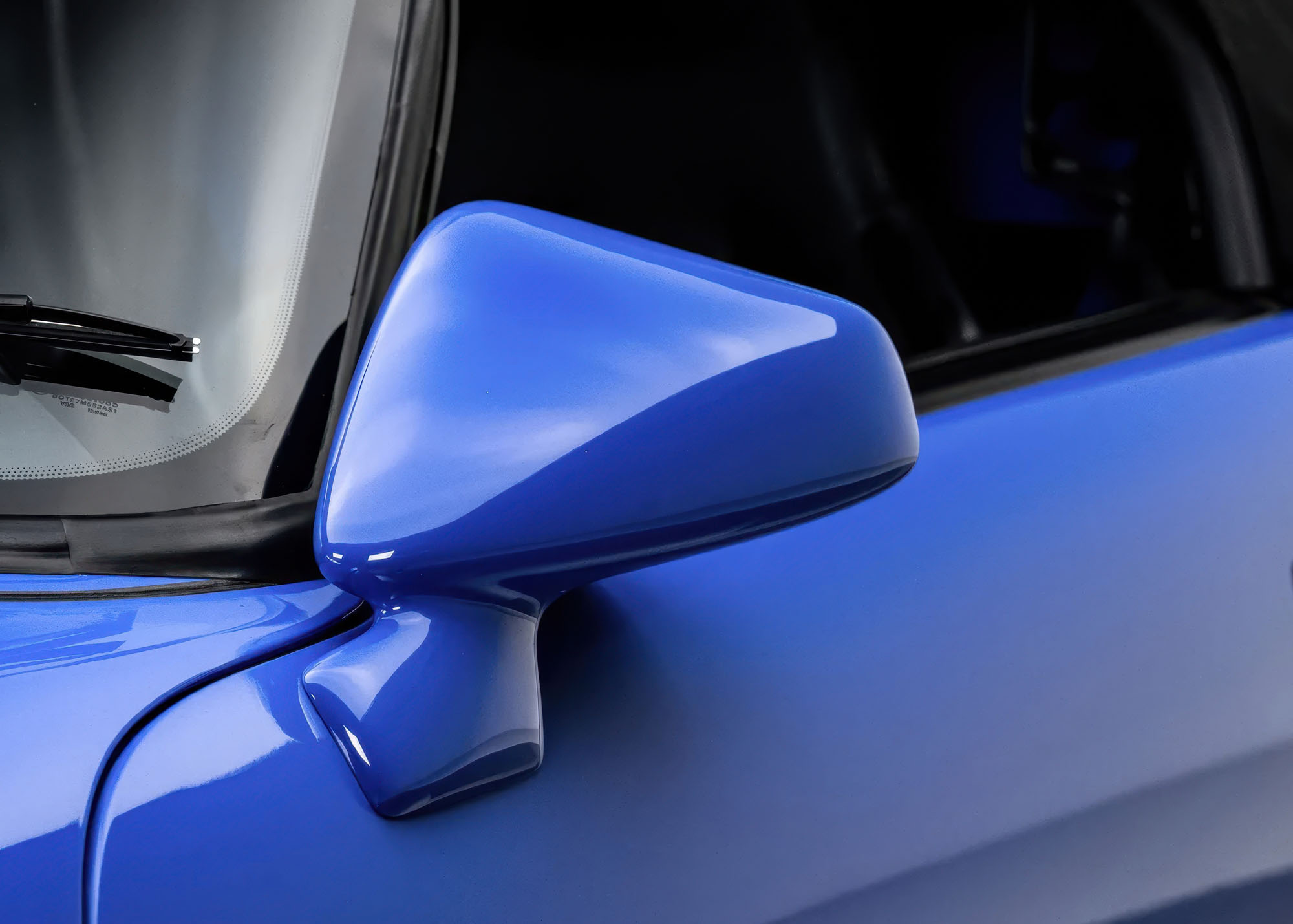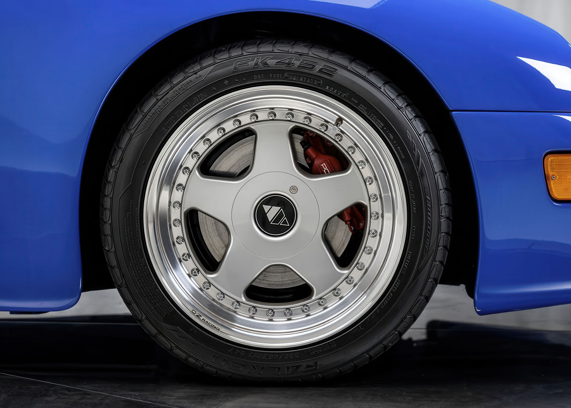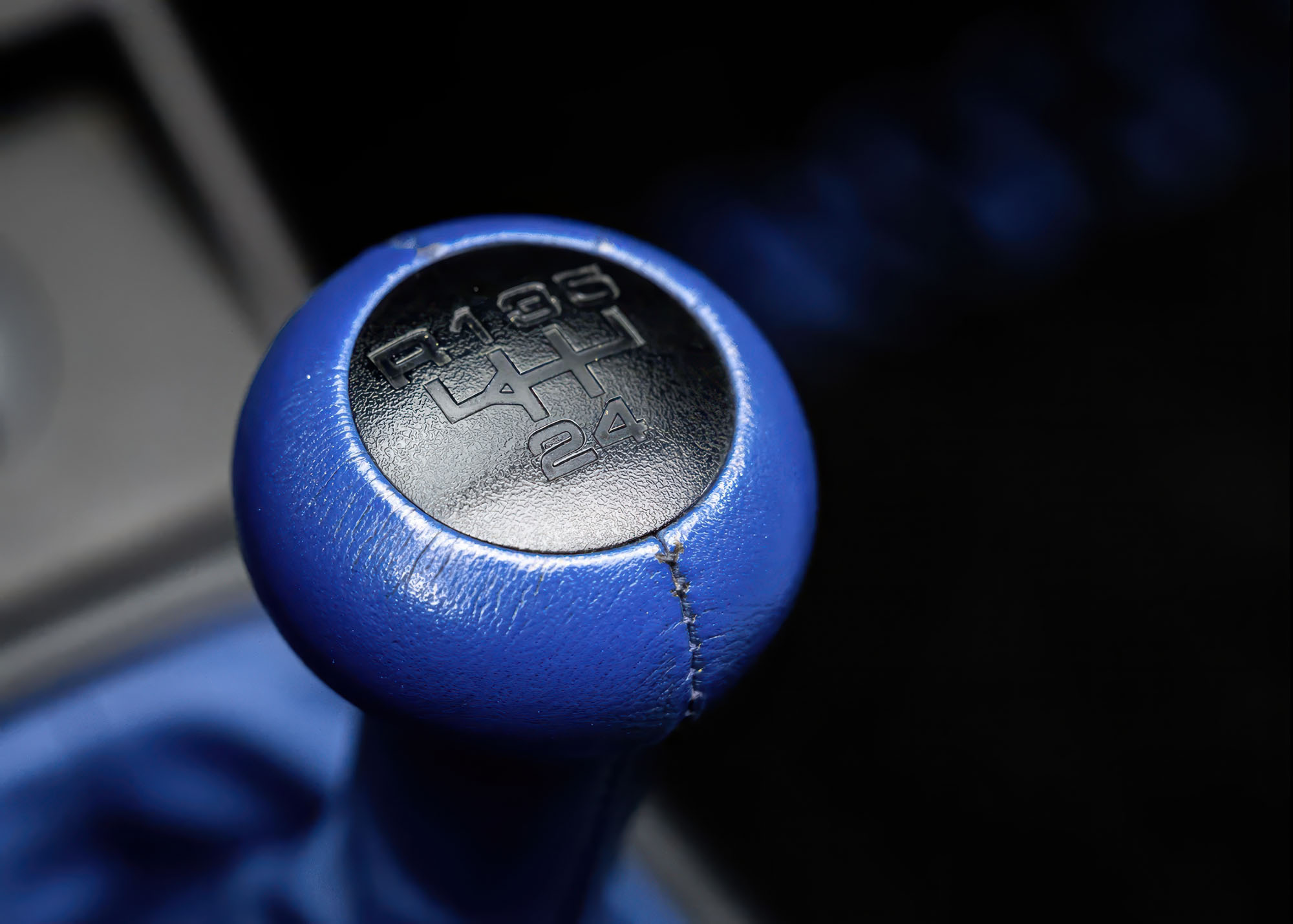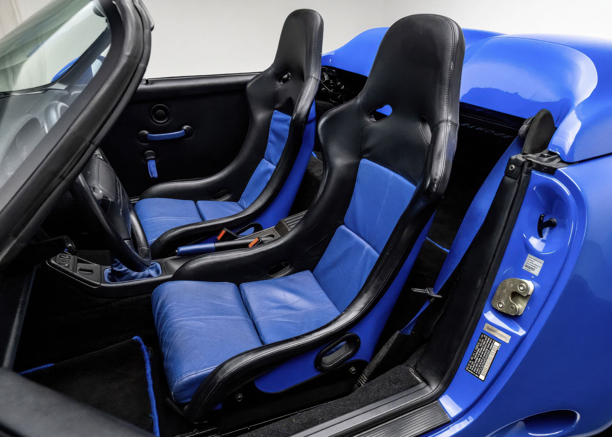 The interior features fixed-back Recaro bucket seats with body-color shells that are trimmed in black and blue leather. The revised door panels feature blue pulls that match the three-point seat belts. Equipment includes air conditioning and a Sony stereo with a CD player and Bluetooth connectivity. A four-spoke steering wheel sits ahead of VDO instrumentation, including a Strosek-branded 8k-rpm tachometer, a 180-mph speedometer, combination gauges, and an analog clock. The six-digit odometer shows 6k miles, of which approximately 200 were added under current ownership.