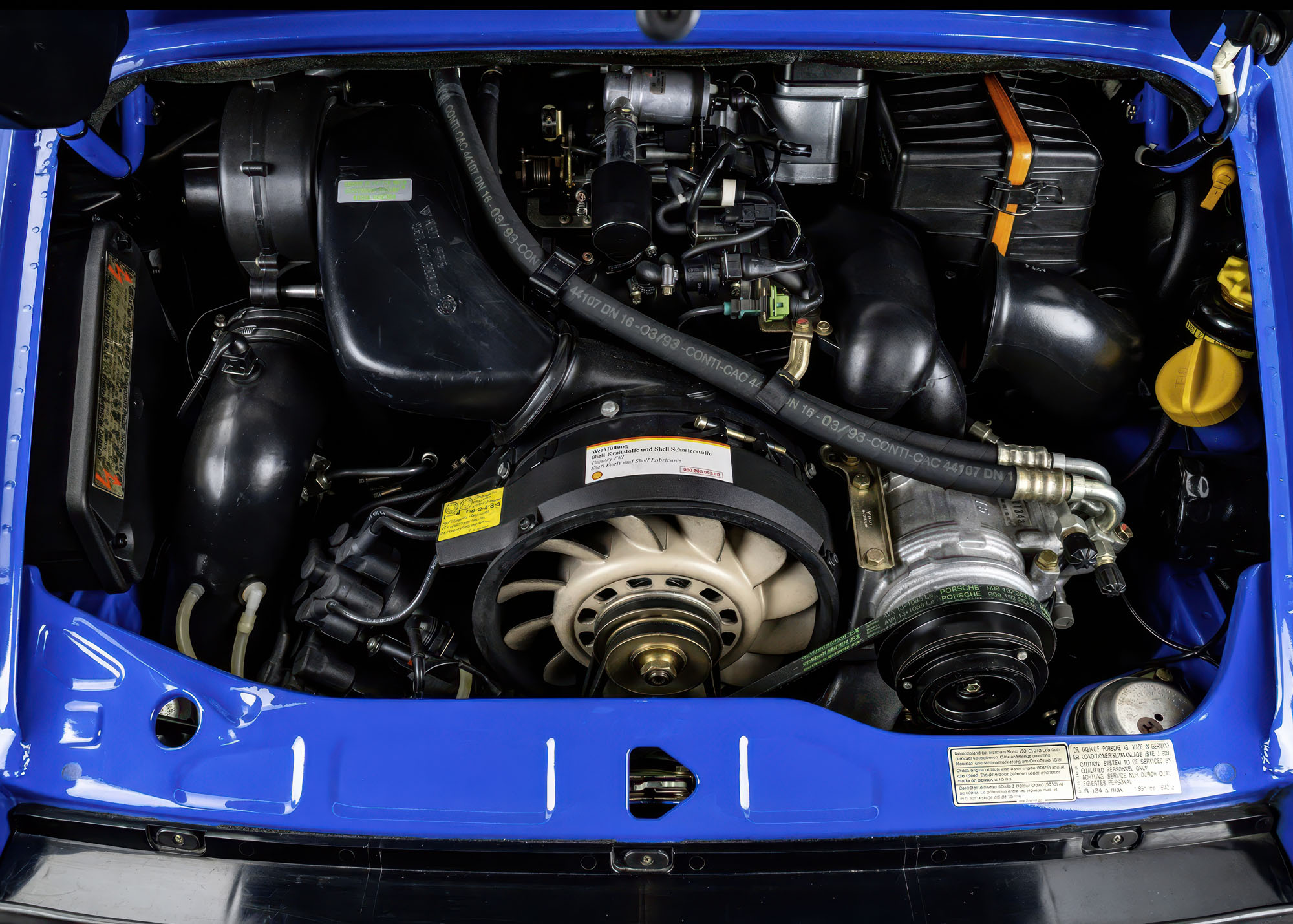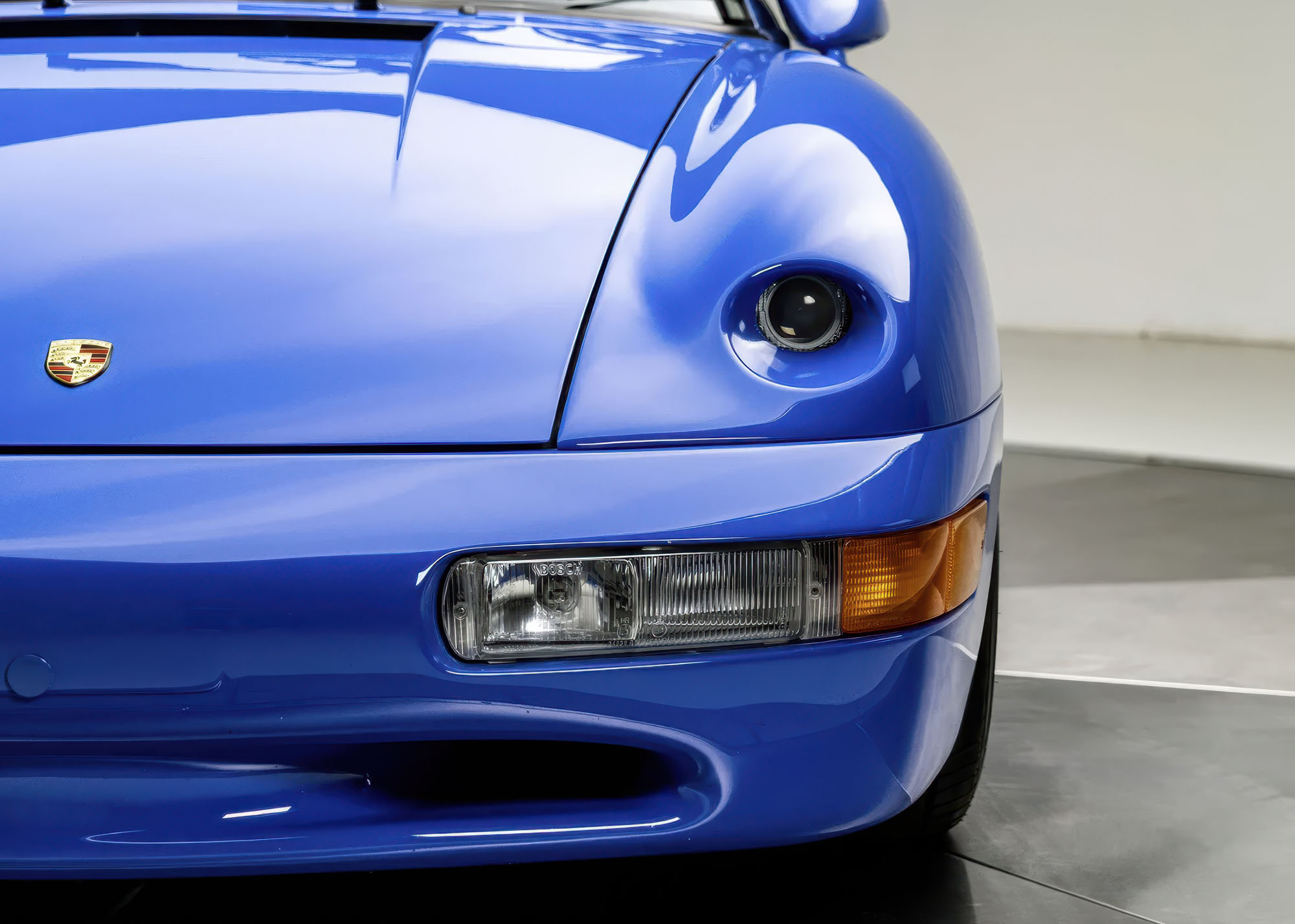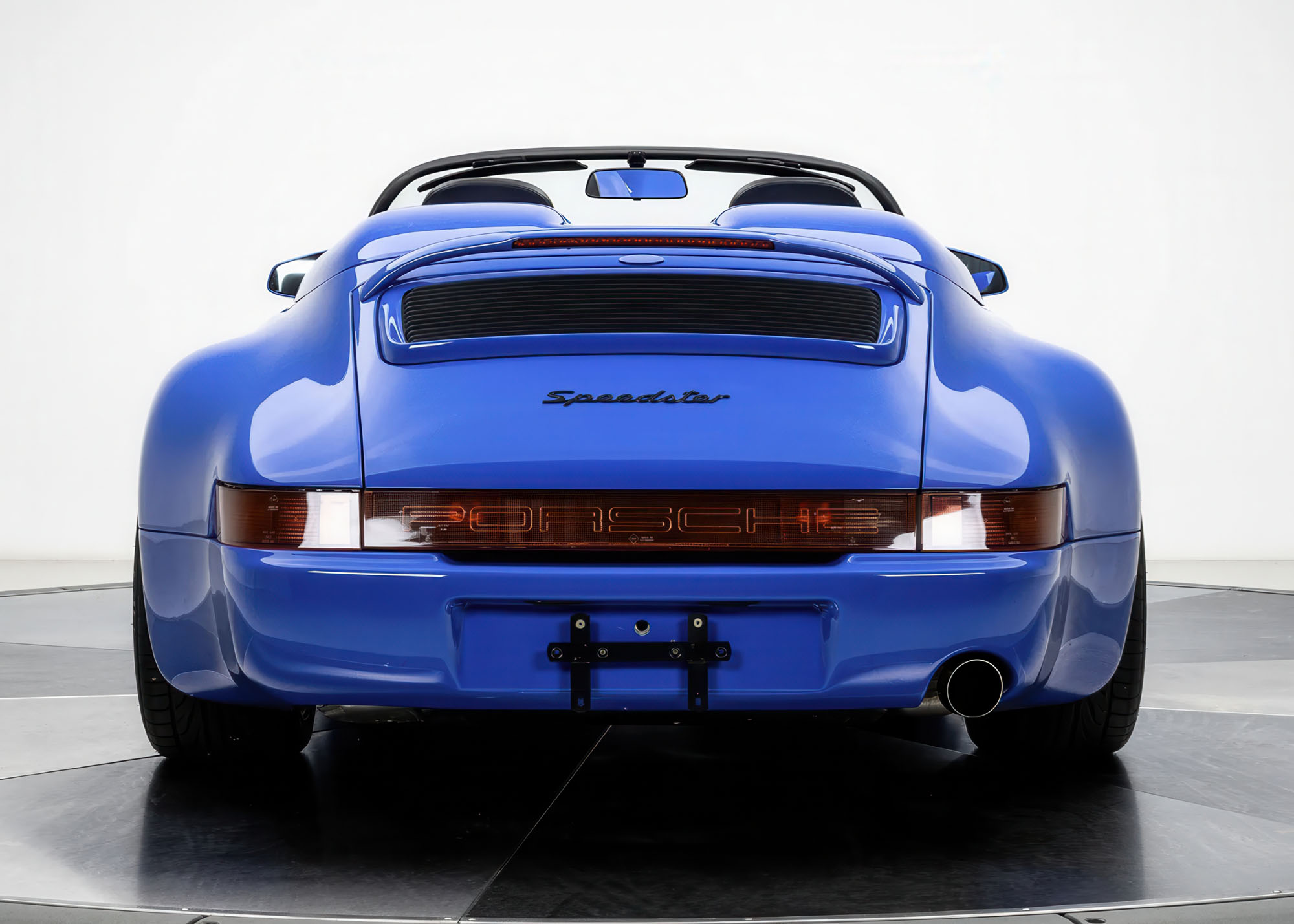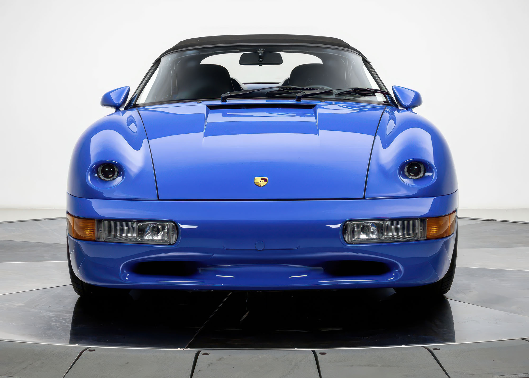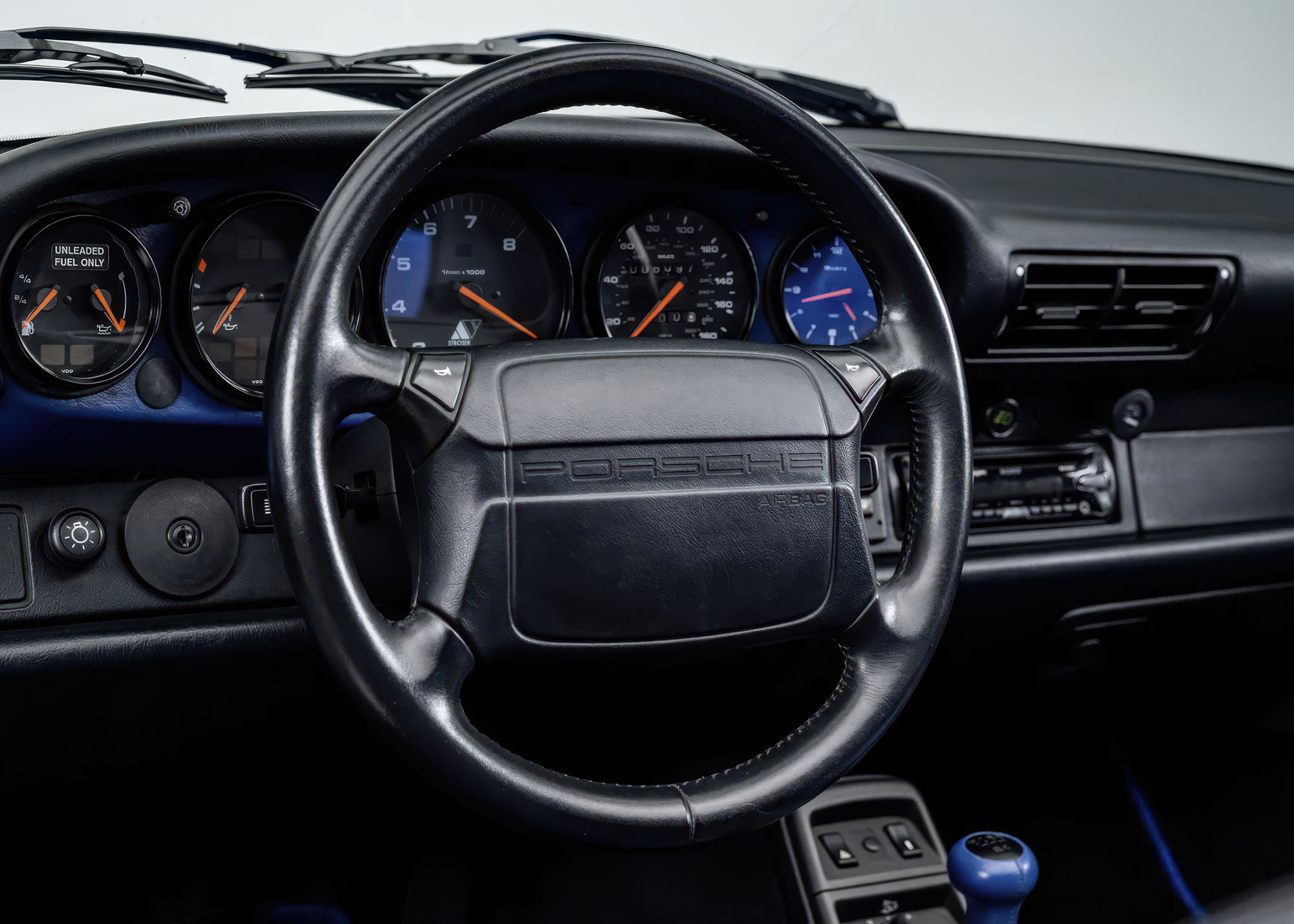 The car is finished in Maritime Blue (F2) and features a rear clamshell cover unique to the Speedster model. This example is said to have been modified by Vittorio Strosek with widened front and rear bodywork, a restyled front fascia, ellipsoid headlights molded into the front fenders, aerodynamic mirrors, inlets ahead of the rear wheels, and vented rear bodywork. The third brake light has been replaced with a 993-style “basket-handle.” Close-up photos of the paint and trim are provided in the gallery below.