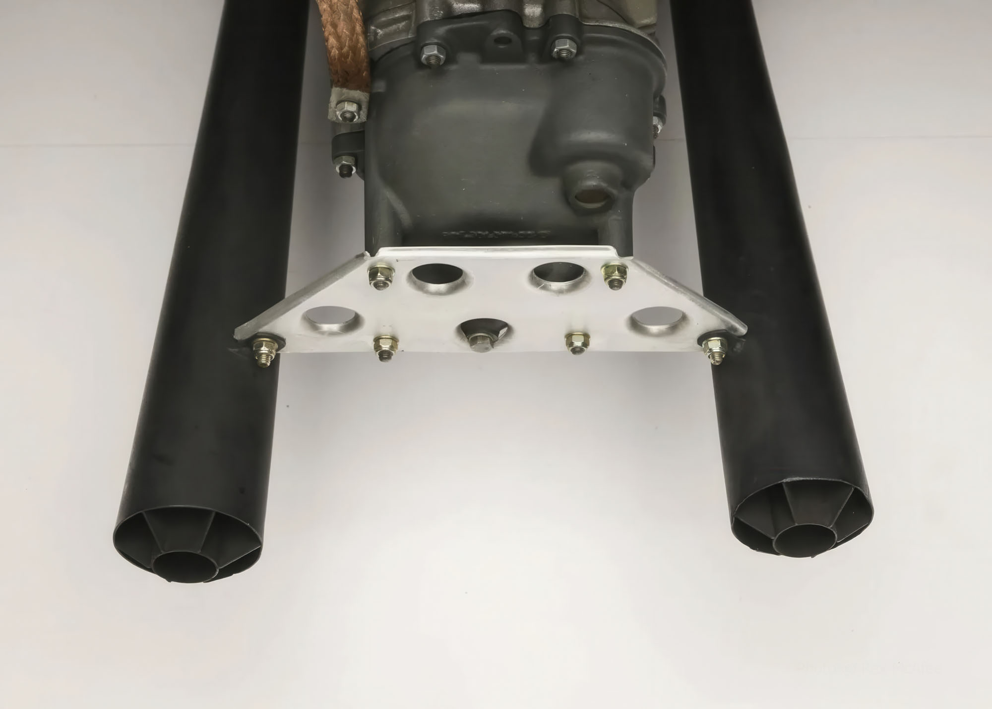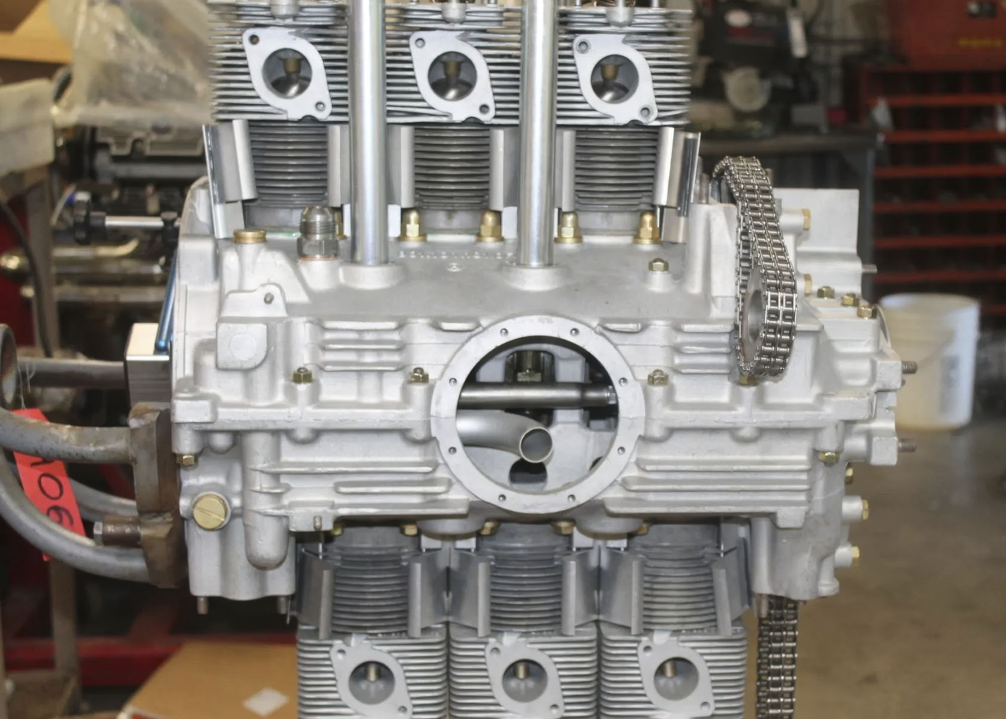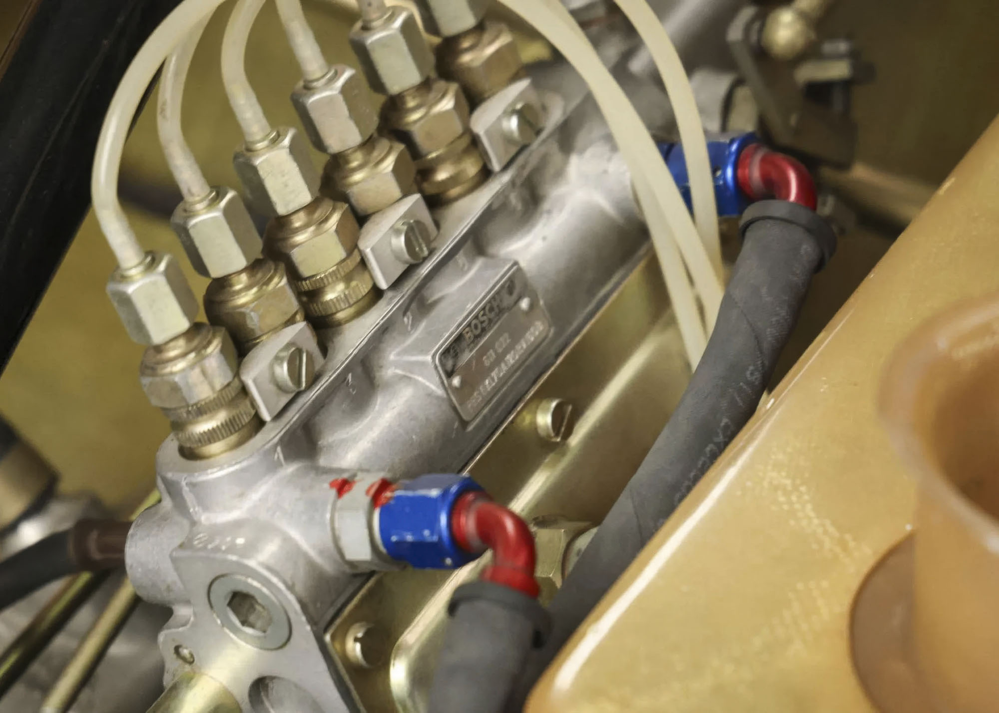 The 2.0-liter flat-six is said to have been built by SuperTec Performance in Fallbrook, California, during the 2022-2023 project using period pistons and cylinders, titanium connecting rods, an early Type 901 aluminum case, and modified cylinder heads designed for use with fuel injection. The Bosch Kugelfisher mechanical fuel injection pump is reportedly serviced and set up by Pacific Fuel Injection in Portland, Oregon, and feeds slide-valve throttle bodies topped by fiberglass intake trumpets. An oil cooler is situated at the nose of the car.