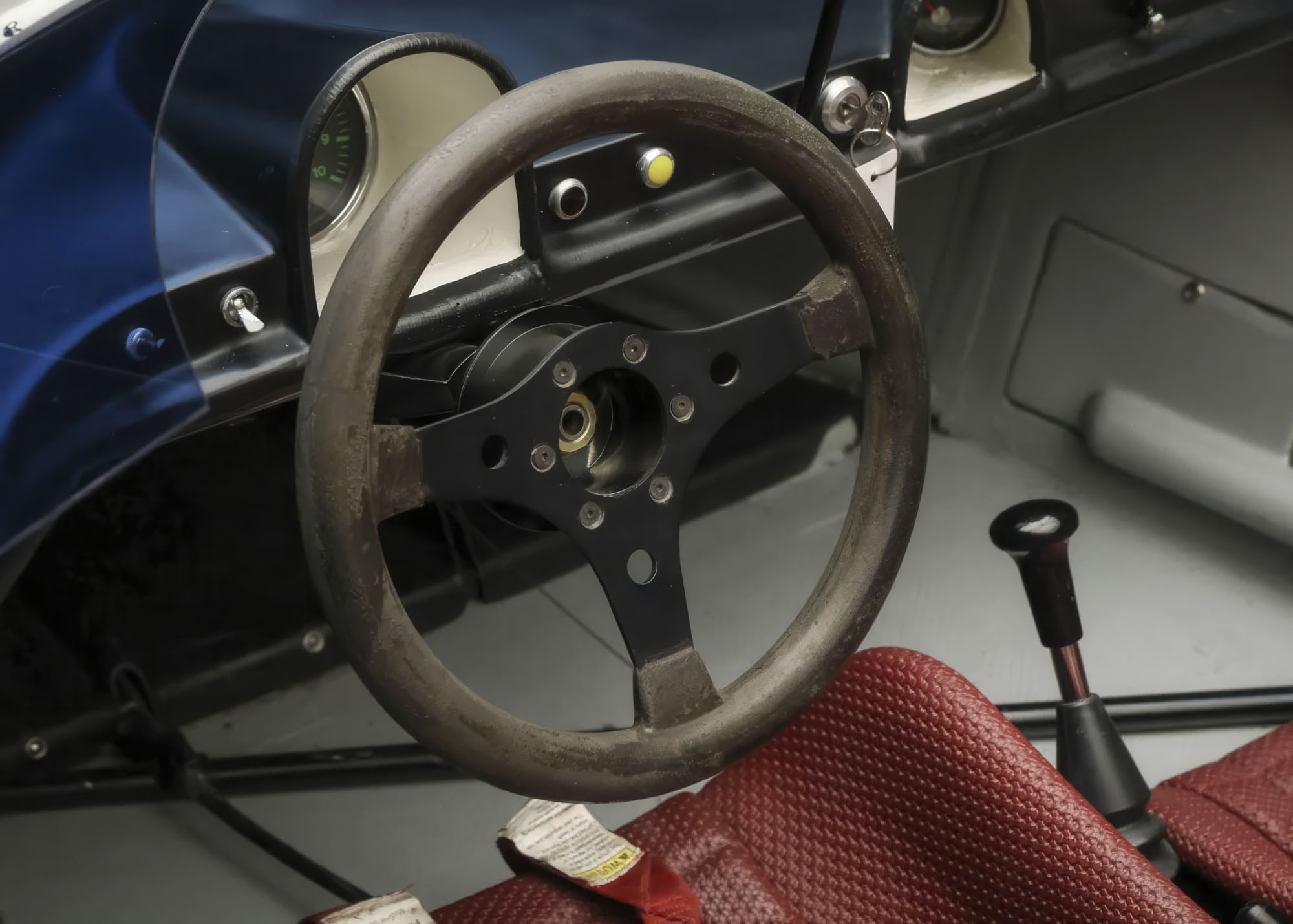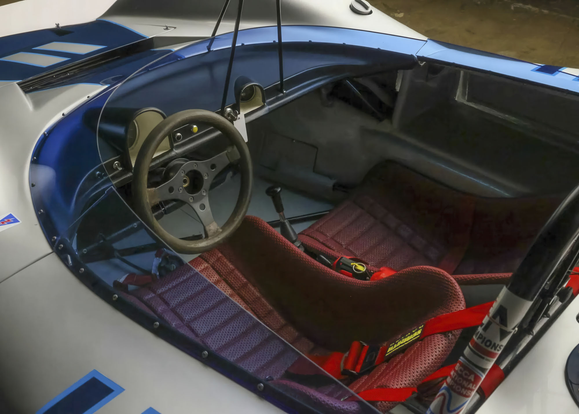 The left-hand-drive cockpit houses a pair of fixed-back fiberglass bucket seats that are trimmed in red vinyl. Equipment includes a red Schroth six-point harness for the driver, a red lap belt for the passenger, a central shifter, a padded driver-side headrest, an electrical cut-off switch, and a fire extinguisher. An Alwin Springer signature is present on the bulkhead, and a Vasek Polak Jr. signature is present on the driver-side sill.