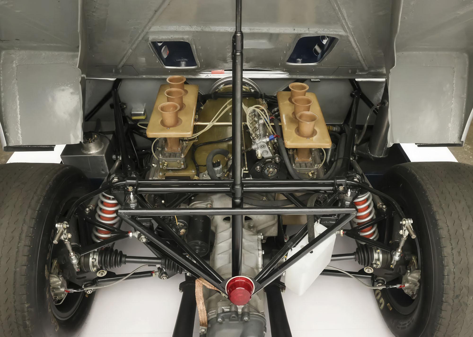 Power is sent to the rear wheels via a Type 906 five-speed manual transaxle featuring a magnesium case that was reportedly sourced from an Italian foundry by Porsche historian Kerry Morse, along with mainshaft, gears, and nose cone. The Rose-jointed suspension features a double-wishbone front setup and reverse rear upper wishbones, paired with single lower links and parallel radius rods. Coil-over shock absorbers and adjustable anti-roll bars are utilized at each end. Various titanium suspension parts and hardware are reportedly sourced from Germany.