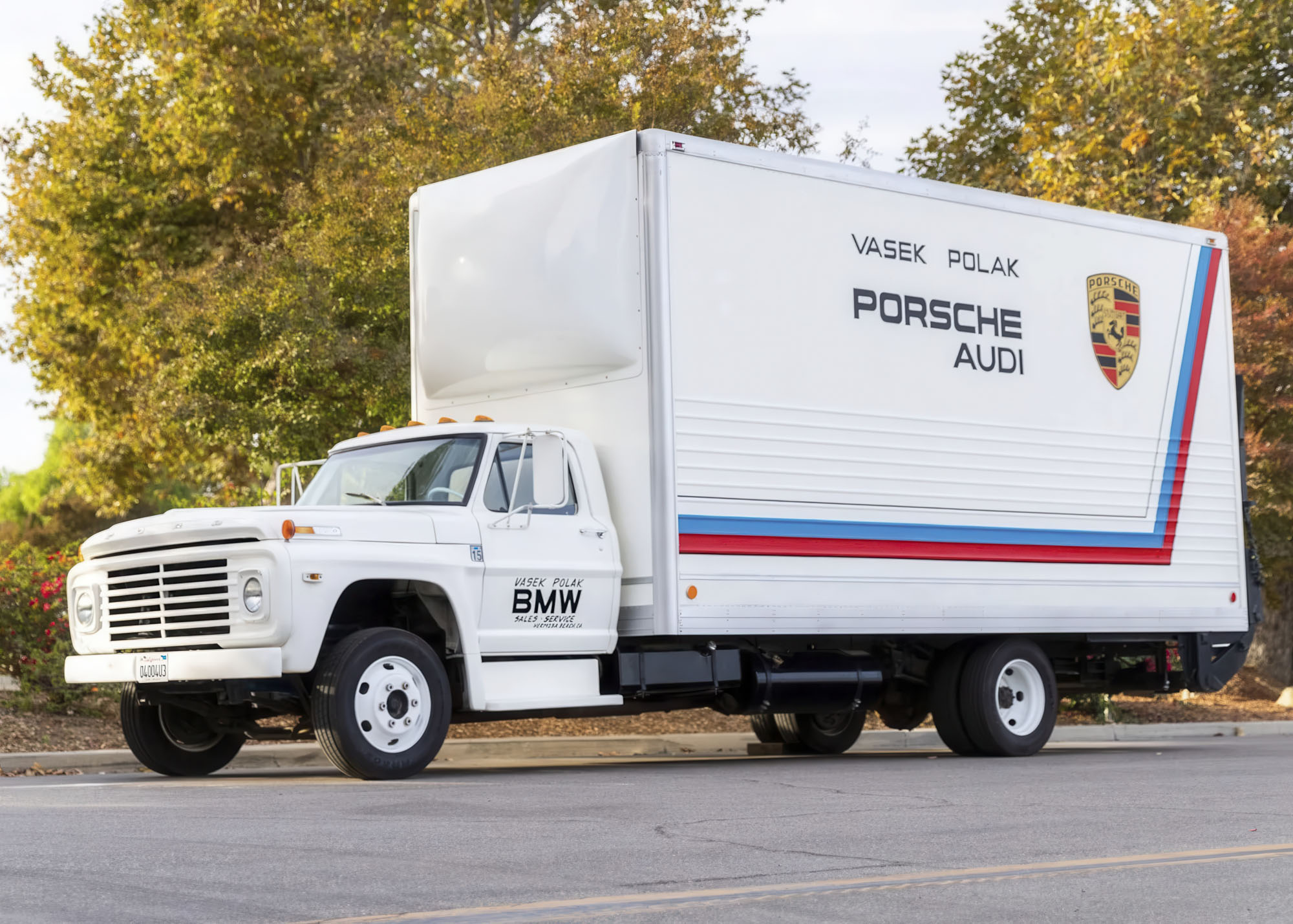 The included 1970 Ford F-600 box truck was reportedly used as a race support vehicle by Vasek Polak in the 1970s and was refurbished after being acquired by the current owner in 2010. The truck features a cab finished in white with hand-painted BMW lettering and a white cargo box with painted Vasek Polak graphics along with a roll-up door, a hydraulic liftgate with ramps, wood flooring, overhead lighting, a removable stairway, and a Snap-On toolbox.