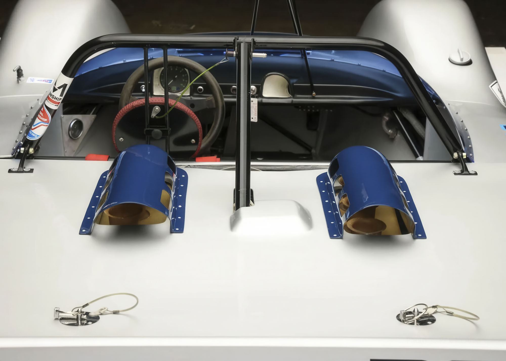 The body is finished in a silver and blue livery replicating that worn by the car while campaigned in SCCA competition by Polak in 1970. Features include front canards, a blue-tinted wrap-around windscreen, a pedestal-mounted rearview mirror, a roll bar integrated into the frame, dual carburetor clearance tunnels on the rear deck, a ducktail rear spoiler, and cookie-cutter exhaust outlets.
