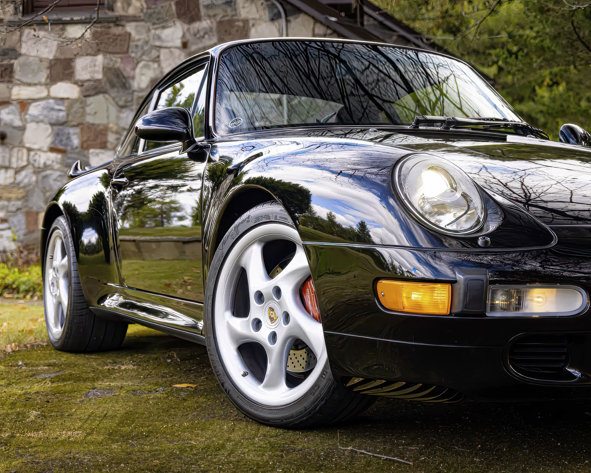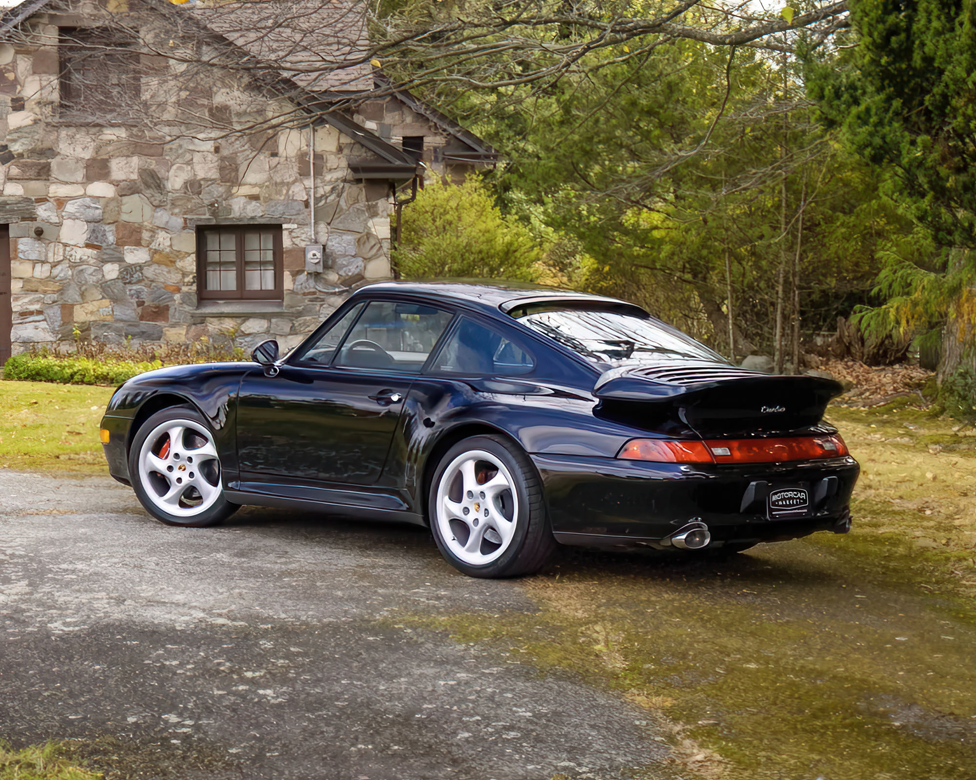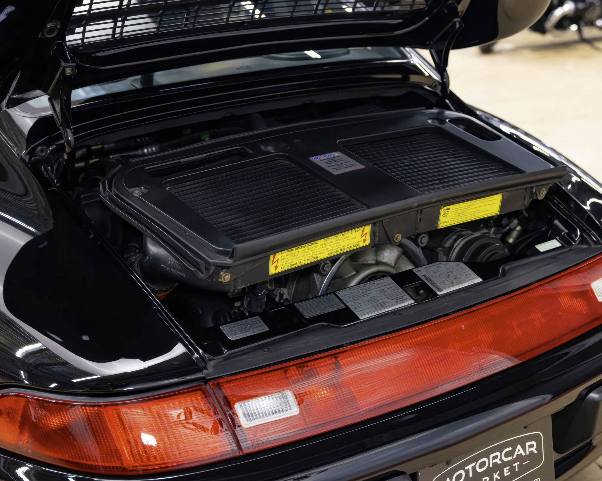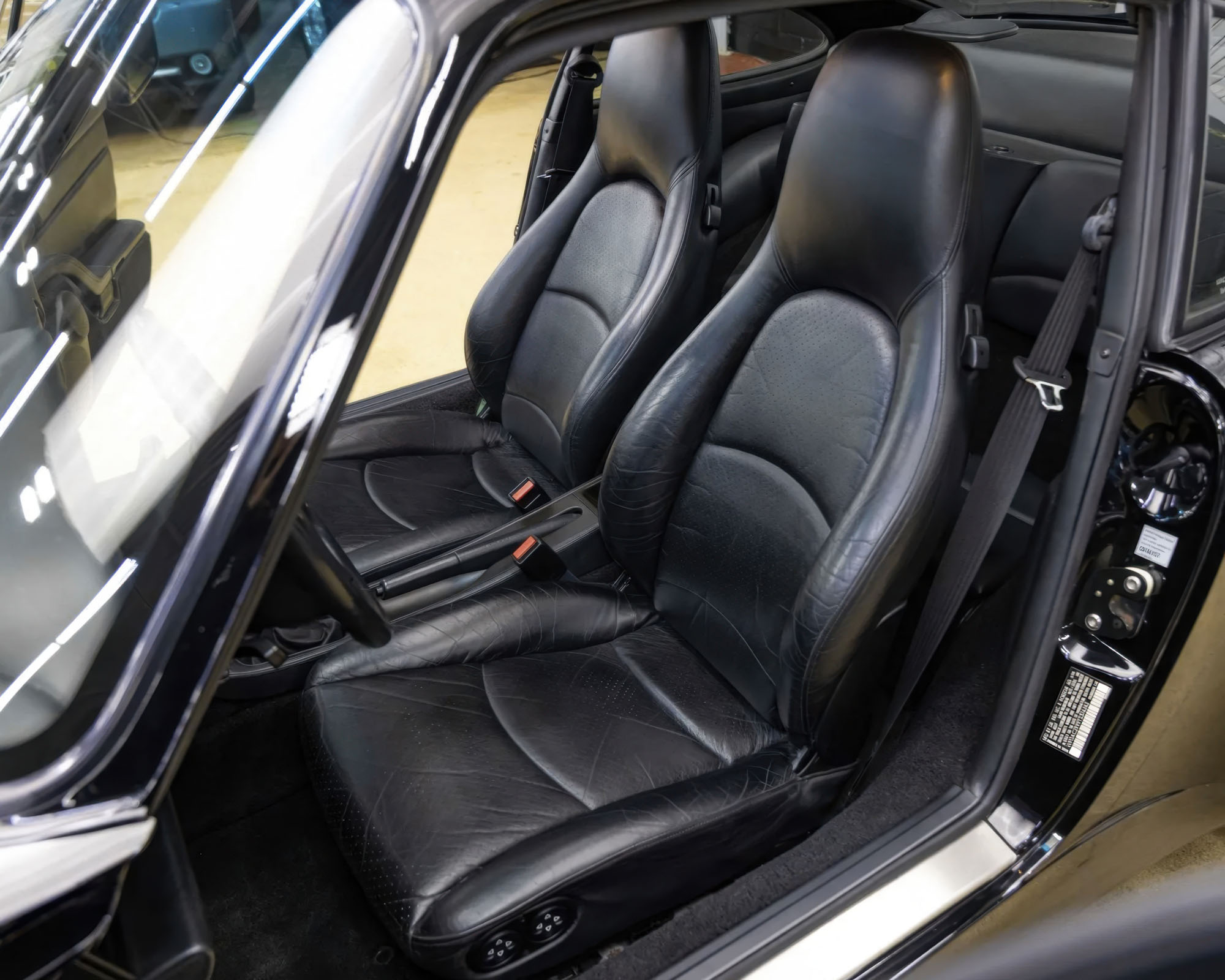 The 993 Turbo featured wider bodywork, revised bumper covers, and a fixed rear spoiler to accommodate top-mount intercoolers when compared with the standard 993 coupe. This example is finished in Black (041) and features a sunroof, integrated fog lights, and polished exhaust outlets. The Carfax report notes that the rear of the car sustained “minor damage” in June 2020, which the selling dealer attributes to when a valet backed into another car, and the rear bumper cover was repainted to address the damage.