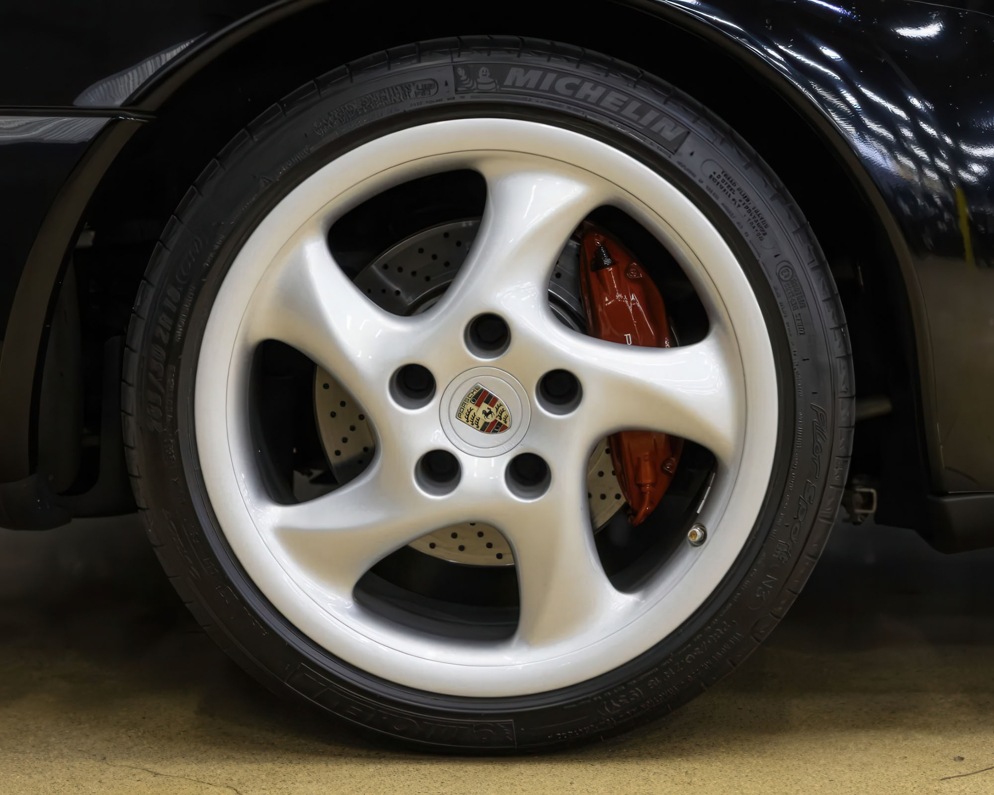 The 18″ Turbo Twist wheels are mounted with Michelin Pilot Sport tires. The car features an Automatic Brake Differential (ABD), and the 993 was the first 911 to feature multi-link rear suspension. Braking is provided by red Porsche-branded four-piston calipers over cross-drilled rotors. The power steering reservoir was replaced in 2014, and the front brakes were serviced in 2017.