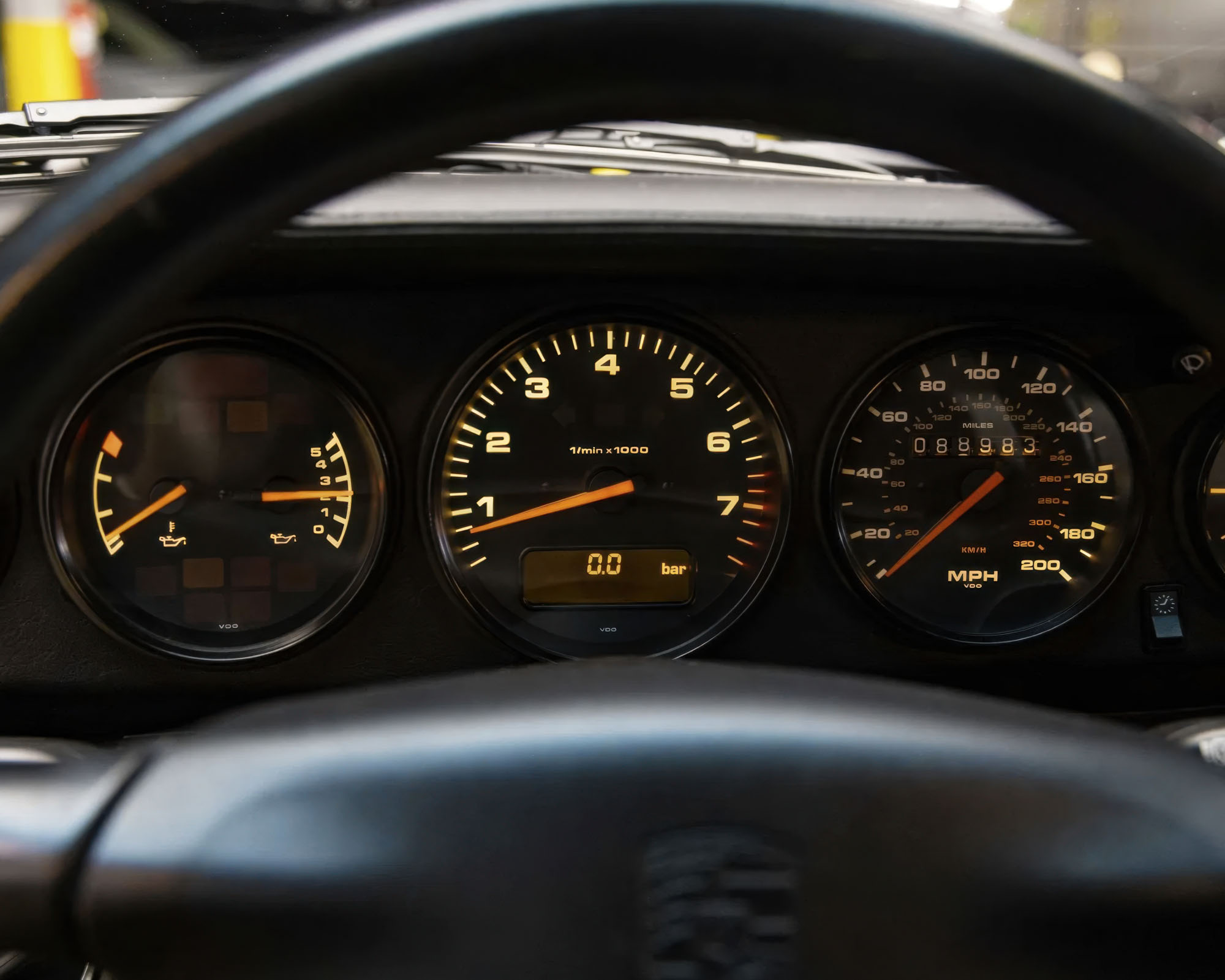 The leather-wrapped steering wheel frames a central tachometer, a 200-mph speedometer, an analog quartz clock, and gauges for oil pressure, oil temperature, oil level, and fuel level. The six-digit odometer shows 89k miles, with approximately 400 miles added under current ownership.