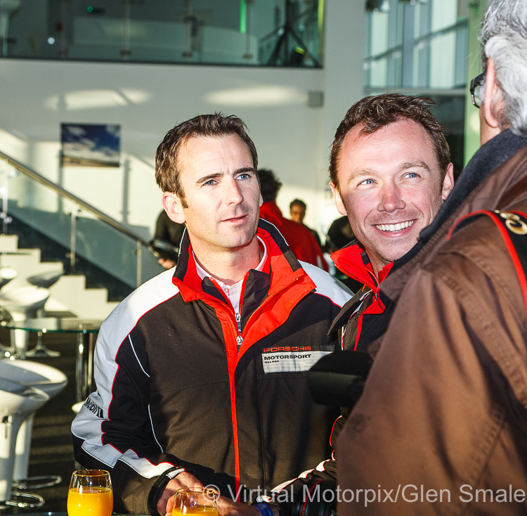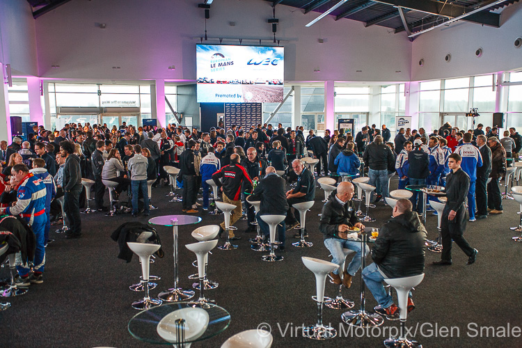 (Left) Romain Dumas (left) and Patrick Pilet (right) in discussion with a member of the media at the WEC launch party; (Above) Overhead view of the inaugural WEC launch party in the new Silverstone Wing, Thursday 11 April 2013