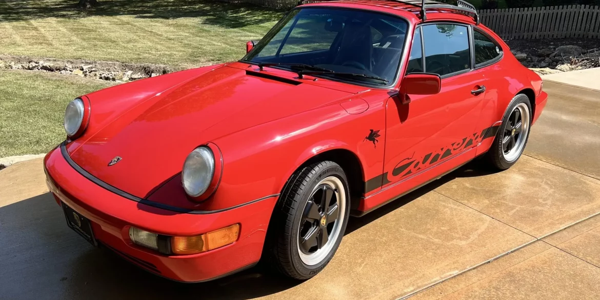 This 1989 Porsche 911 Carrera 4 coupe was purchased by the seller in 2010 and shows 89k miles. Powered by a 3.6-liter flat-six that drives all four wheels through a five-speed manual transaxle, it is finished in Guards Red over black leather upholstery. Features include 17″ Fuchs wheels, a limited-slip...