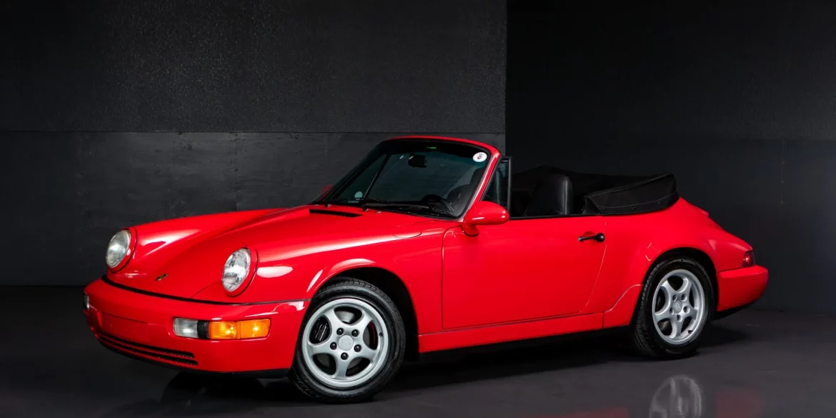 This 1992 Porsche 911 Carrera 2 cabriolet is powered by a 3.6-liter flat-six paired with a five-speed manual transaxle, and it is finished in Guards Red over black leather upholstery. Equipment includes a black soft top, power-adjustable front seats, cruise control, air conditioning, and a Porsche Classic Communication Management (PCCM)...