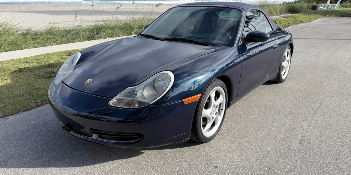 This 2000 Porsche 911 Carrera cabriolet is finished in Ocean Blue Metallic over Graphite Grey Partial leather and has 40k miles following history in Ohio, North Carolina, Florida, and Alabama. It is equipped with a replacement blue soft top, a hi-fi sound system, metal door sill guards, 18″ Turbo-look wheels,...