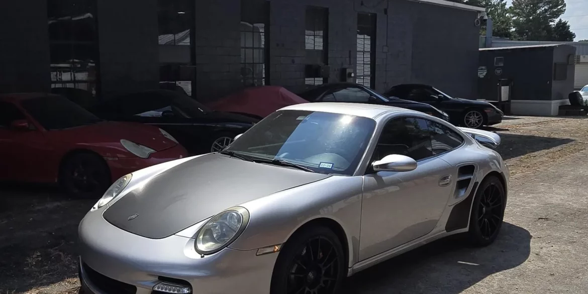 This 2007 Porsche 911 Turbo coupe is powered by a twin-turbocharged 3.6L flat-six that drives all four wheels via a five-speed Tiptronic S automatic transaxle. It is finished in Arctic Silver Metallic with vinyl-wrapped matte accents over a black full leather interior, and it has been modified with a Billy Boat...