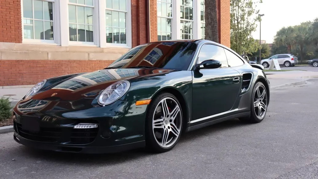 This 2007 Porsche 911 Turbo coupe is finished in Forest Green Metallic over Cocoa Special leather and has 67k miles following history in Missouri and South Carolina. It is powered by a twin-turbocharged 3.6L flat-six that drives all four wheels via a six-speed manual transaxle and a locking rear differential....