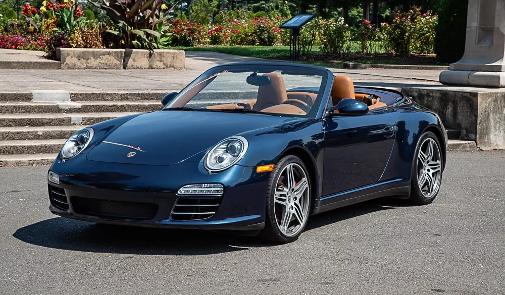 This 2010 Porsche 911 Carrera 4S cabriolet has 63k miles and is finished in Dark Blue Metallic with a Metropol blue convertible soft top over Natural Brown leather. Power is from a 3.8-liter flat-six that drives all four wheels through a seven-speed PDK dual-clutch transaxle. Equipment includes the Sport Chrono...