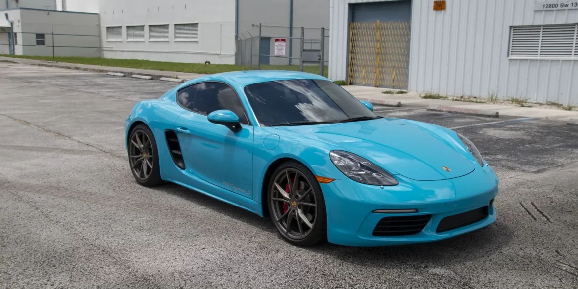 This 2017 Porsche 718 Cayman S has 34k miles and was optioned with the Premium and Sport Chrono packages. Finished in Miami Blue over black leather upholstery, it is powered by a turbocharged 2.5-liter flat-four paired with a replacement six-speed manual transaxle, which was installed in January 2024. The car...