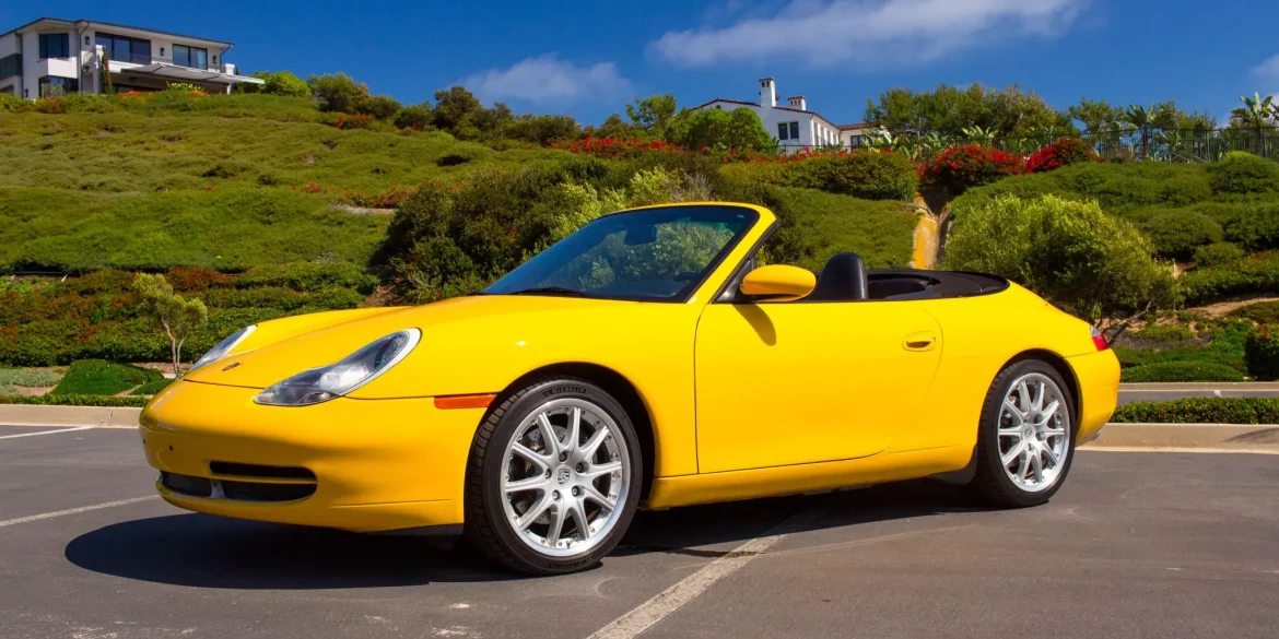 This 2001 Porsche 911 Carrera cabriolet was specified in Speed Yellow over black leather, and it has been registered in California since November 2000. It is powered by a 3.4-liter M96 flat-six paired with a six-speed manual transaxle, and equipment includes a black soft top, a deployable rear spoiler, 18″...