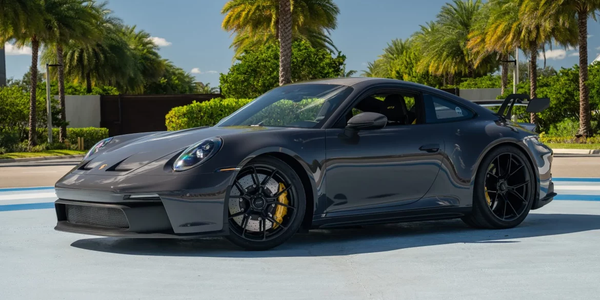 2024 Porsche 911 GT3 in paint to sample Carbon Steel Grey Metallic over Black with only 5,592 miles. This GT3 is loaded with: 4.0 Liter H6, 6 speed manual transmission, 20/21 inch centerlock wheels in satin silver, carbon ceramic brakes with yellow calipers, front axle lift, LED headlamps in black with dynamic...