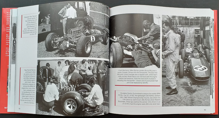 Although the front cover shows a pair of Alfa Romeo T33 sports prototypes, it would be remiss of me not to point out that much of the book concerns Formula One racing. Porsche fans will have to wait until the middle of the book before one of their favourite models is shown. But having said that, the quality and variation of images portrayed in the pages of this book is of the highest order. Any self-respecting motorsport enthusiast could not help but be impressed by the positions and places that the author got himself into, and who he was able to capture in the cross-hairs of his lens. Modest, is the only way to describe the author’s own view of his work, because it is not only refreshing, but also staggering to see the variety of shots he has been able to capture. Particularly amusing is the shot of a Lotus 63 being worked on, propped up off the ground supported by four wheels lying on their side, while Colin Chapman looked on!