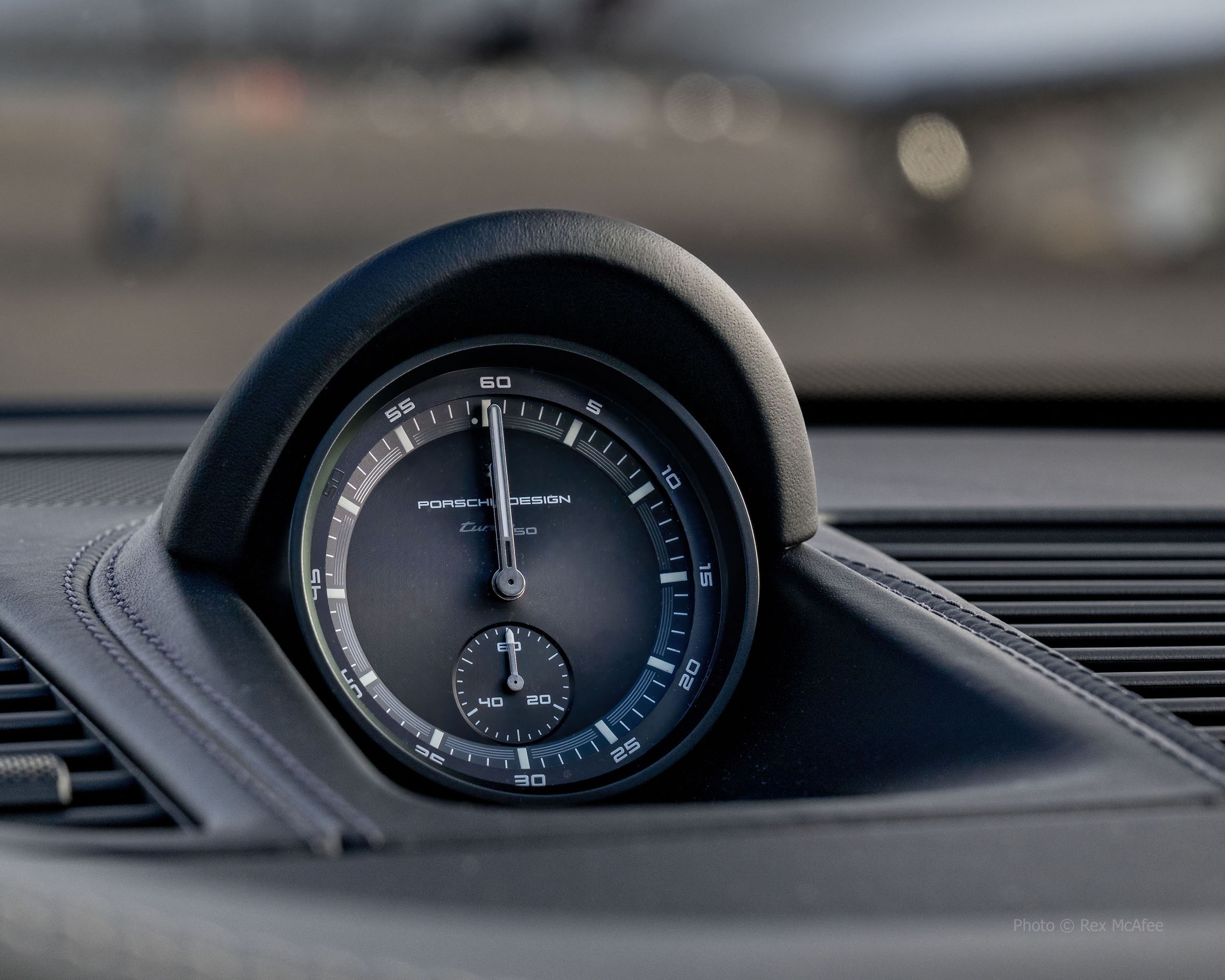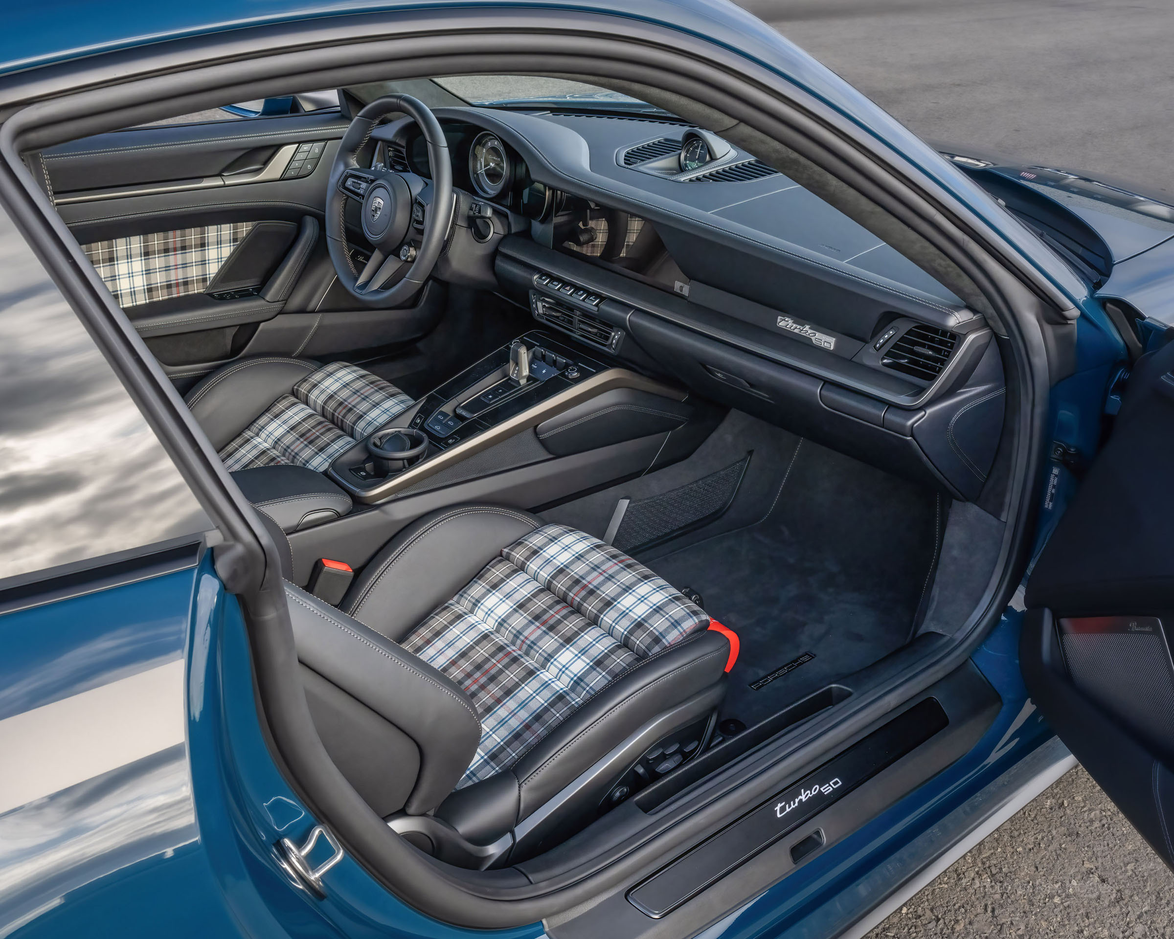 - Interior touches lean heavily into Porsche heritage: the iconic “Mackenzie” tartan cloth appears on the seats and door panels (a callback to the original 911 Turbo’s offerings), Turbonite contrast stitching and trim, illuminated “turbo 50” door sill plates, an anniversary plaque with individual number, and even a Porsche Design Sub second clock mounted in the dashboard.