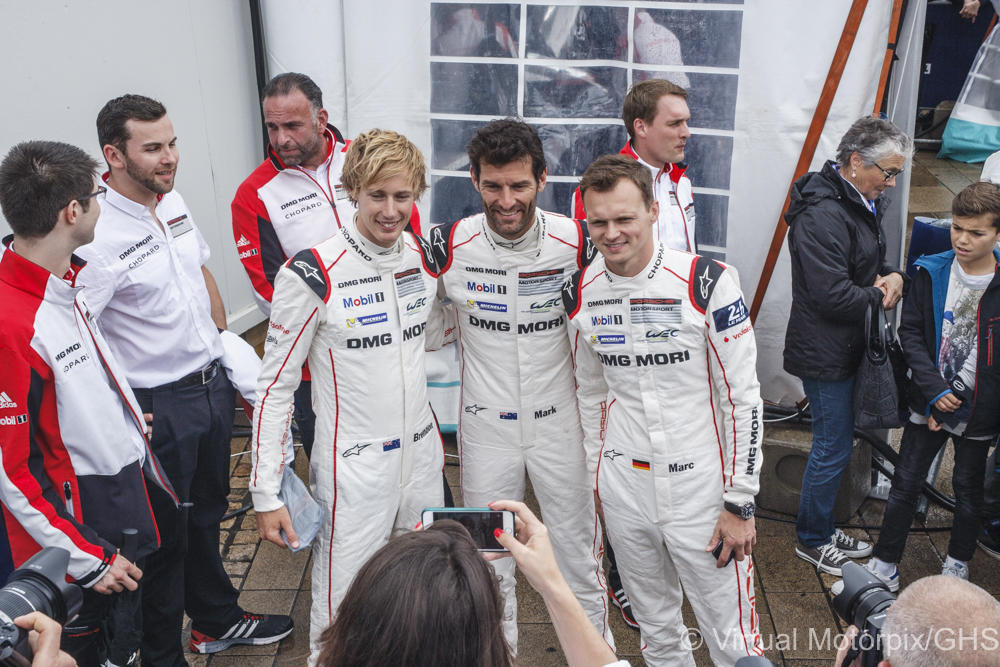 Brendon Hartley and Mark Webber (car #1) and Marc Lieb (car #2) at scrutineering on Sunday 12 June 2016 ahead of this year's Le Mans 24-Hour race