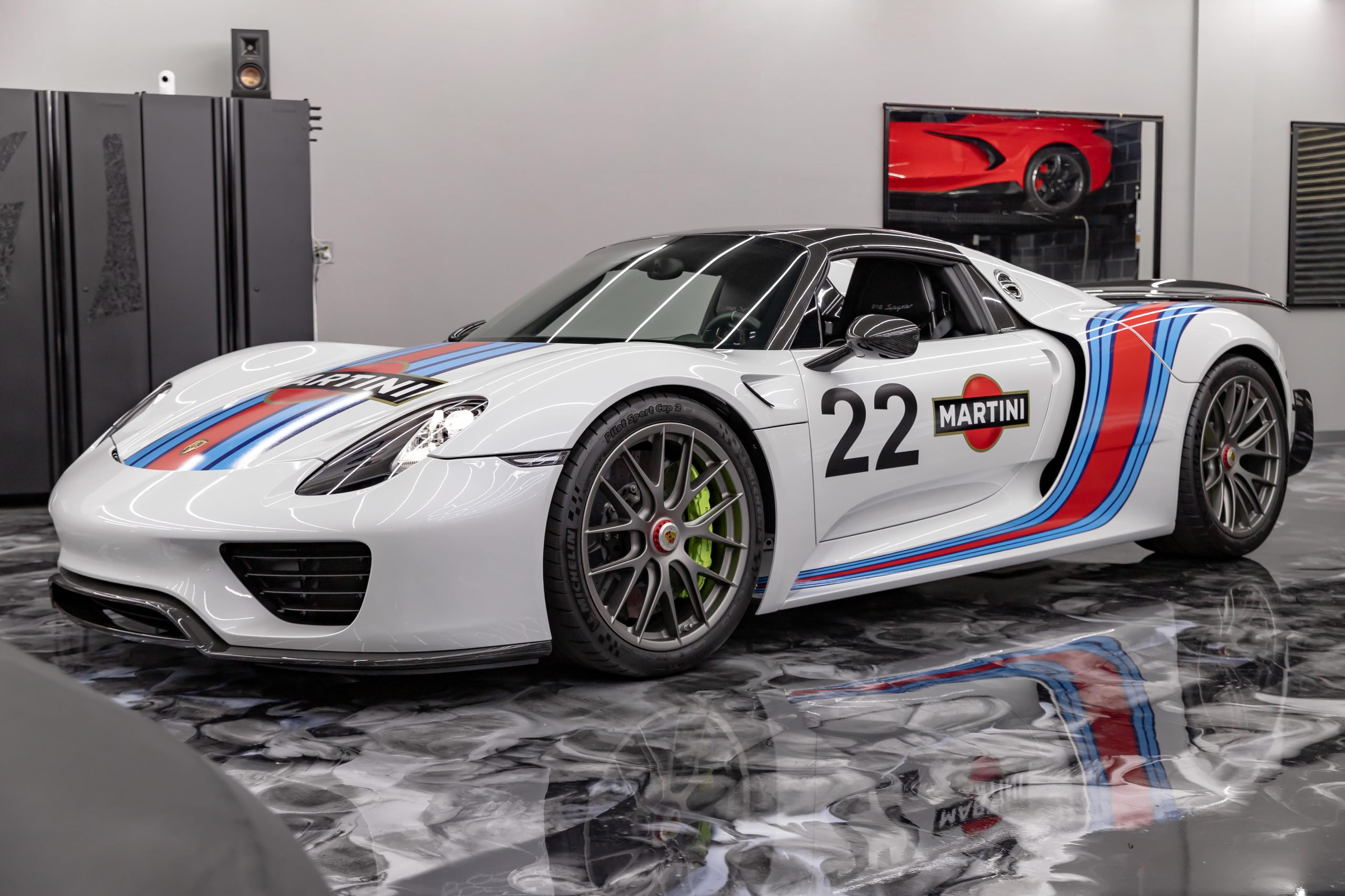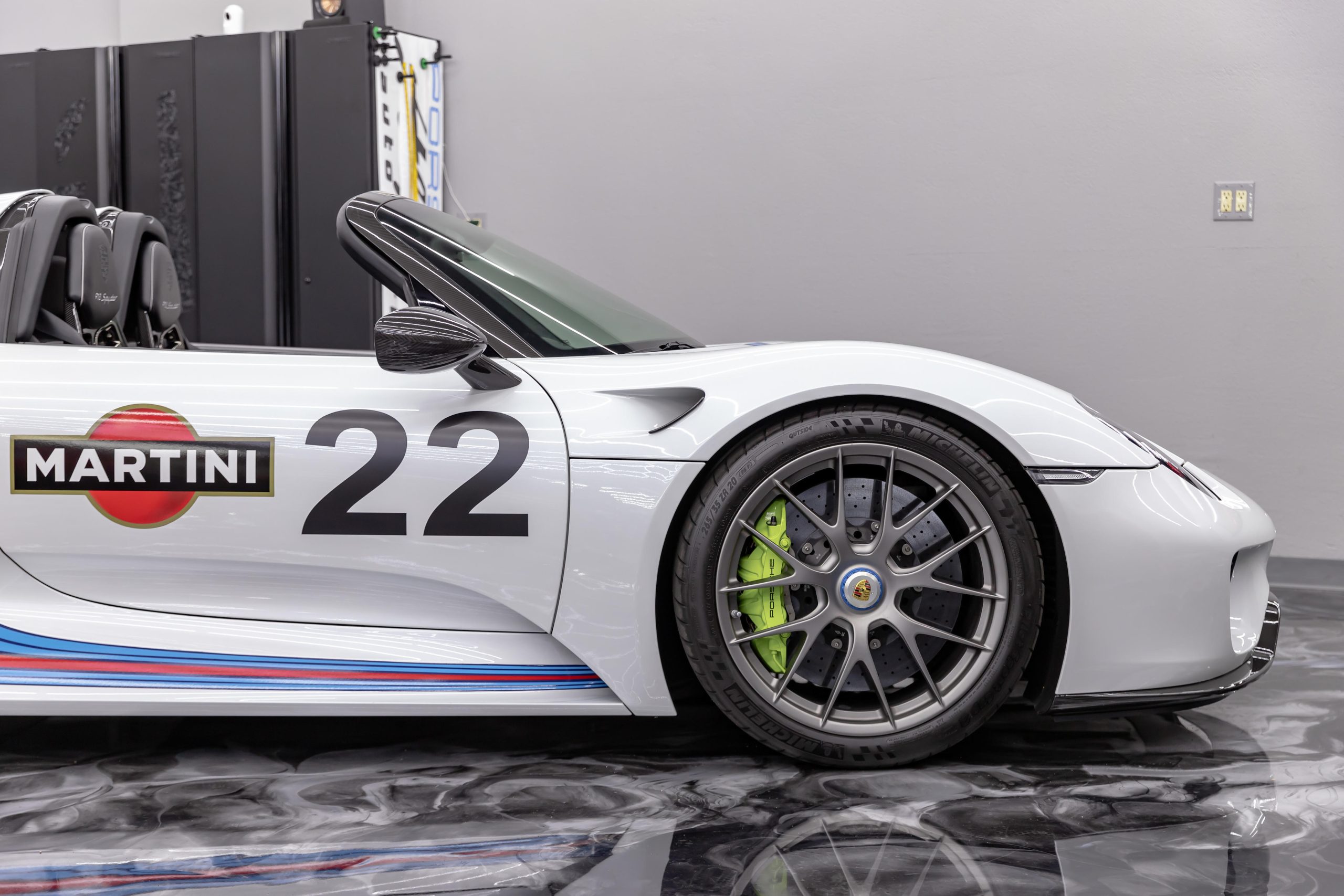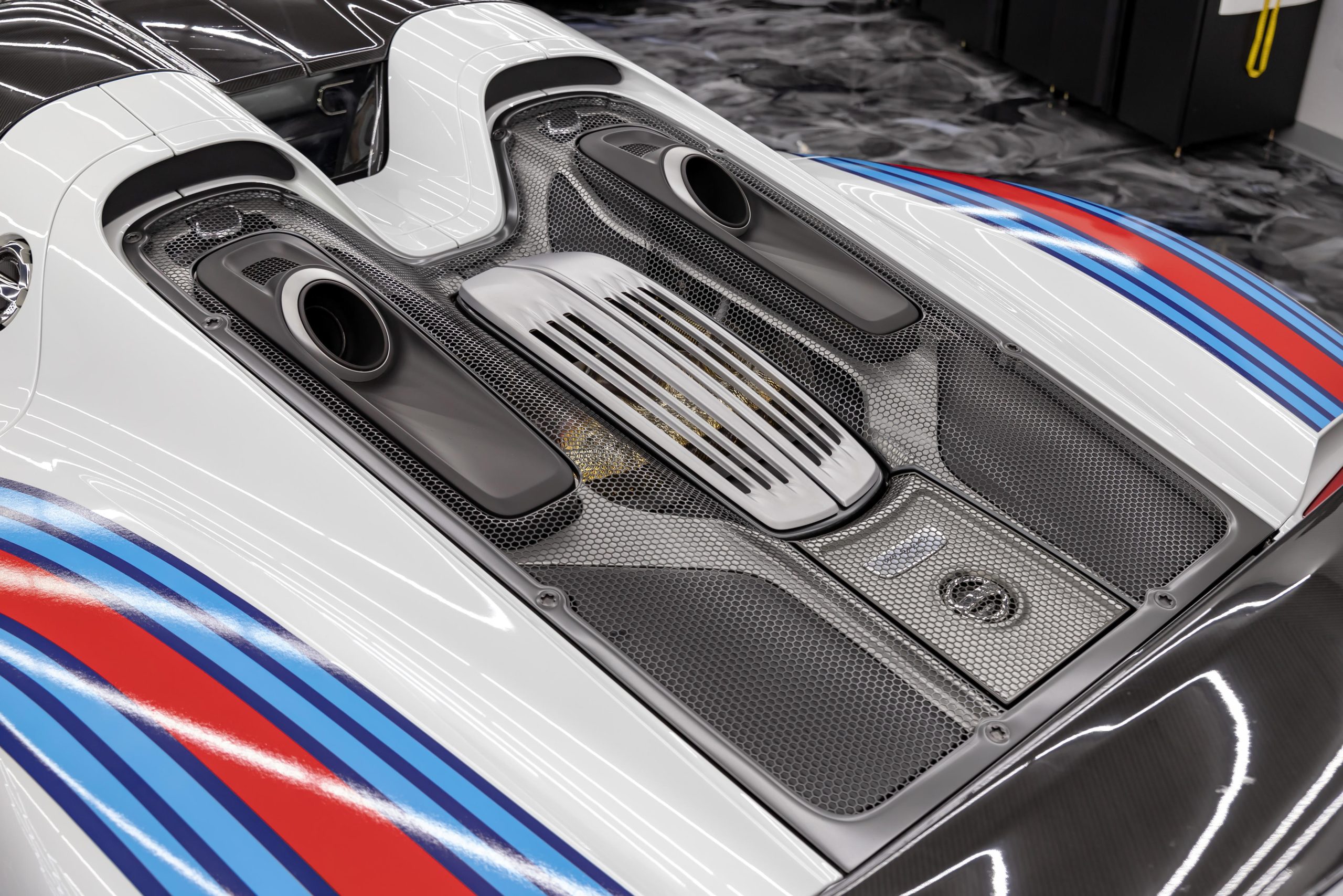 The 2015 918 Spyder offered here, delivered new to the USA, is a stunning example finished in Paint to Sample Oryx White with factory-applied Martini stripes and equipped with the desirable Weissach Package. This package includes lightweight magnesium wheels, carbon fiber components, and special interior trim, reducing the car’s weight by 100 pounds.