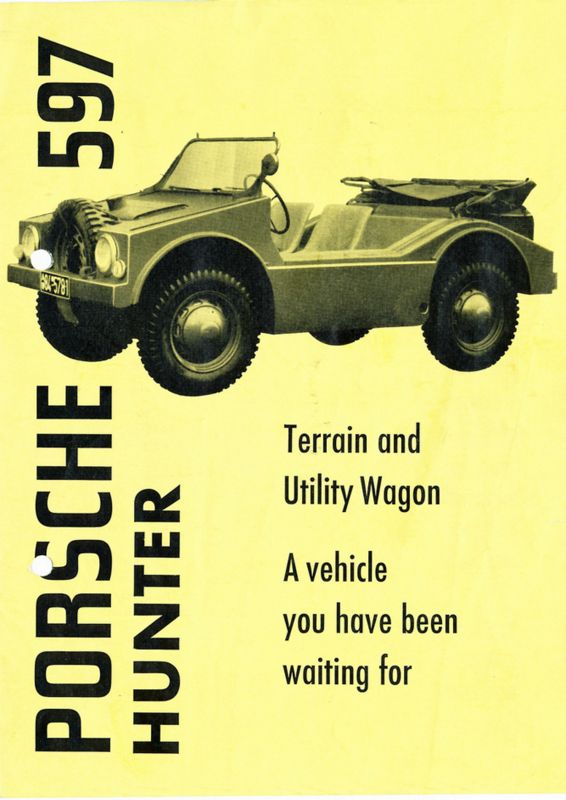 After Porsche decided to participate in a state tender for a light military vehicle, a complete car was engineered and built in small series, but the tender was not won by Porsche. The Porsche type 597 off-roader had a rear-mounted 356 engine, 4-wheel-drive and a special transmission with low gear. The car is able to climb steep grades up to 33 degrees. The type 597 was designed to be amphibious, that is the reason for its high barriers for entering the car.