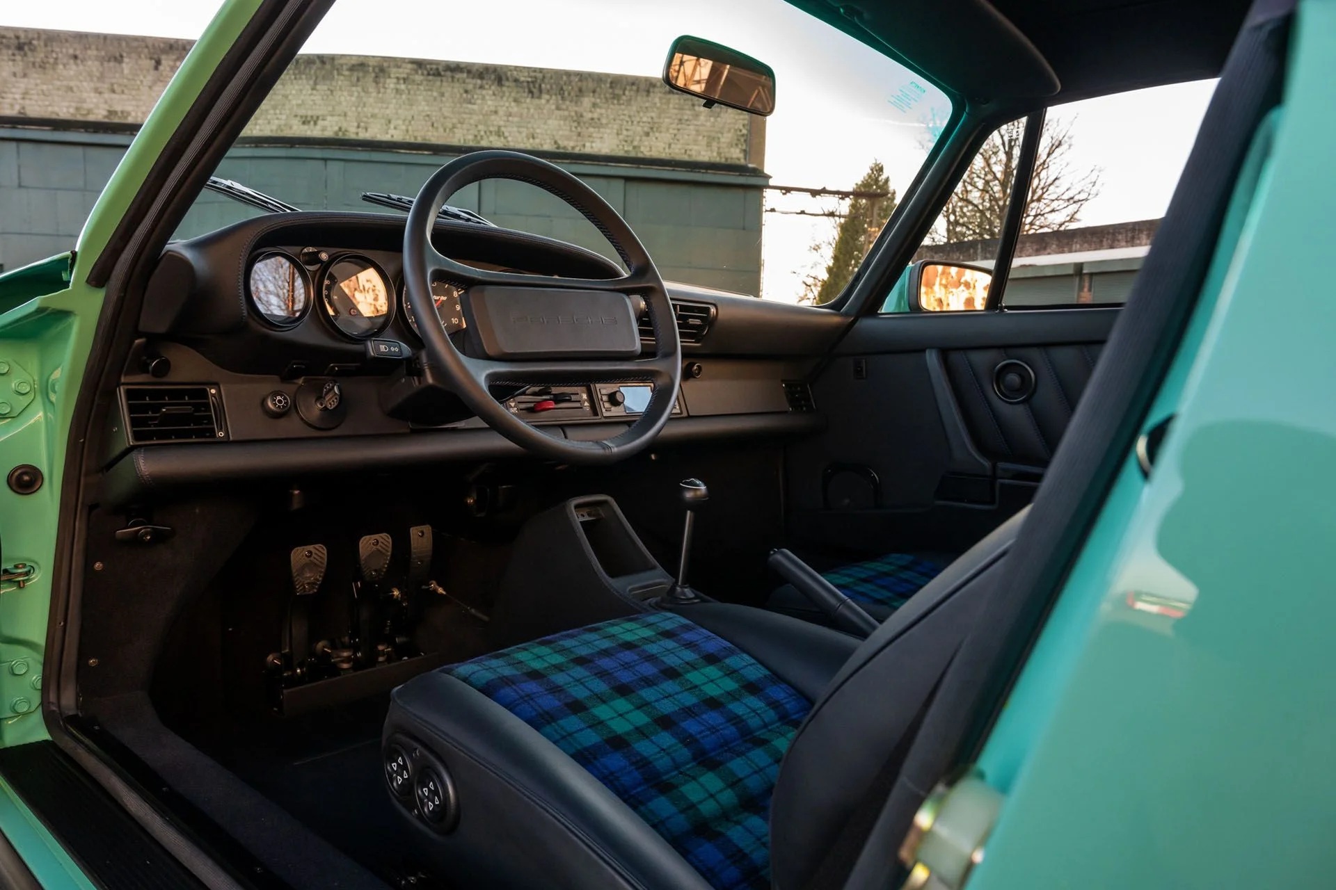 This remarkable Porsche features cutting-edge engineering, including carbon fiber body panels, ceramic brakes, coil-over suspension, and lightweight alloy door skins. The car is finished in stunning Mintgrün (Mint Green) over a Black leather interior with Blue/Green tartan cloth seat inserts.