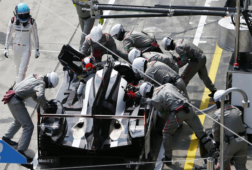 After #1 Porsche crashed, #2 Porsche took the lead. Then, #7 Audi took the lead. After 161 laps the 919 #2, that was again temporarily leading, came in for fuel and had only the tyres on the left side changed to save time. When the hunt for the #7 Audi was in full swing, a lap later Porsche #2 had to pit again because of a puncture on the front right.
