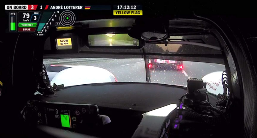 At about midnight, both MGU-troubled cars “meet” on the live results list at approximately 30th position, just that Porsche #2 is moving up, but Toyota #8 is still in the garage for repairs and is dropping in the list. A second shock is coming to the Toyota team around quarter to one in the night – the leading Toyota #7 is having a clutch problem and is moving on the track only at 60 km/h with electric power. Unfortunately, the battery died and the car could not get back to the pits. The leader was out. It is said that there was a contributing factor to the clutch failure at the pit lane exit – when #7 Toyota waited for the pit exit to open during the safety car period and an LMP2 driver Vincent Capillaire from the closest pit box ran to the car in his orange suit (marshals also wear orange) giving a thumbs up to support Kobayashi and the latter understanding it was a marshal showing he should go despite the red light at the pit exit. Kobayashi quickly started off with the internal combustion engine while moving off is usually done with electric power only. The fragile clutch got harmed.