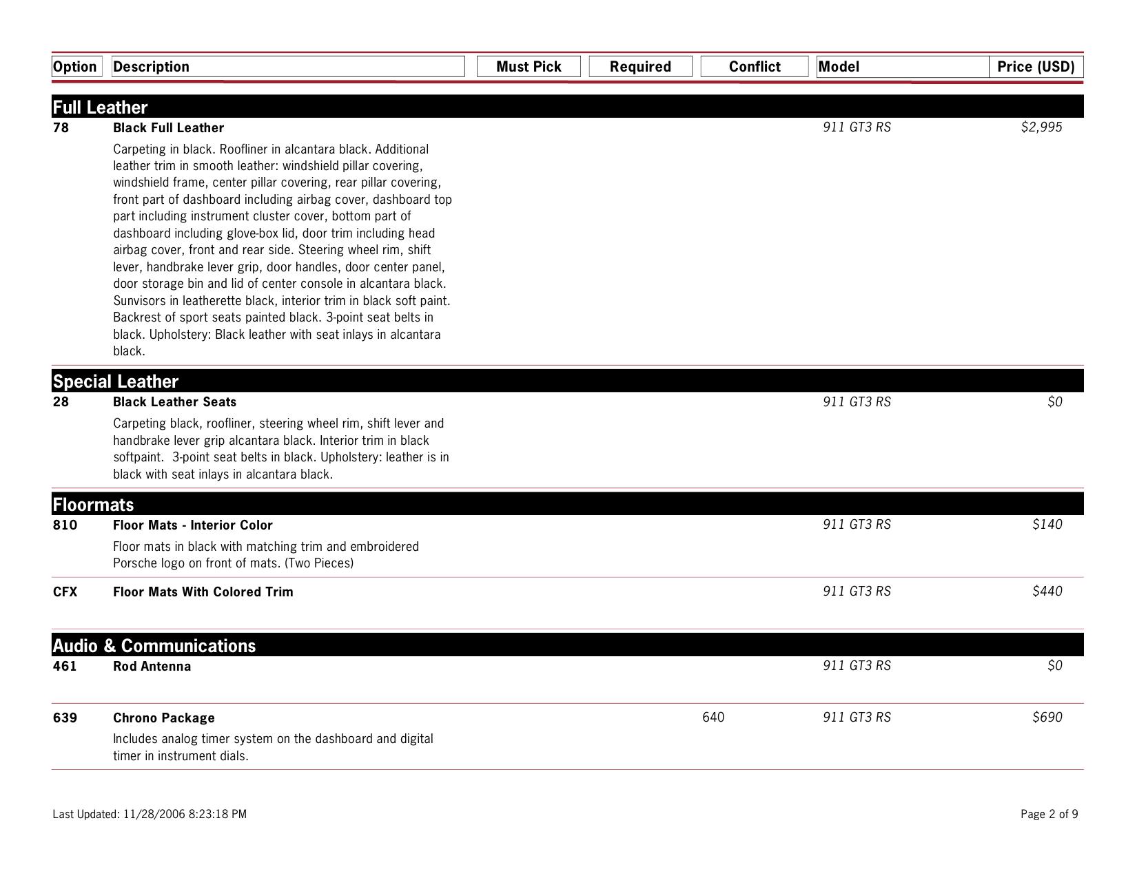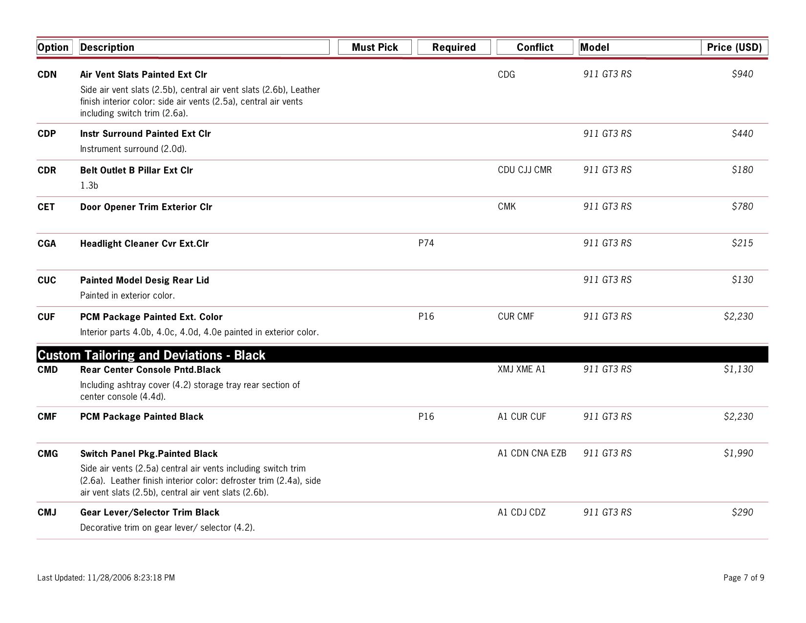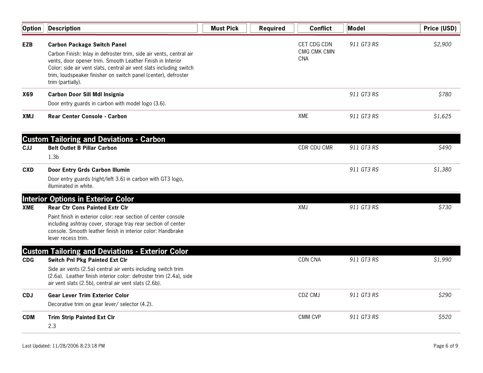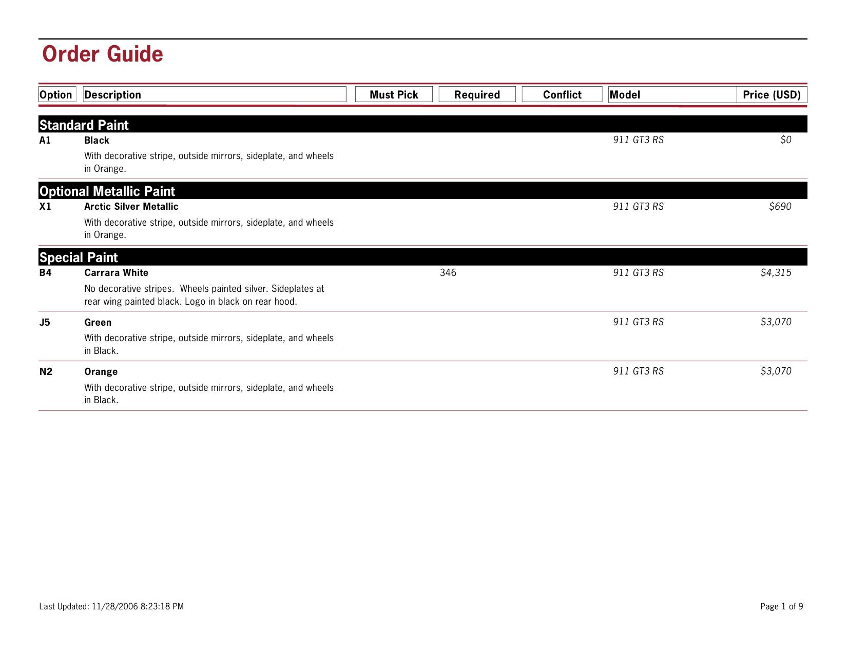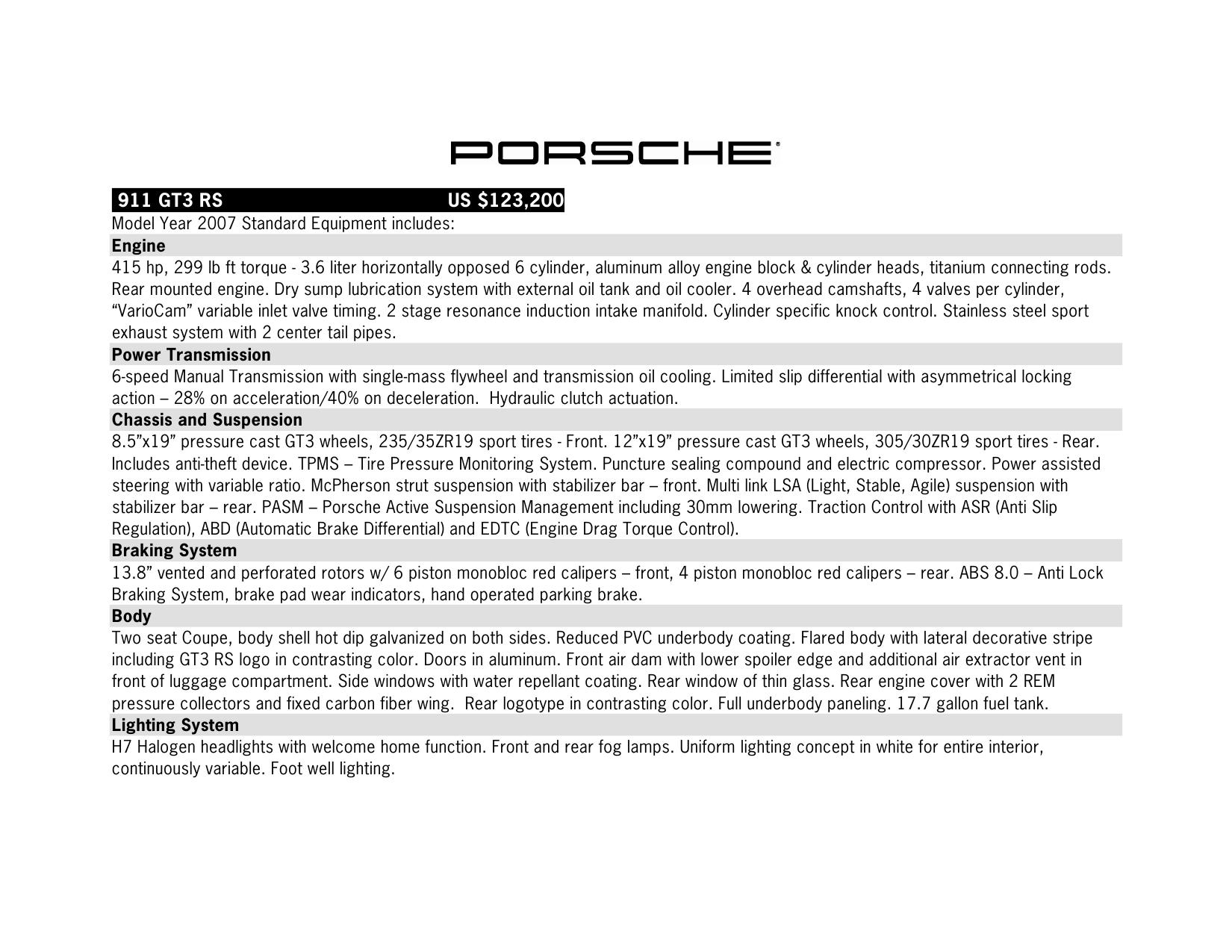 Porsche 997 GT3 RS Mk I, US Market, 2007MY: Order Guide