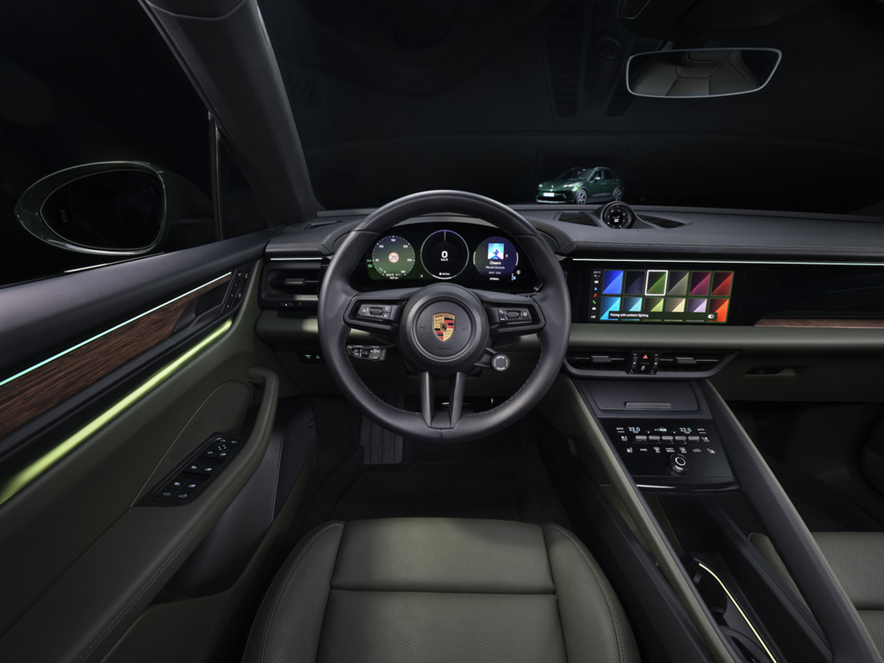 With the electrification of the Macan, Porsche has introduced a completely new display and control system into its successful SUV model. The Porsche Driver Experience offers a mix of digital and analog elements. These include an instrument cluster with a 12.6-inch curved display, a 10.9-inch passenger display, a head-up display with augmented reality technology, and ambient lighting with interior communication light. The design of the screens for all Macan models comprises a welcome animation, an updated state-of-the-art look, and the new Themes app, which can be used to adjust the background color of the displays and the ambient lighting to match the exterior color, with twelve colors to choose from.