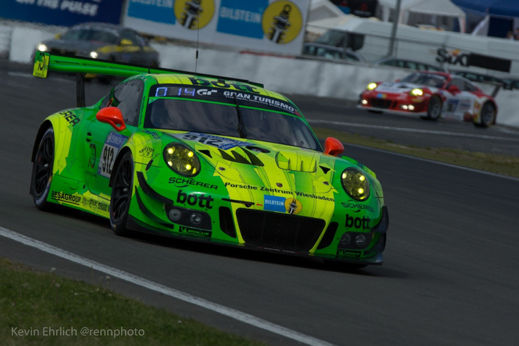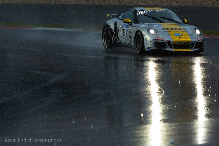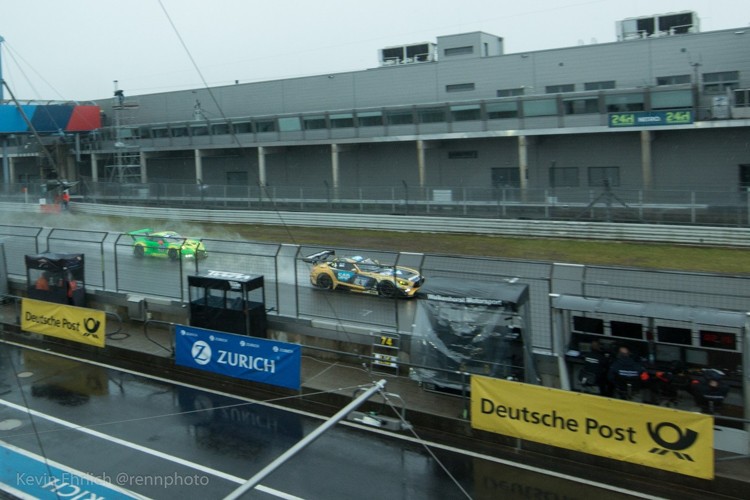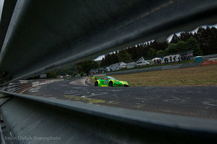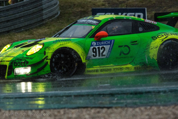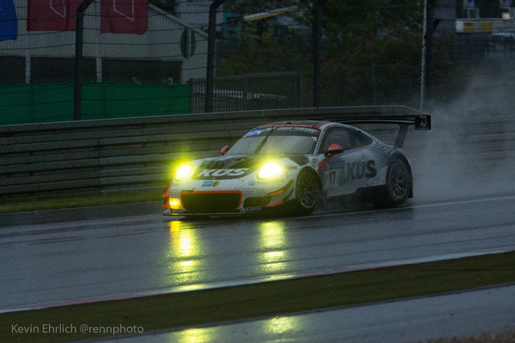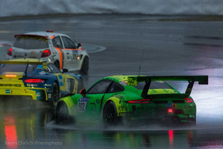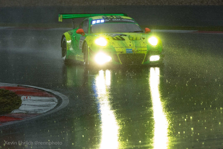 The #911 Manthey Porsche sprinted out to the lead immediately after the start, accumulating a 10 second lead after only two laps of running. It maintained the lead in dominant fashion for over 10 hours before Ringmeister Romain Dumas found oil on the right side of the track towards the end of the Pflanzgarten section amidst the darkness. The resulting loss of traction put the #911 Porsche into the barriers and out of the race. Not only did the accident end the race for the #911, the wet weather started to move in minutes afterward with exactly 13 hours remaining.