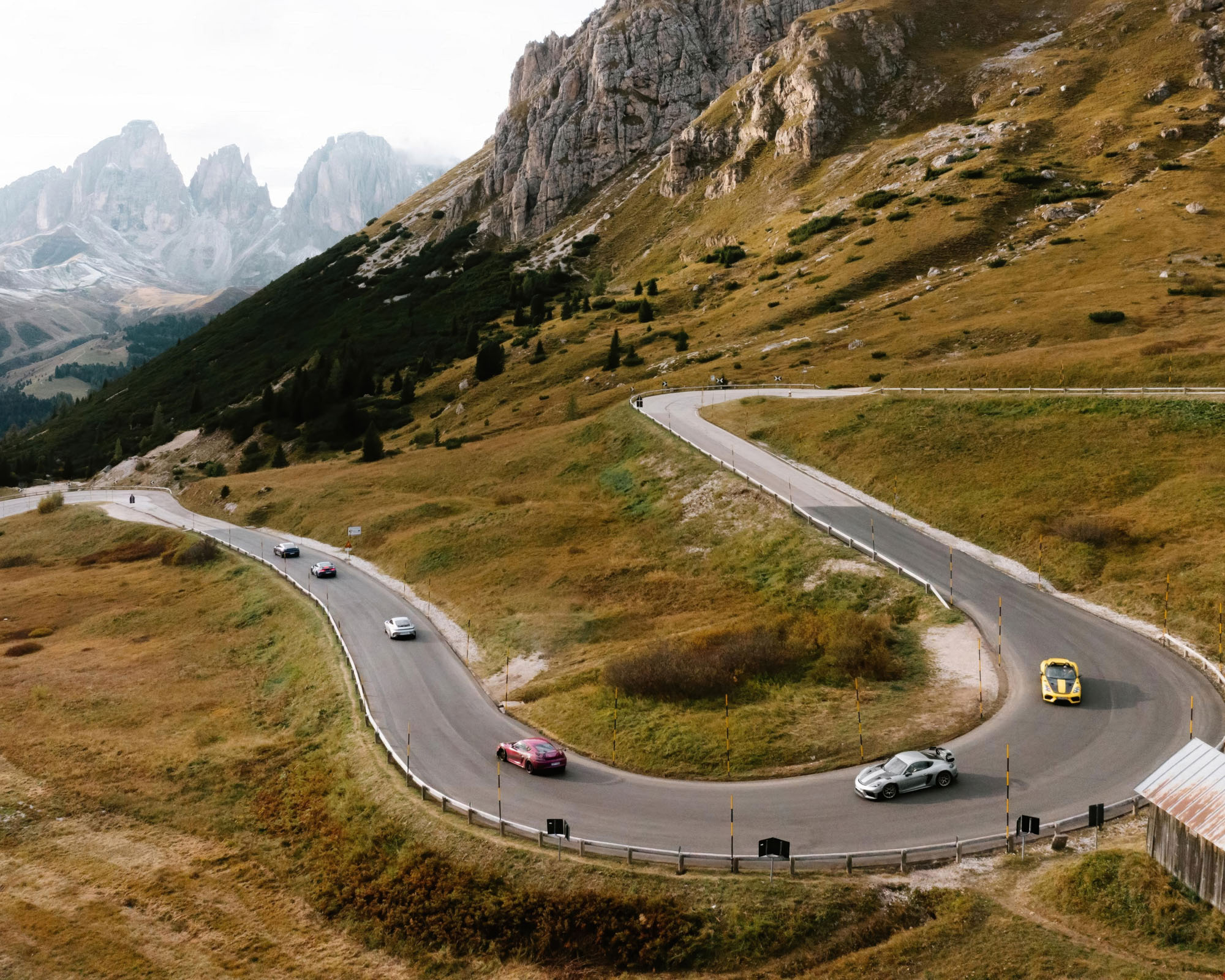 Around 290 kilometers, five hours of pure driving time – Day 2 is a celebration for lovers of demanding curves. On this tour, a Porsche shows its strengths more than ever. From Bolzano, the route heads east towards the towering peaks of the Dolomites. The landscape impresses with rugged rock faces and monumental summits, the route strings together pass after pass: Niger Pass, Karer Pass, Passo Rolle, Passo Cereda, Passo Duran, Passo Pordoi, Passo Sella – resonant names that are music to the ears of connoisseurs. Where the road winds decisively into the heights, the true spirit of Amore Motore reveals itself: temperament, passion, endorphins. Every kilometer is a dialogue between human and machine.
