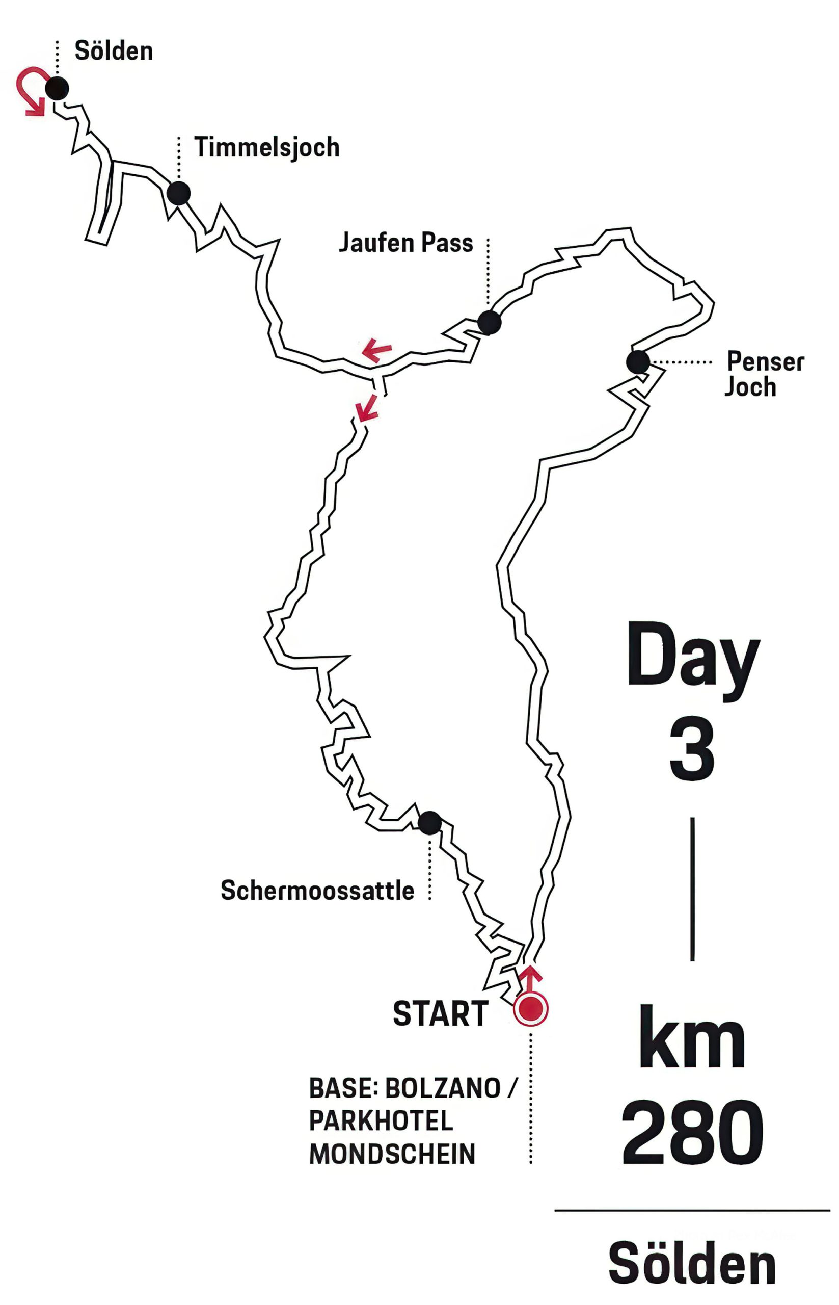 The final day – 280 kilometers and around five hours of pure Alpine magic. It’s time for a curve hunt: the route leads northwards over the Penser Joch, past quiet valleys, towards Austria. The Jaufen Pass offers sweeping curves before the Timmelsjoch, the “secret queen of Alpine roads”, opens up views of an endless sea of peaks. The panoramas differ from those of the previous day – here everything is more open and expansive.