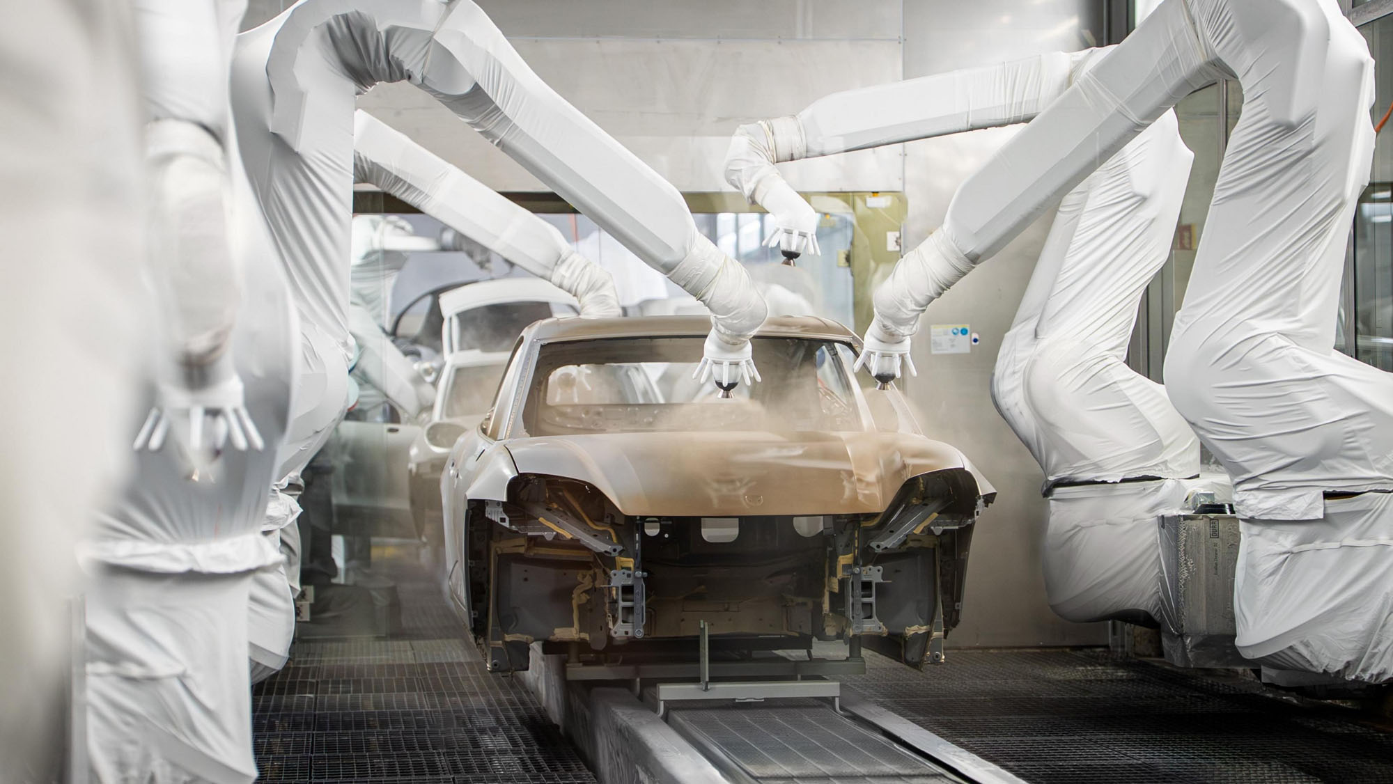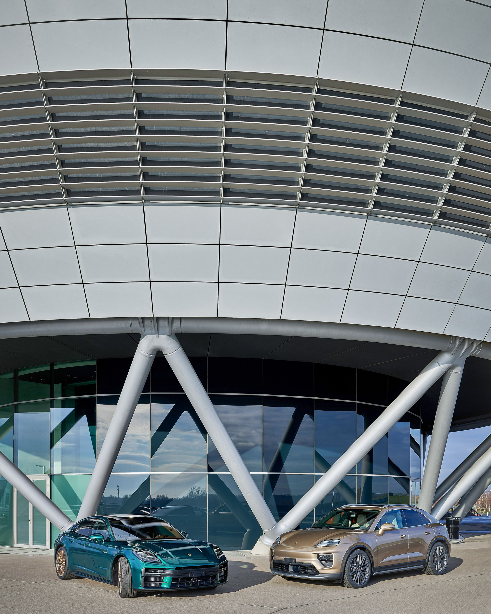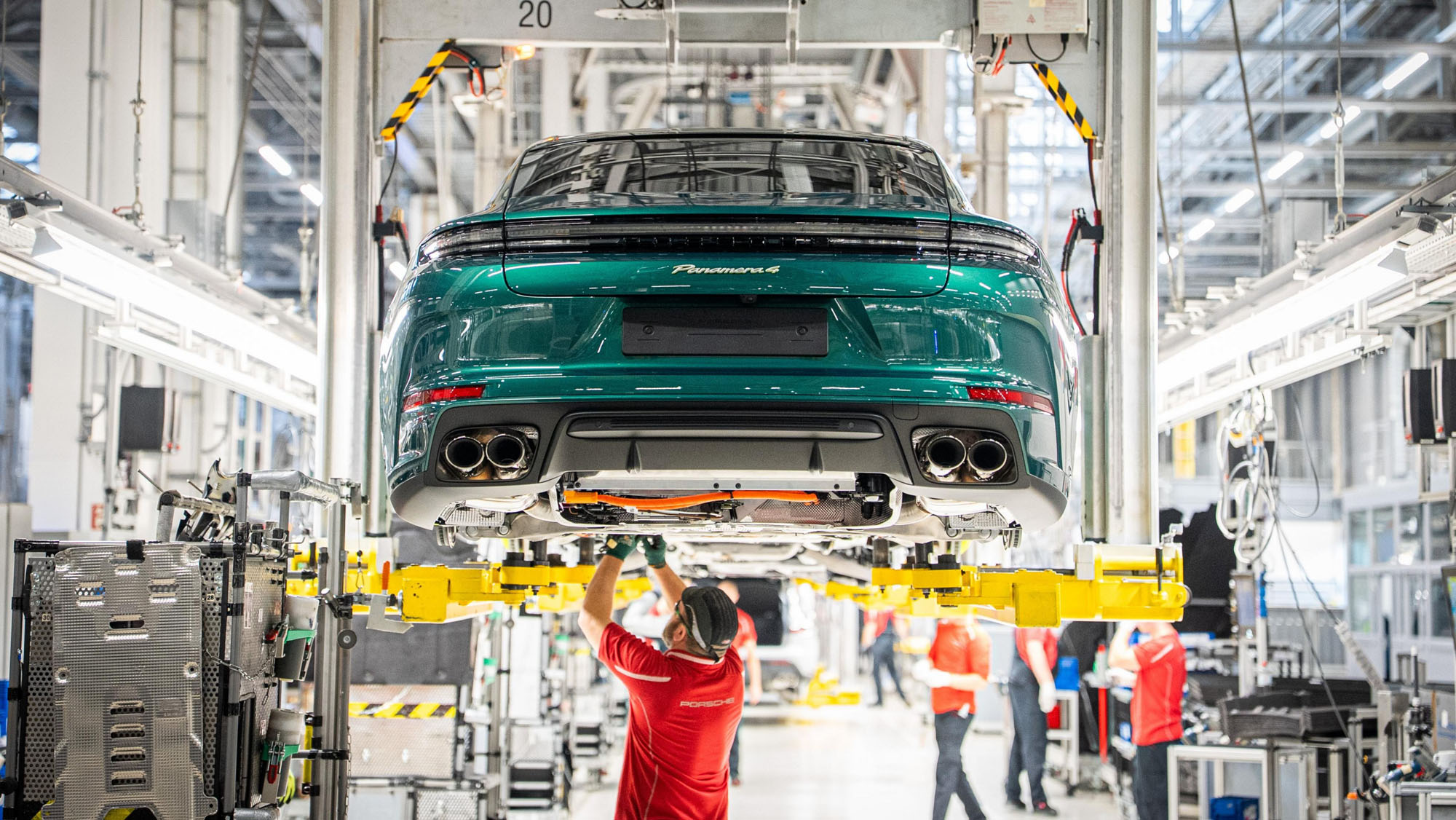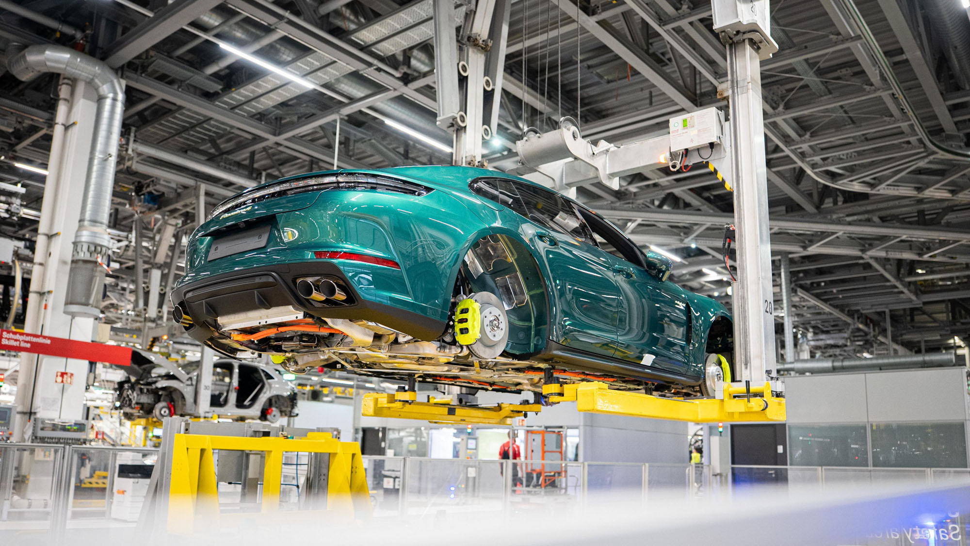 Lean, digitally connected, and highly automated processes allow Leipzig to build vehicles with precision while accommodating customer‑specific requirements for markets around the world. In the body shop, aluminum, steel, and other materials are clinched, welded, and riveted to create a structure that is both lightweight and rigid. The paint shop adds color – for the anniversary vehicles, Gold-bronze as Paint-to-Sample for the Macan, and the special color Emerald-green for the Panamera. In assembly, both models are prepared for their “marriage” – the moment body and powertrain are joined.