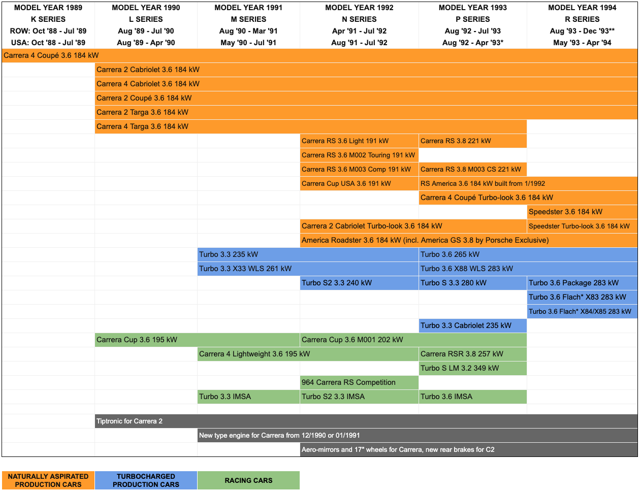 This graphic breaks out the Type 964 Porsche 911 in terms of timelines and how to tell all the models apart. Click on the image to see it in higher definition. There were quite a few regular model cars and plethora of special editions over the years.