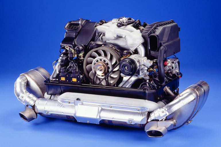An evolution of Mezger’s 964 engine, the 3.6 liter sported twin turbos, intercoolers, and catalytic converters.