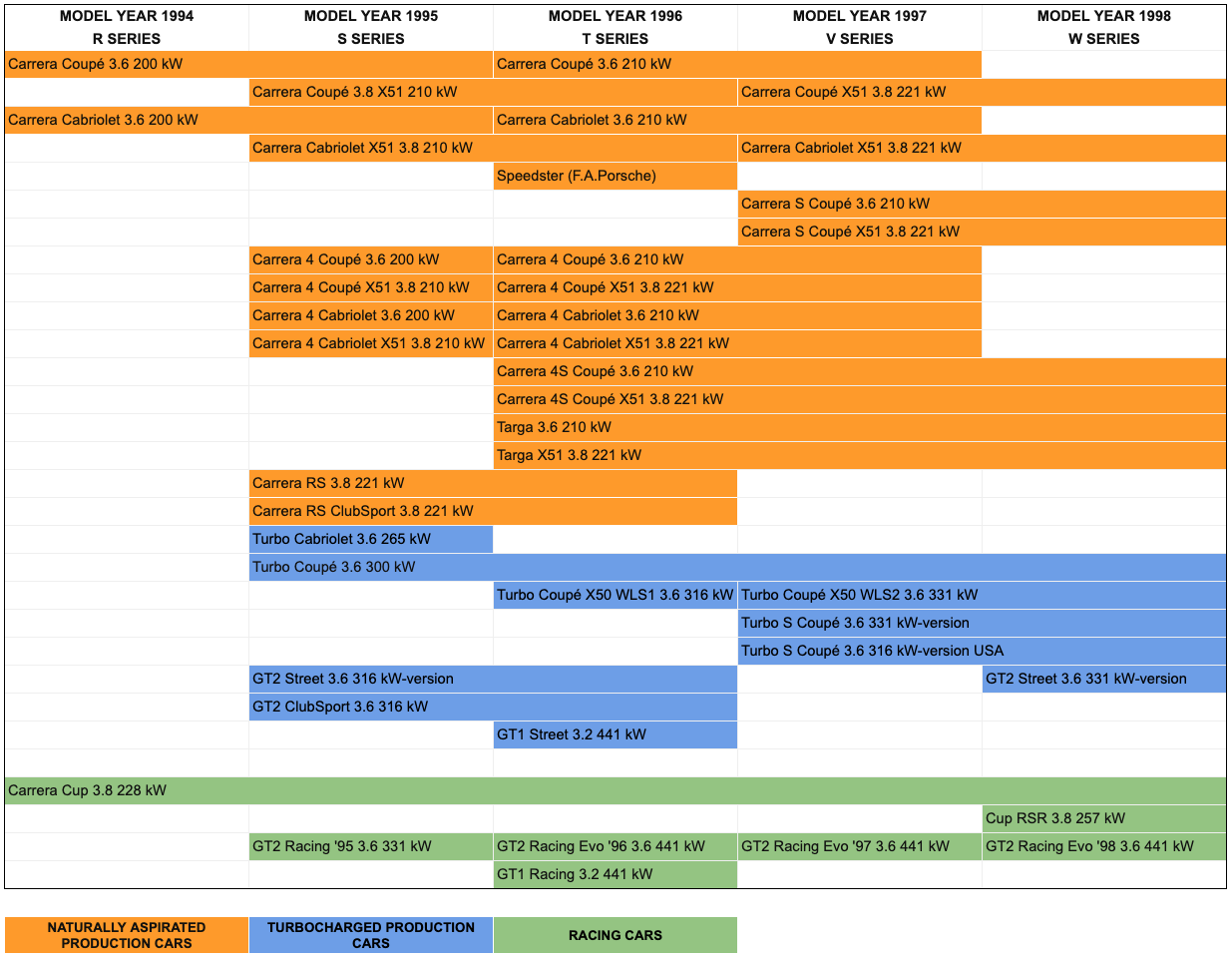 This graphic breaks out the Type 993 in terms of timelines and how to tell all the models apart. Click on the image to see it in higher definition. There were quite a few regular model cars and plethora of special editions over the years. In 1994 we saw the 80% new Type 993 Carrera (rear wheel drive only) launch with a 272bhp, 3.6-litre, air cooled, flat-6 engine with 6-speed manual gearbox. The Cabriolet version followed soon afterwards. In 1995 we saw the Carrera 4 (all wheel drive) released, the new Carrera option is a 4-speed Tiptronic automatic gearbox. From Feb 1995, the Carrera RS with 300bhp 3.8-litre engine arrives and it is really special. That same year, Porsche gave us the 911 Turbo (993) with a 408 bhp twin turbo 3.6-litre engine. There is even something more special that year in the form of the 430 bhp 993 GT2 limited edition (we see the GT2 again in 1997 and 1998, now with 450 hp). In 1996, the 3.6-litre Carreras all get an engine upgrade, now uprated to 285 bhp and featuring Varioram inlet ducting. We get a new 911 Targa model, introduced with panoramic glass sliding roof. The Carrera 4S features Carrera engine in Turbo bodyshell (including suspension and brakes) and special trims also arrives that year. In 1997, Porsche gives is the Carrera S, which has the wide body look but without Turbo brakes and suspension. In 1998, the Carrera and 4 production are both discontinued. The Carrera S, 4S and Turbo (and including new 430 bhp Turbo S) continue to be made until mid-1998.