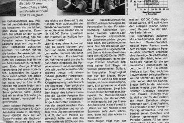 One of the most radical developments for 1971 was a single magnesium frame that was fitted to chassis 053 and raced by JWA/Martini. Painted white, this car placed first overall at Le Mans. It was driven by Helmut Marko and Gijs van Lennep to set an overall distance record. After winning LeMans twice and accomplishing their goals, Porsche had become a power in sports car racing over a three year period. The CSI abandoned Group 4 leaving the 917s to contest other series. Later versions of the 917 were prepared for CanAm and featured turbocharged engines that could produce in excess of 1100 bhp.
