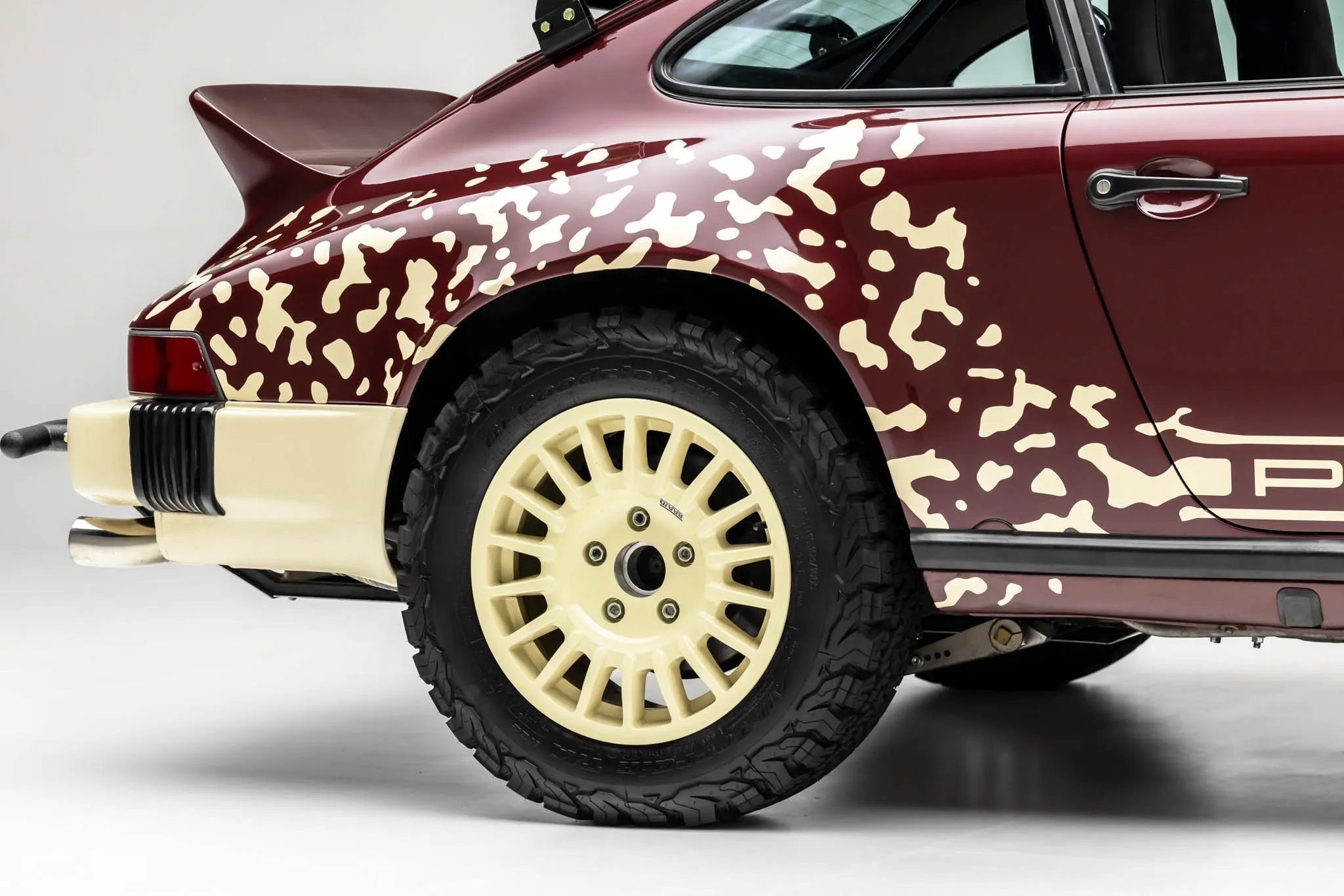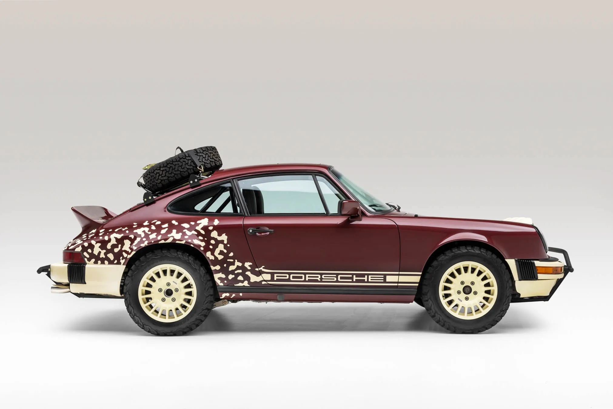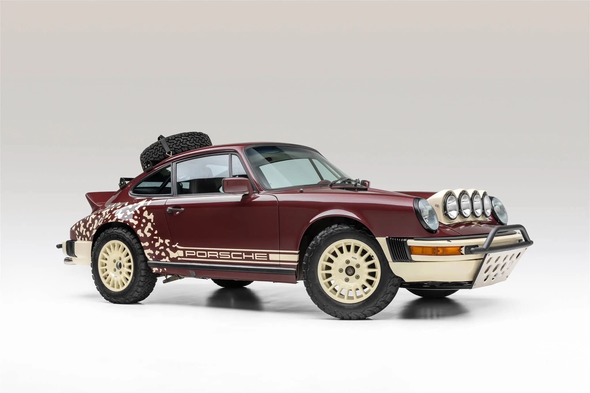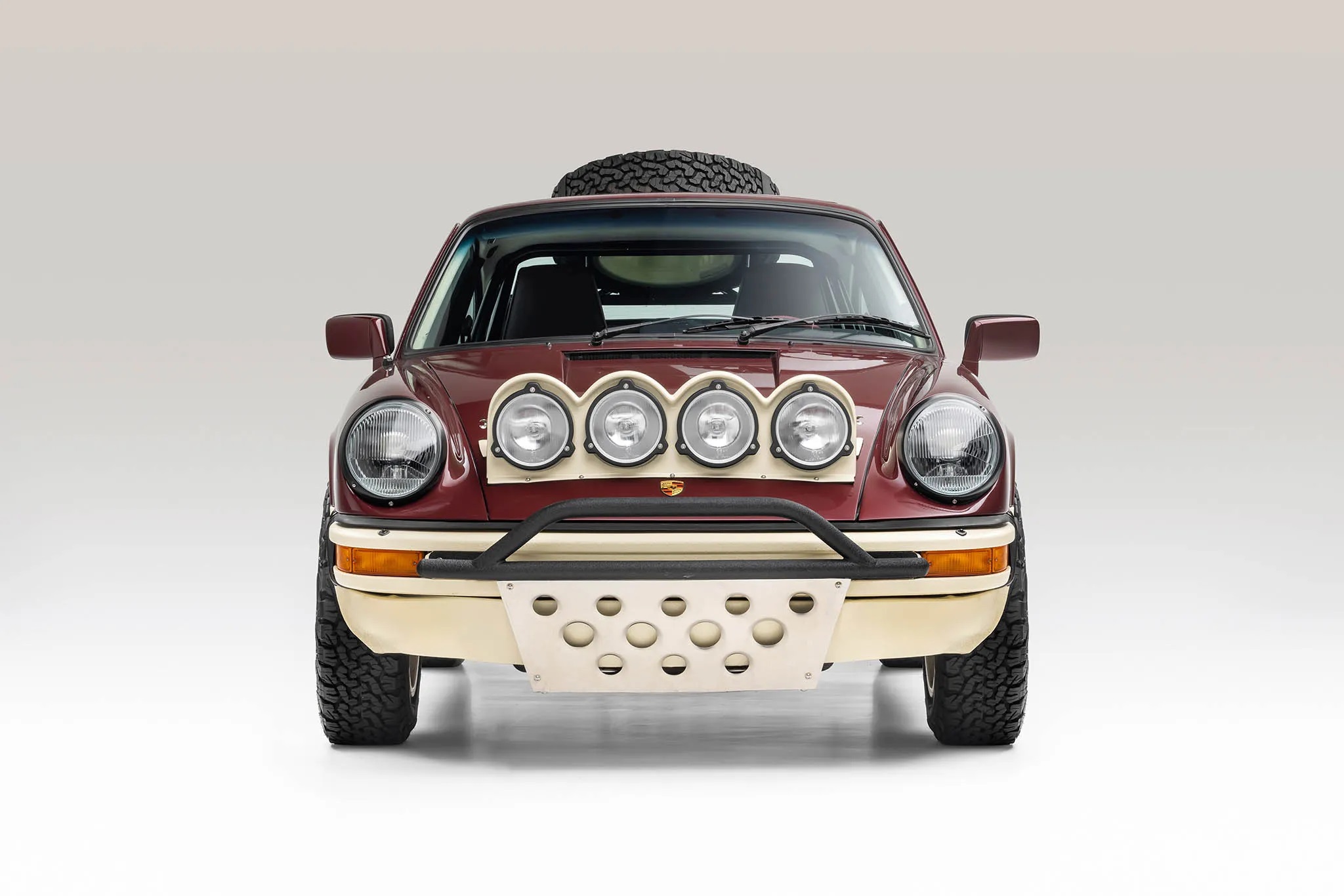 This particular 1983 Porsche 911 SC coupe has been transformed into a “Safari” style vehicle. The Ruby Red Metallic paint job with ivory accents and decals is complemented by brush guards, a ducktail spoiler, additional lighting, protective skid plates, a performance suspension upgrade, upgraded sway bars, and off-road capable wheels and tires.