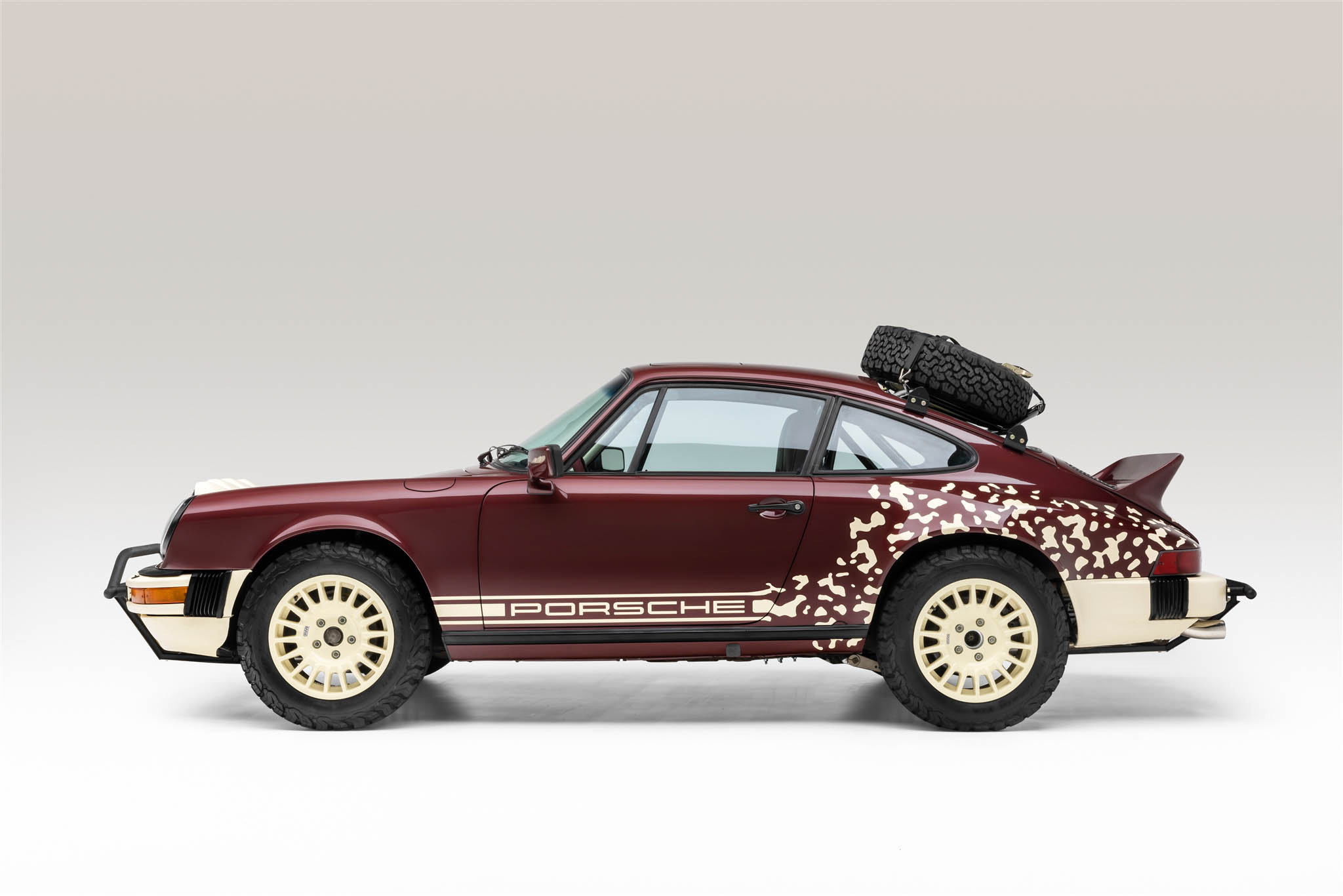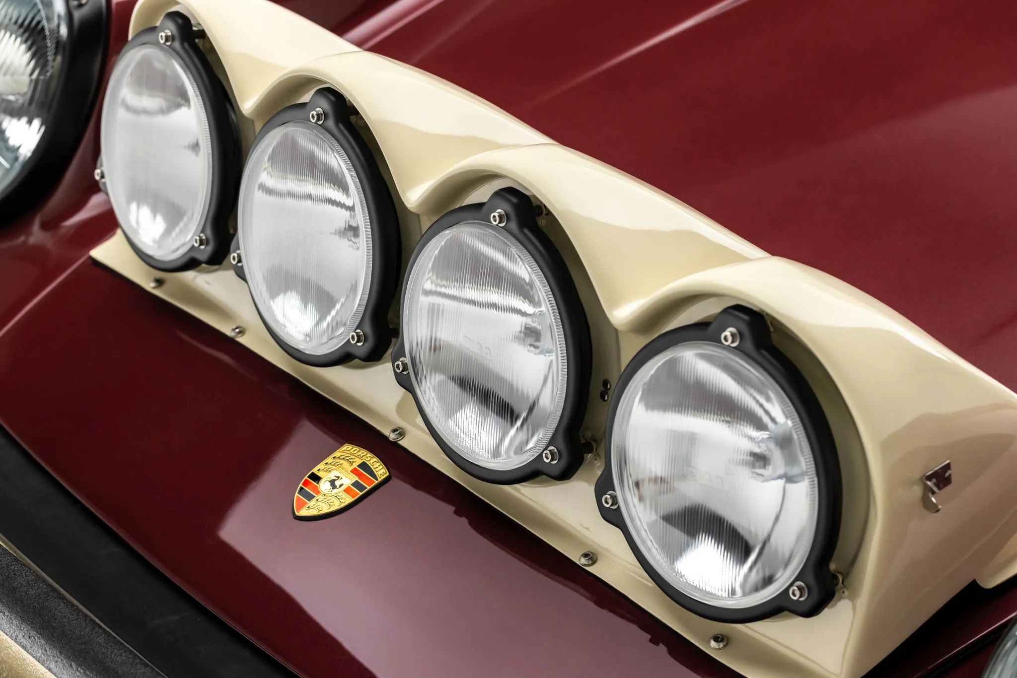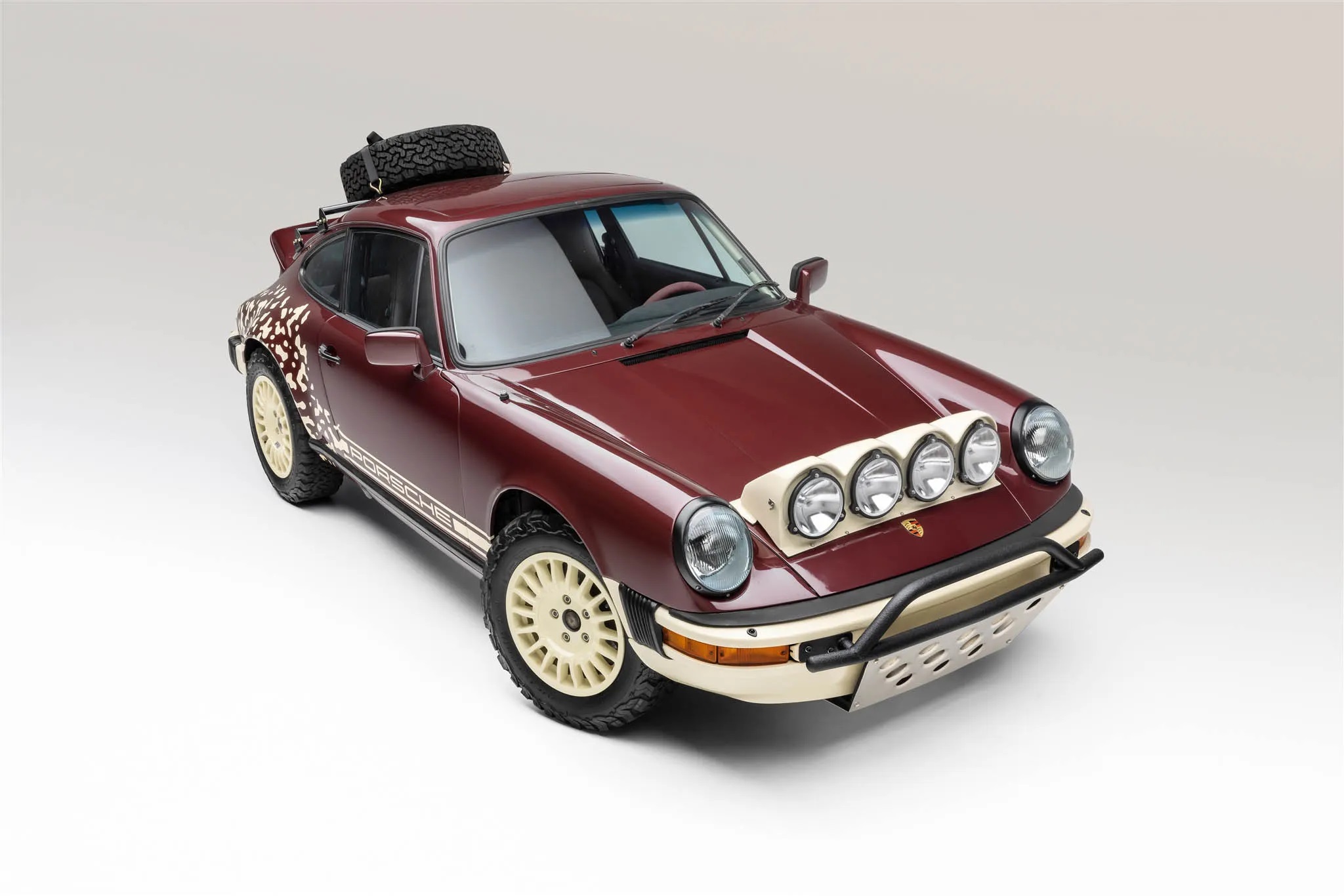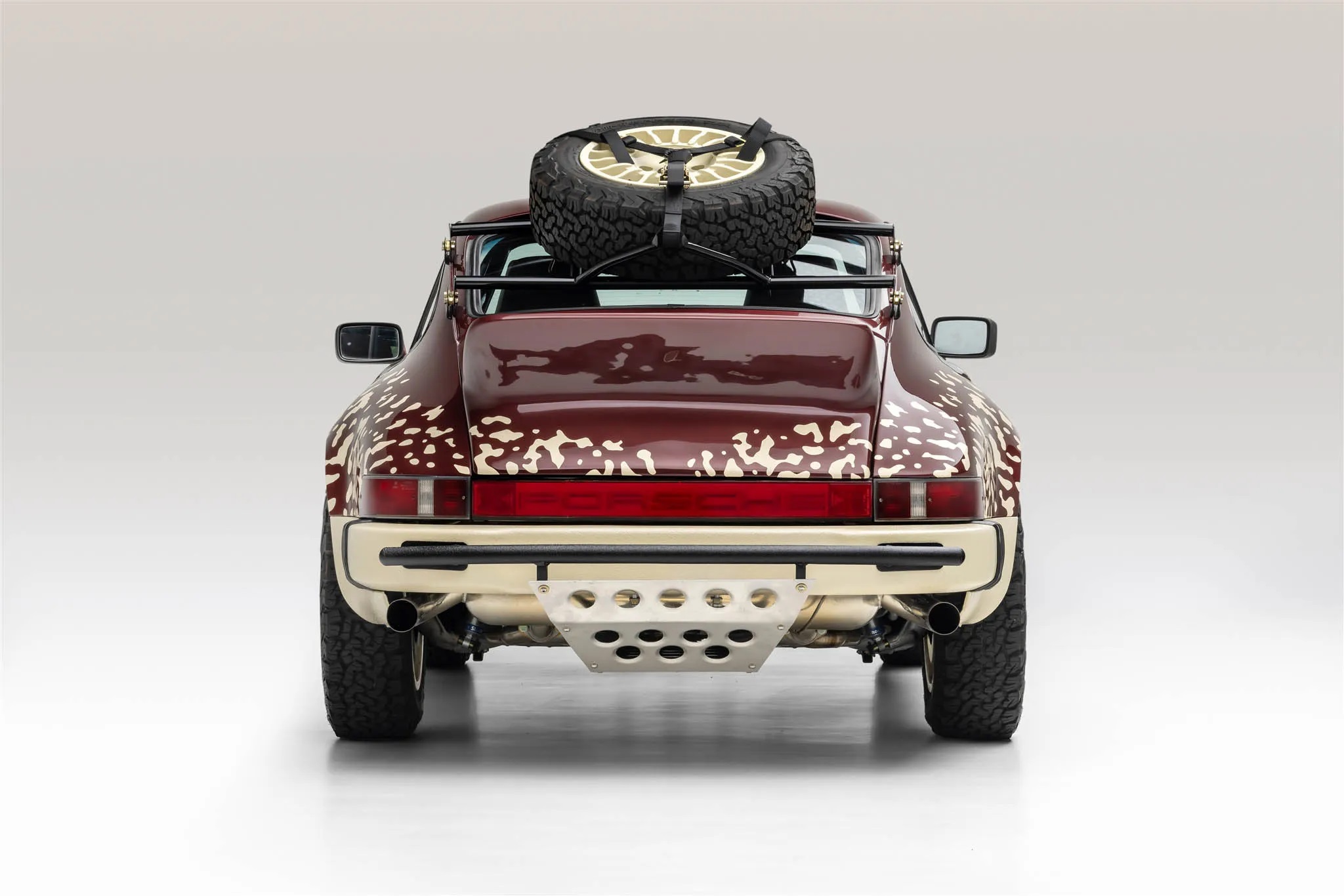 This particular 1983 Porsche 911 SC coupe has been transformed into a “Safari” style vehicle. The Ruby Red Metallic paint job with ivory accents and decals is complemented by brush guards, a ducktail spoiler, additional lighting, protective skid plates, a performance suspension upgrade, upgraded sway bars, and off-road capable wheels and tires.