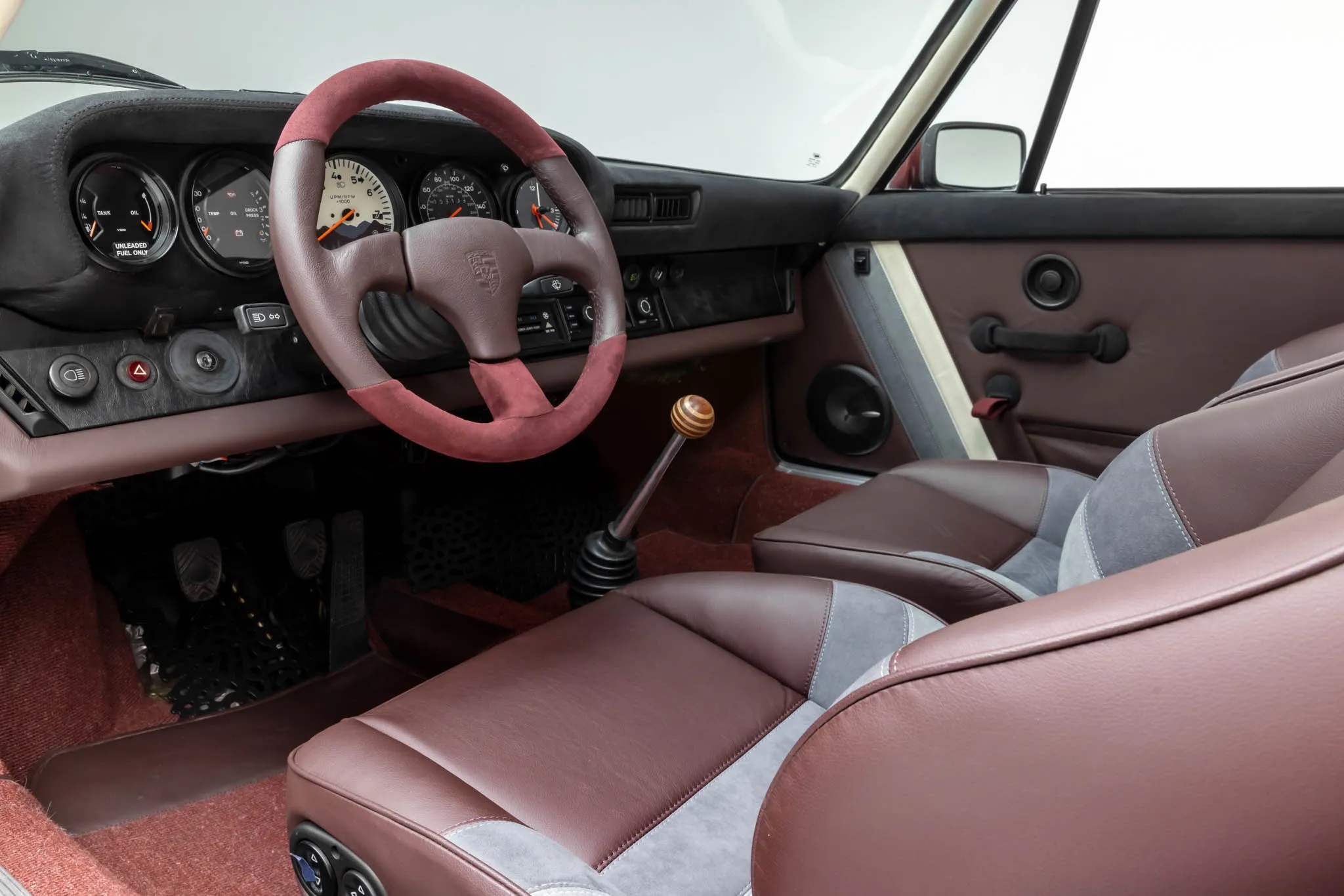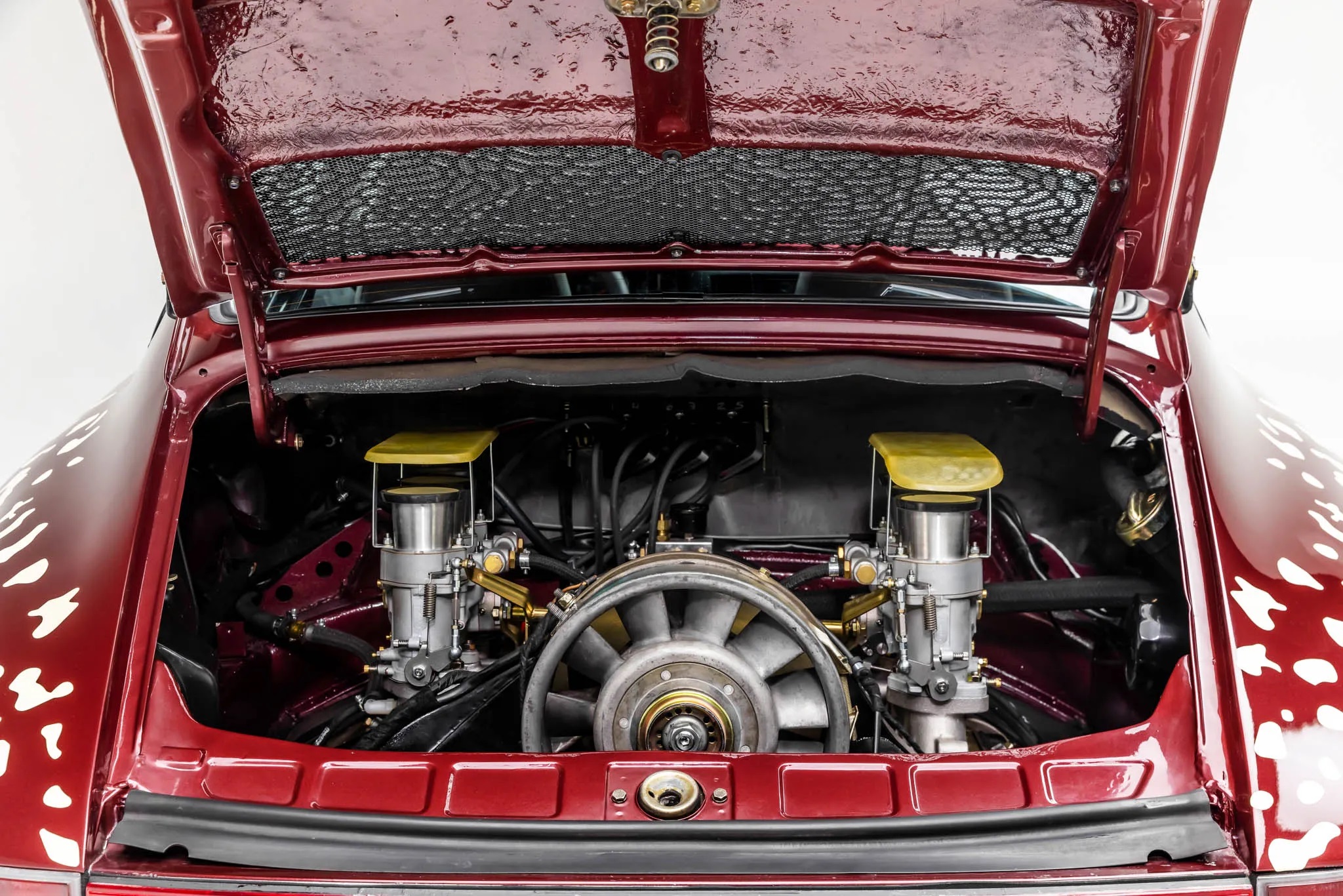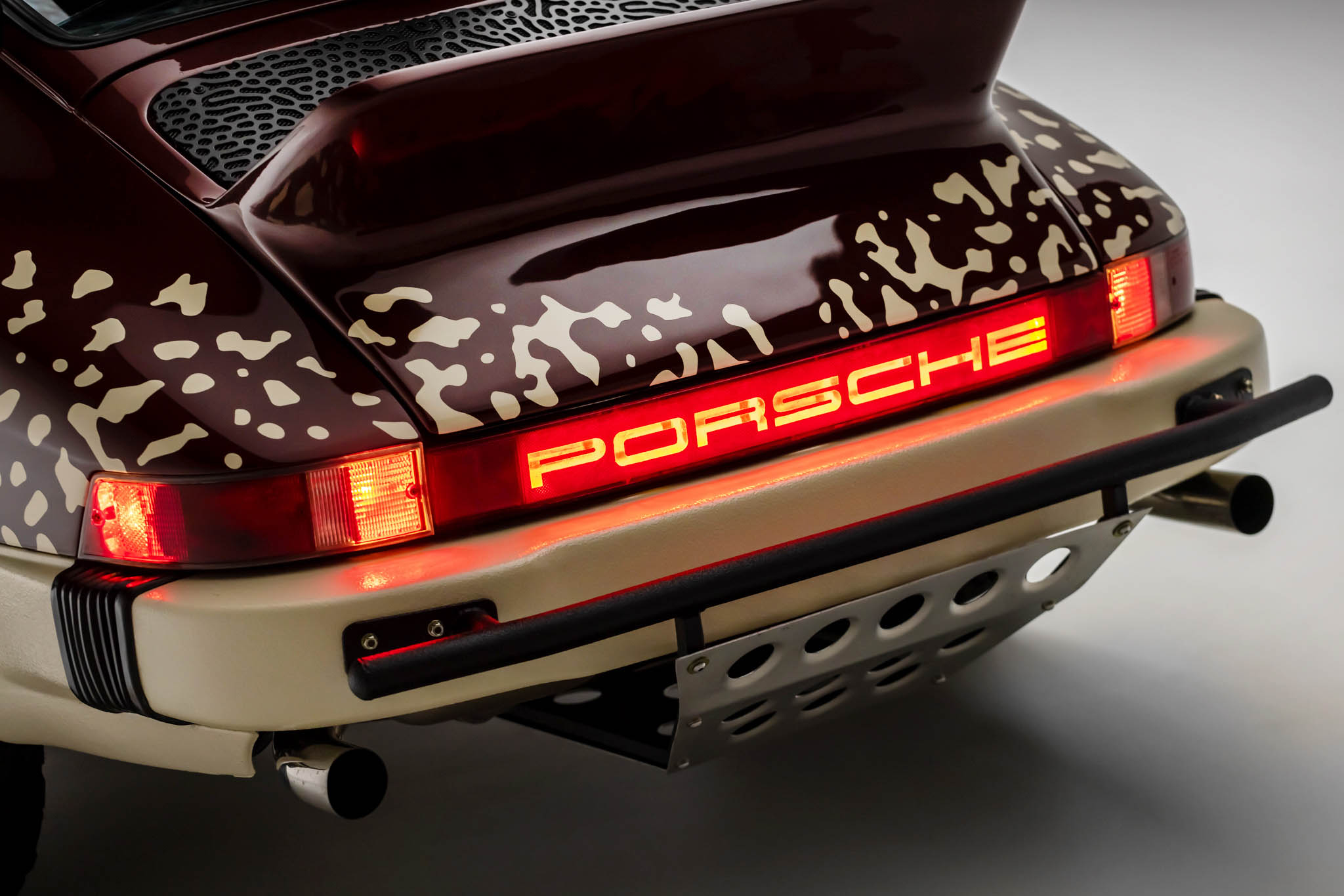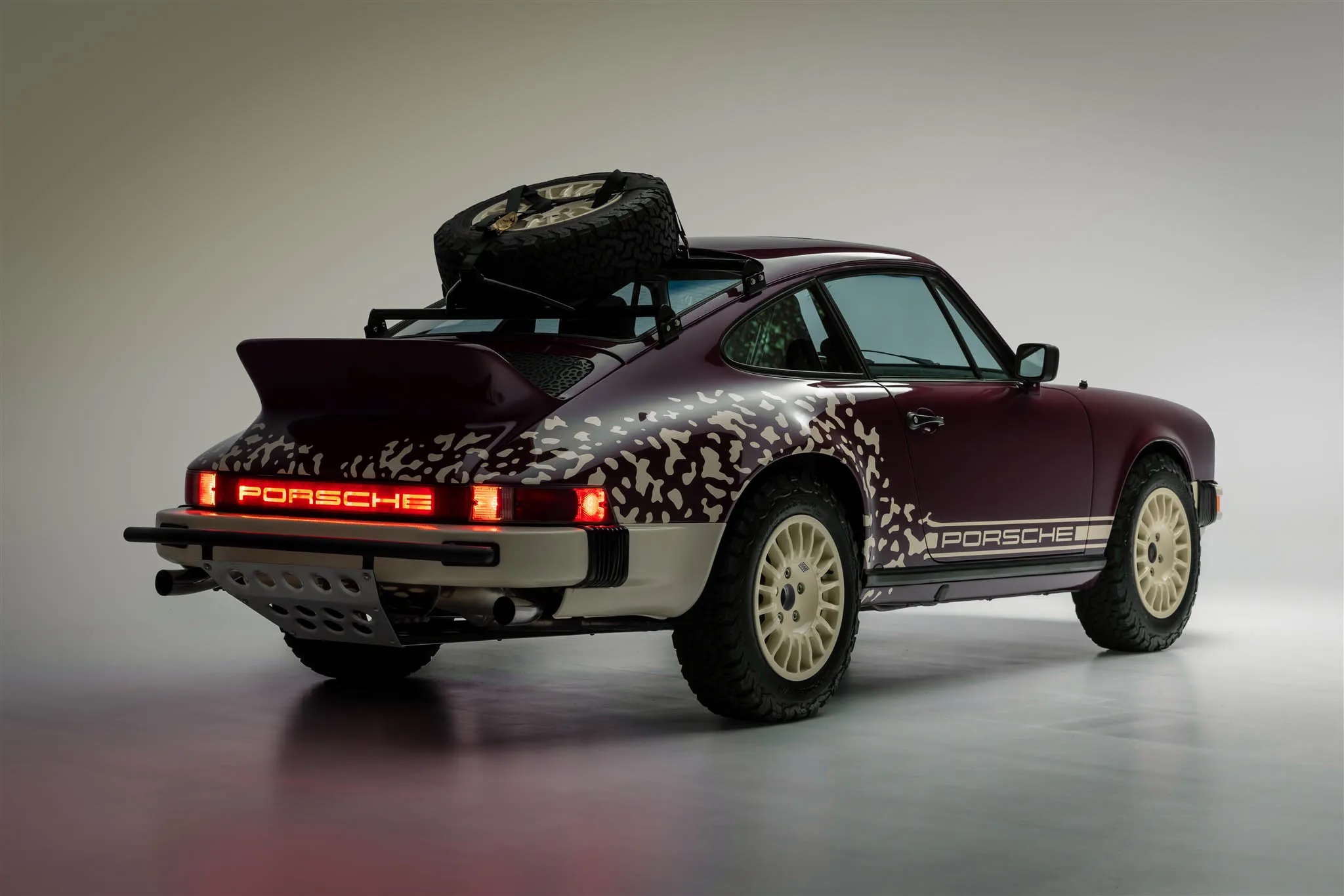This particular 1983 Porsche 911 SC coupe has been transformed into a “Safari” style vehicle. The Ruby Red Metallic paint job with ivory accents and decals is complemented by brush guards, a ducktail spoiler, additional lighting, protective skid plates, a performance suspension upgrade, upgraded sway bars, and off-road capable wheels and tires.