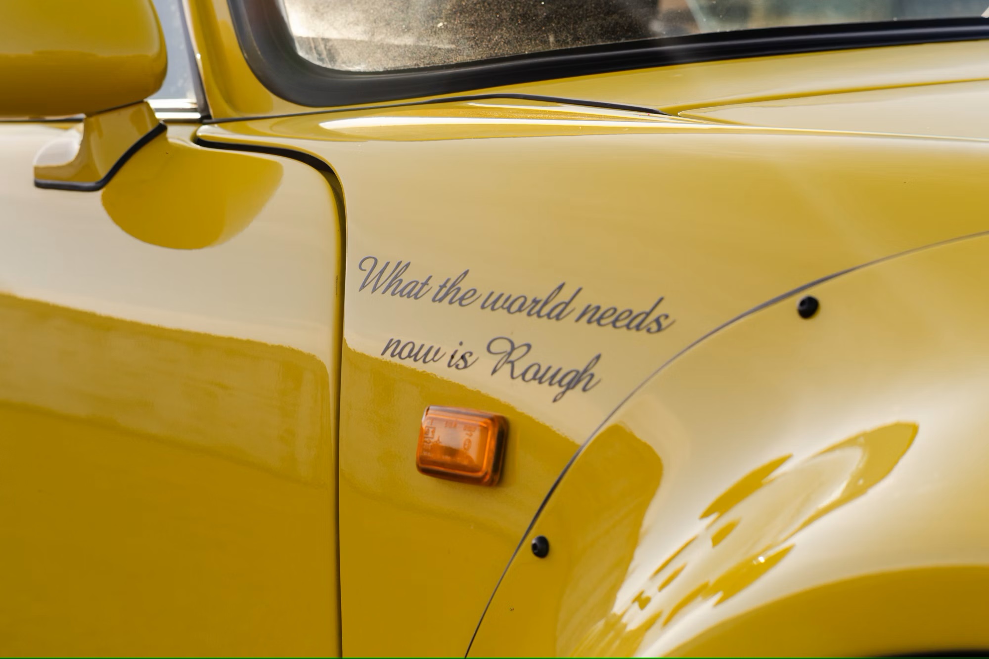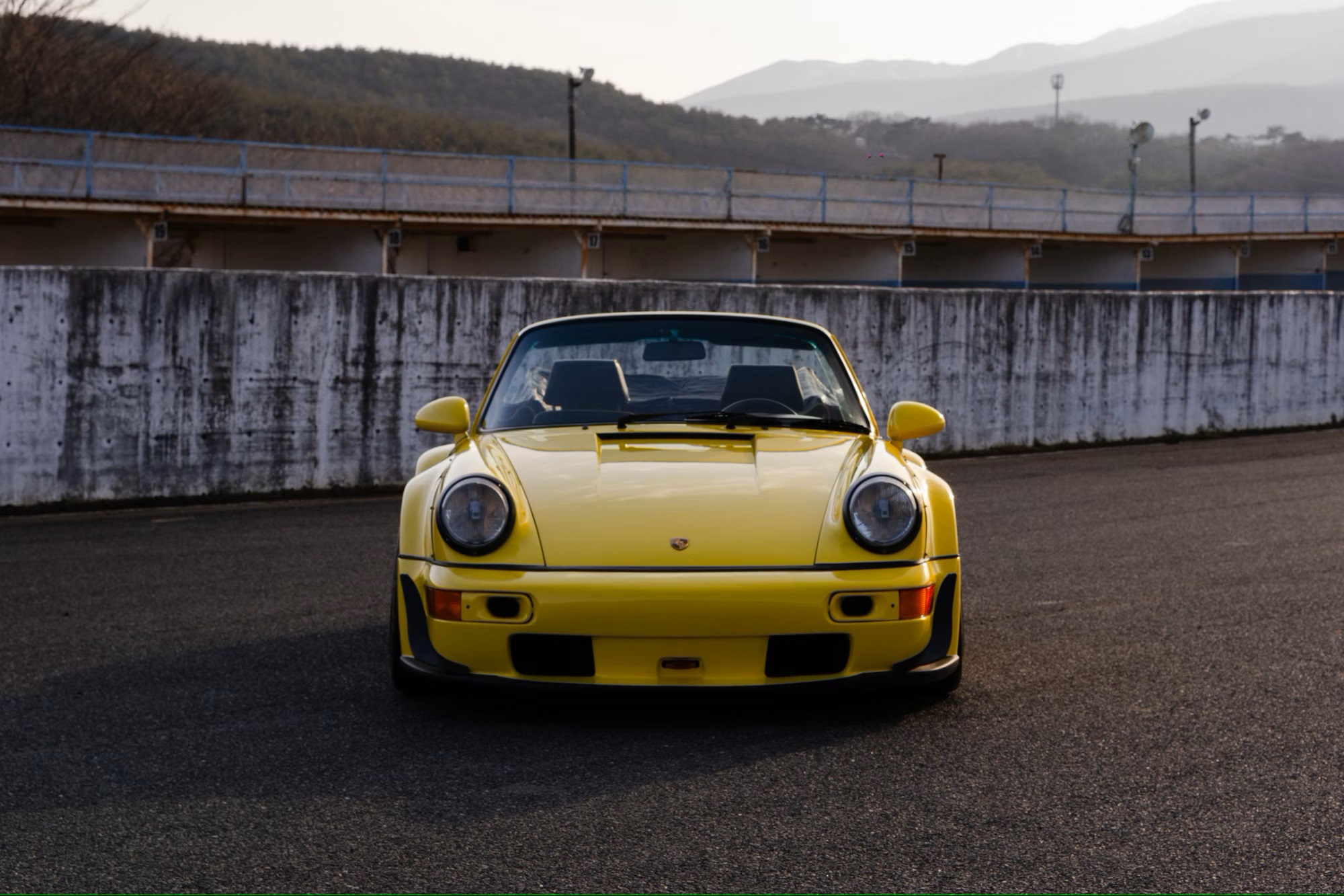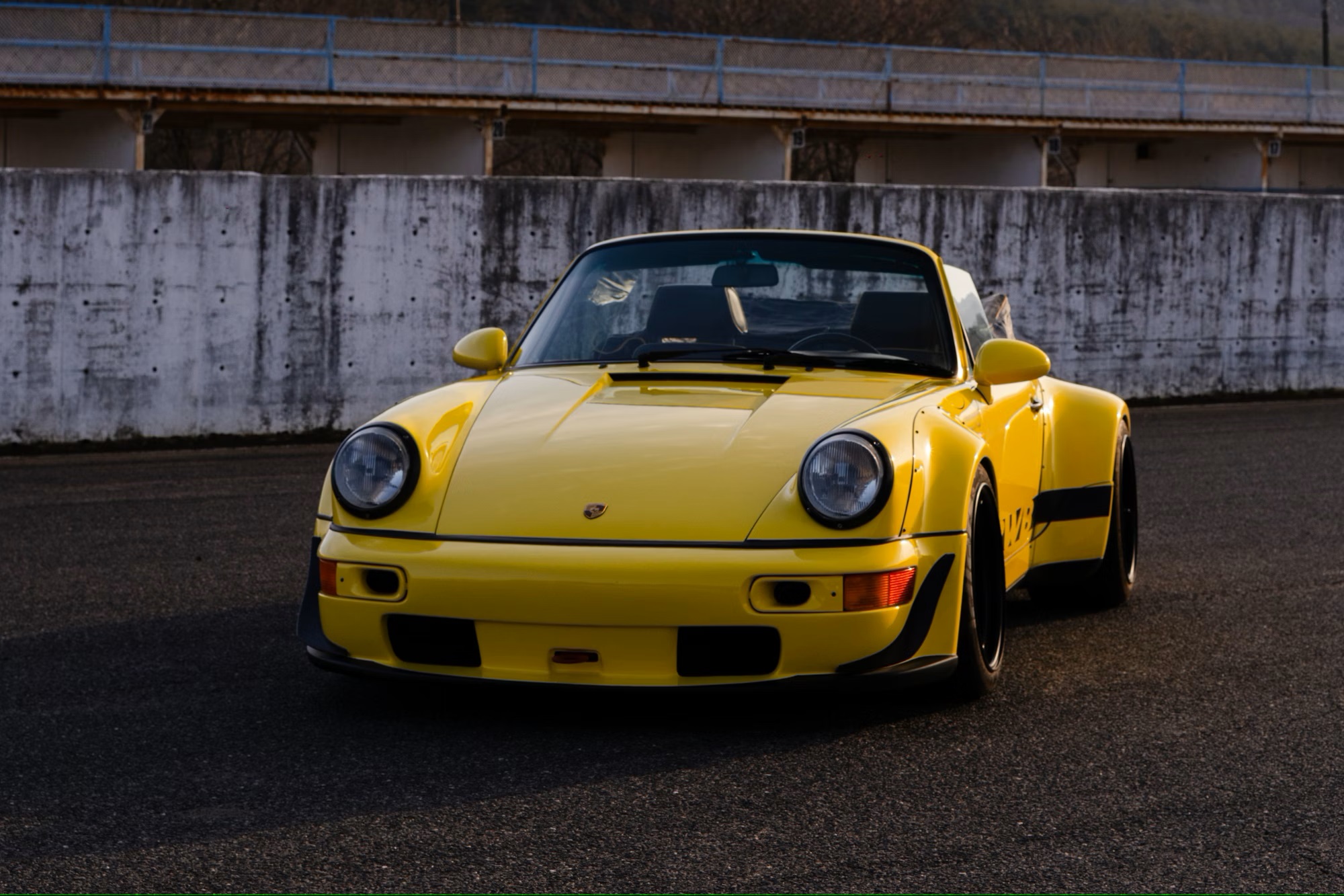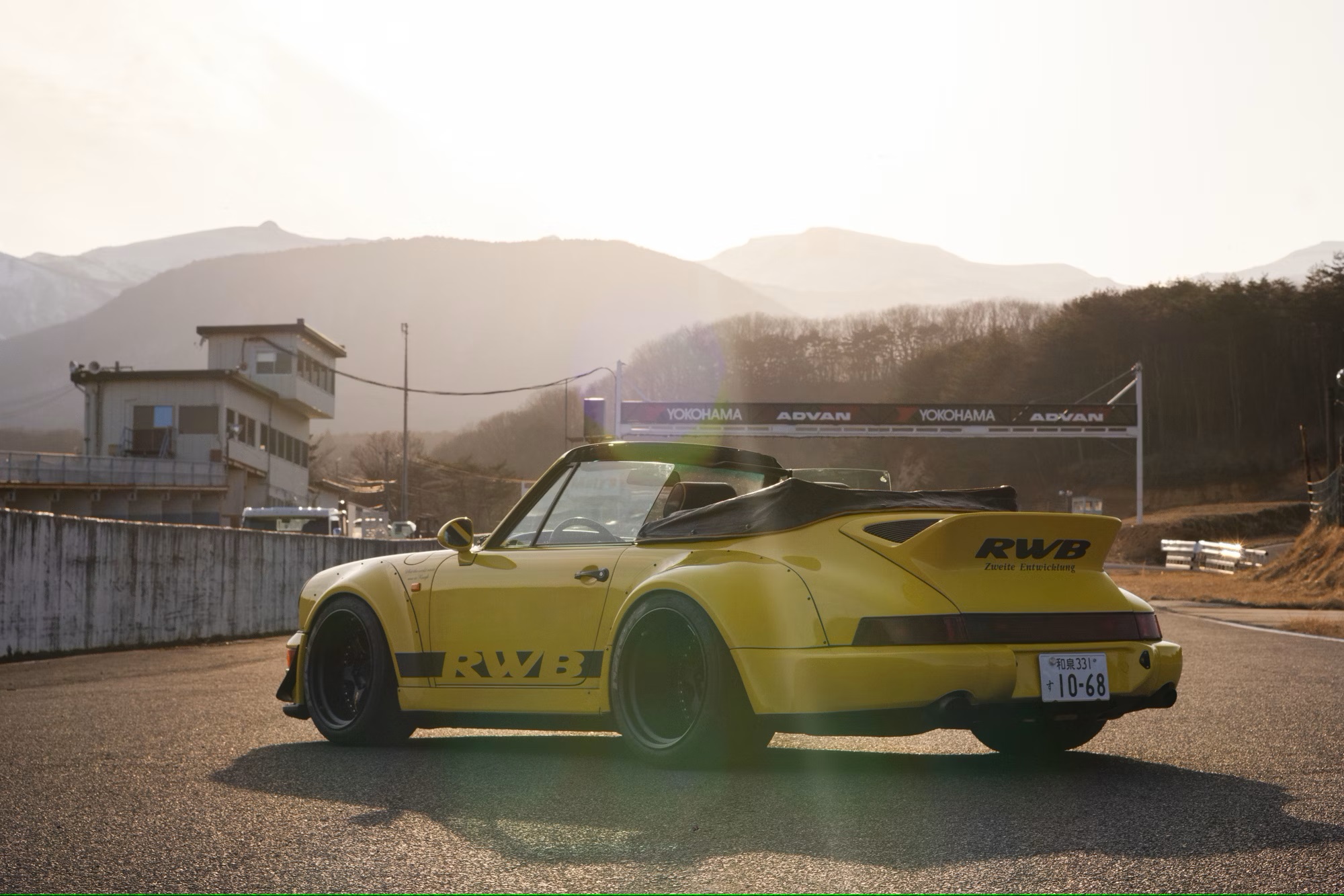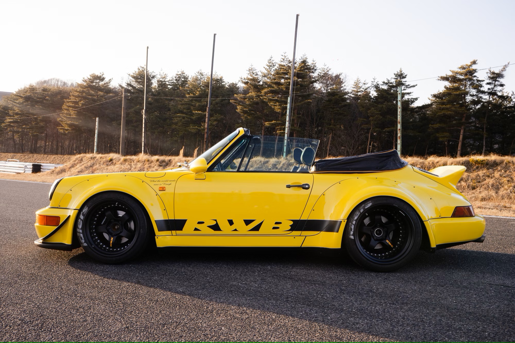 It is painted in yellow with a black convertible roof, ‘RWB’ side stripes, an ‘RWB Zweite Entwicklung’ spoiler decal, and ‘What the world needs now is Rough’ quotes on the front wings. The car rides on aftermarket 18-inch 10.5J front and 13J rear five-spoke split-rim alloy wheels finished in matte-black, with Nankang Sportnex CR-S tyres.