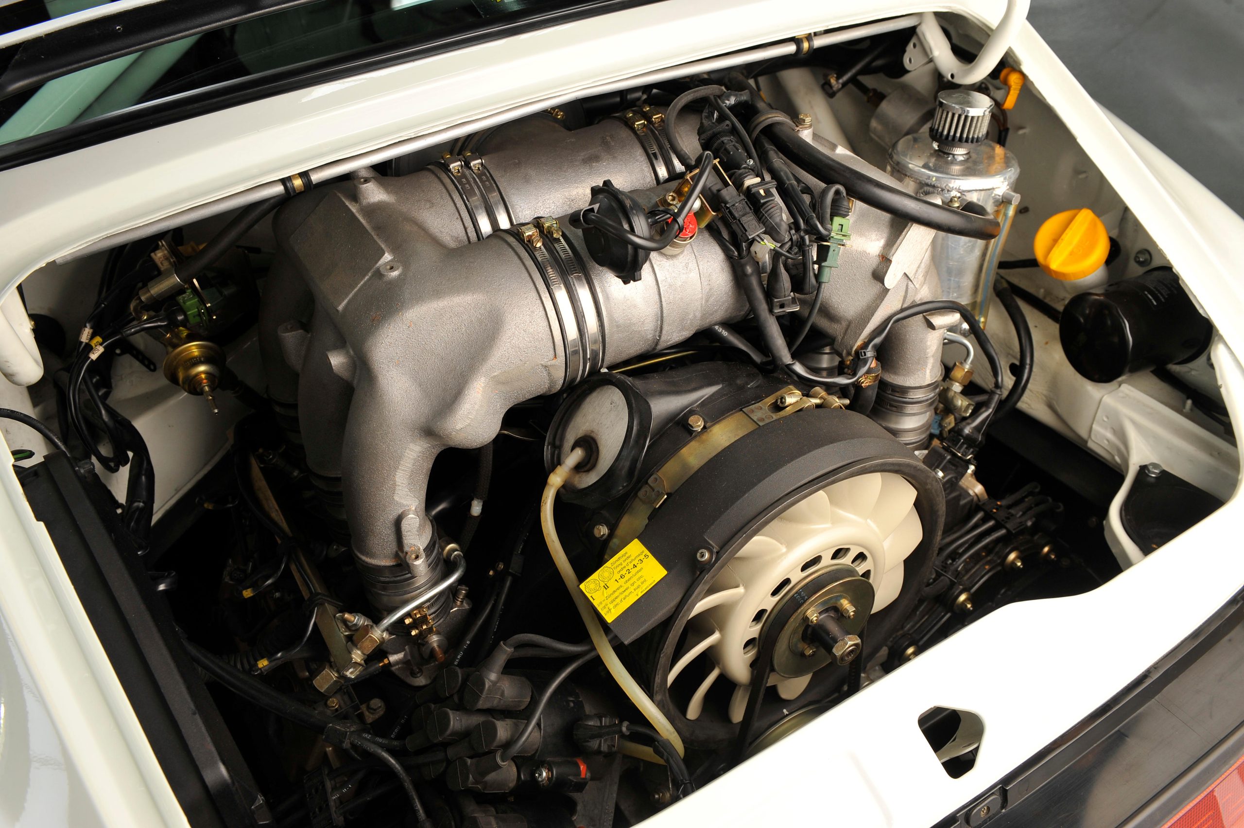 The RSR 3.8, known for its featherweight construction, is outfitted with an air-cooled, naturally aspirated six-cylinder Type 64/04 engine derived from the 964’s 3.6-liter powerplant. It boasts elevated compression, dual ignition, individual butterfly valves for each cylinder, and Bosch electronic fuel injection, resulting in an official rating of 325 horsepower. In reality, however, the engine delivers a substantial 375–390 horsepower.