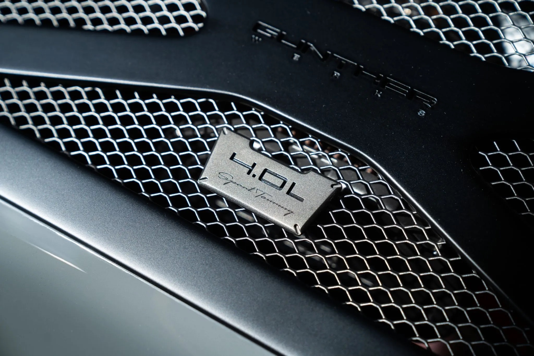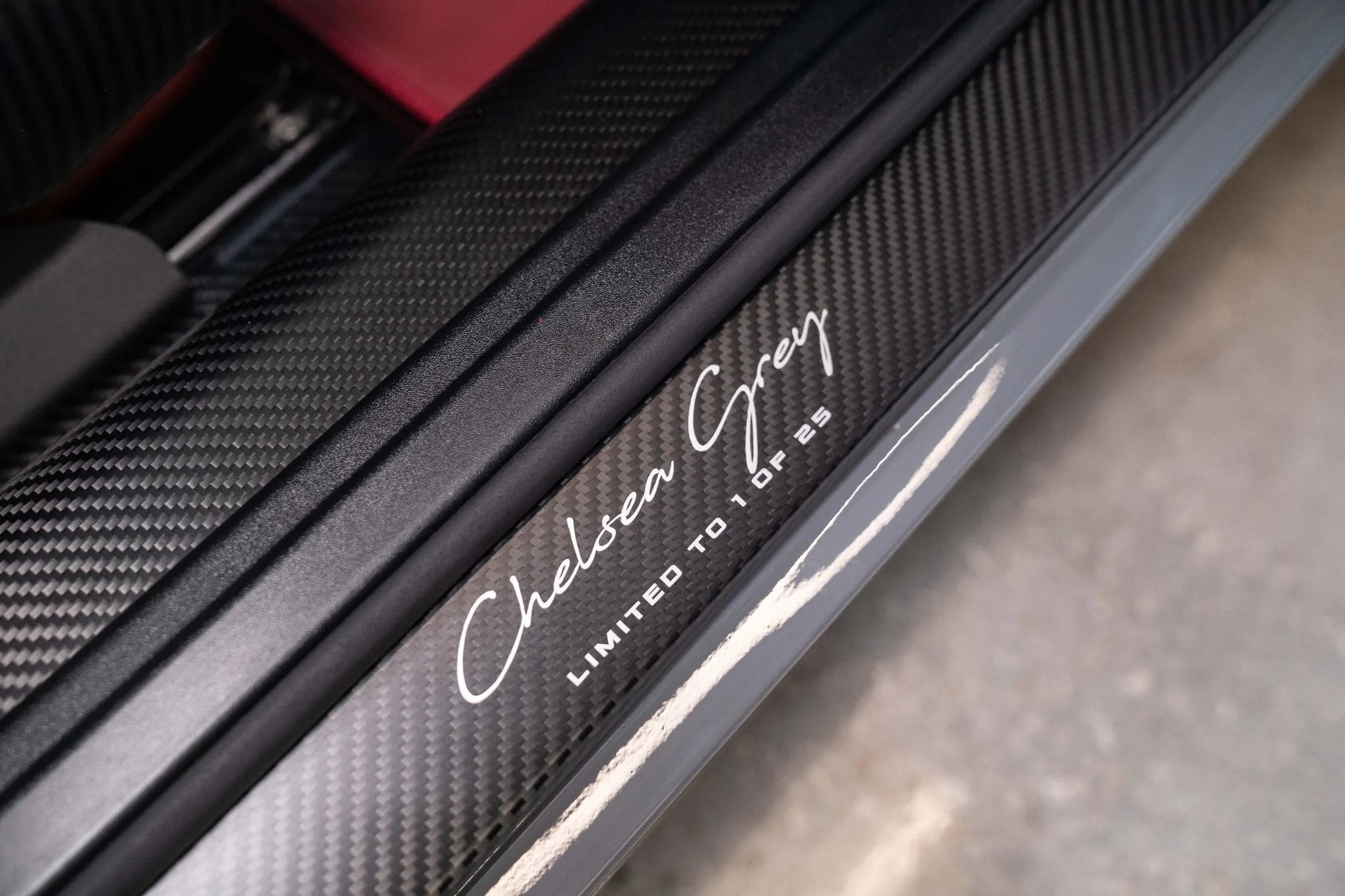 The interior boasts matte carbon fiber elements, luxurious red leather on the lower dashboard and footwells, and gray Alcantara suede trimmings. The “Chelsea Grey Limited to 1 of 25” script on the carbon fiber cabin sills underscores its exclusivity.