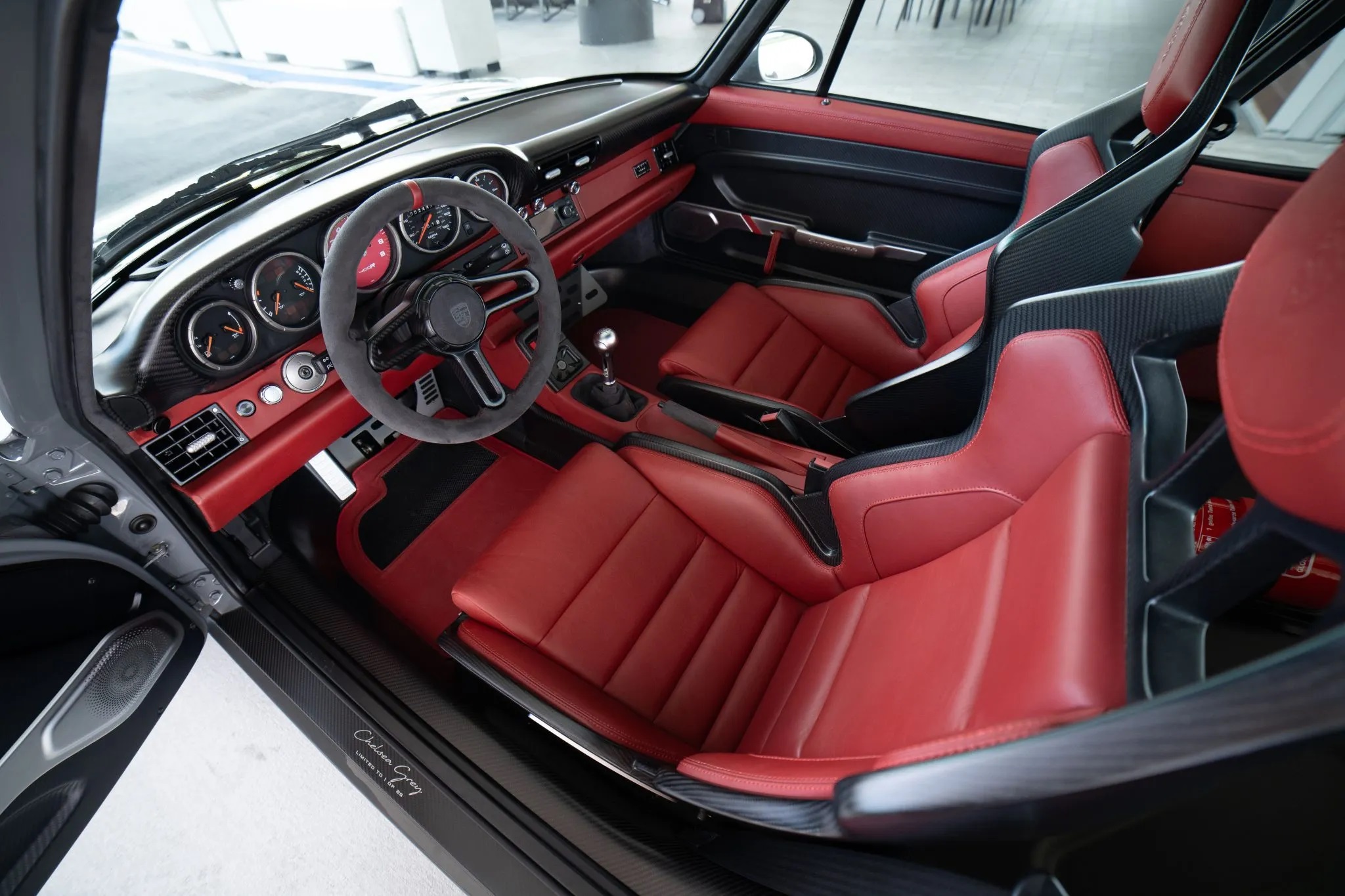 The car’s carbon fiber exterior is finished in Chelsea Grey, an elegant shade similar to Porsche’s China Grey. Widened rocker panels bear red Porsche font within ghosted grey side stripes. At the rear, a custom LED light bridge and black Bi-LED headlights enhance its distinct look, complemented by black satin detailing on the window trim, badging, Brembo calipers, and the X-frame.