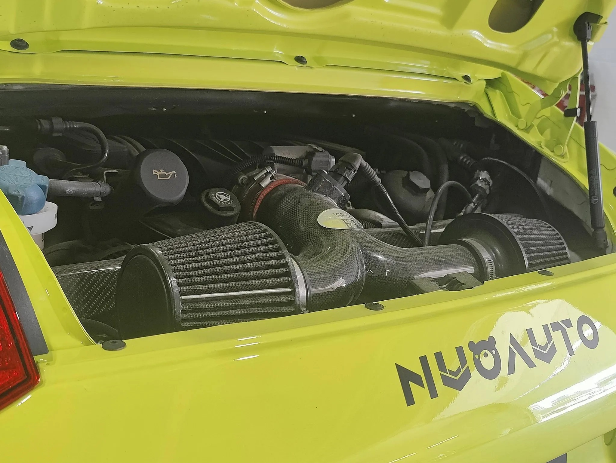 Painted in Acid Green with a black leather interior, the vehicle features a widebody kit, a ducktail decklid, and various performance enhancements. These include an ECUWerks stage two tune, a Fabspeed carbon-fiber air intake, tubular headers, and an Armytrix exhaust system. The suspension has been upgraded to KW V3 coilovers, complemented by 19-inch three-piece wheels.