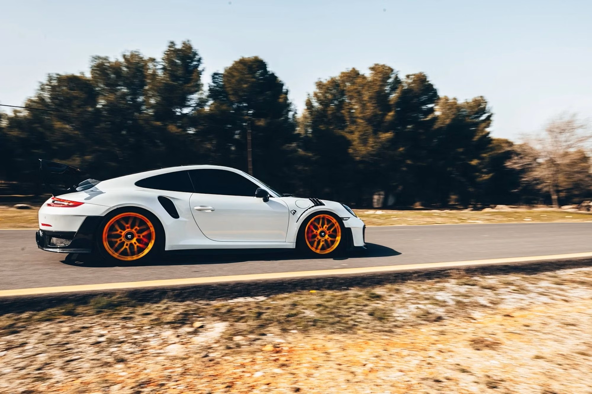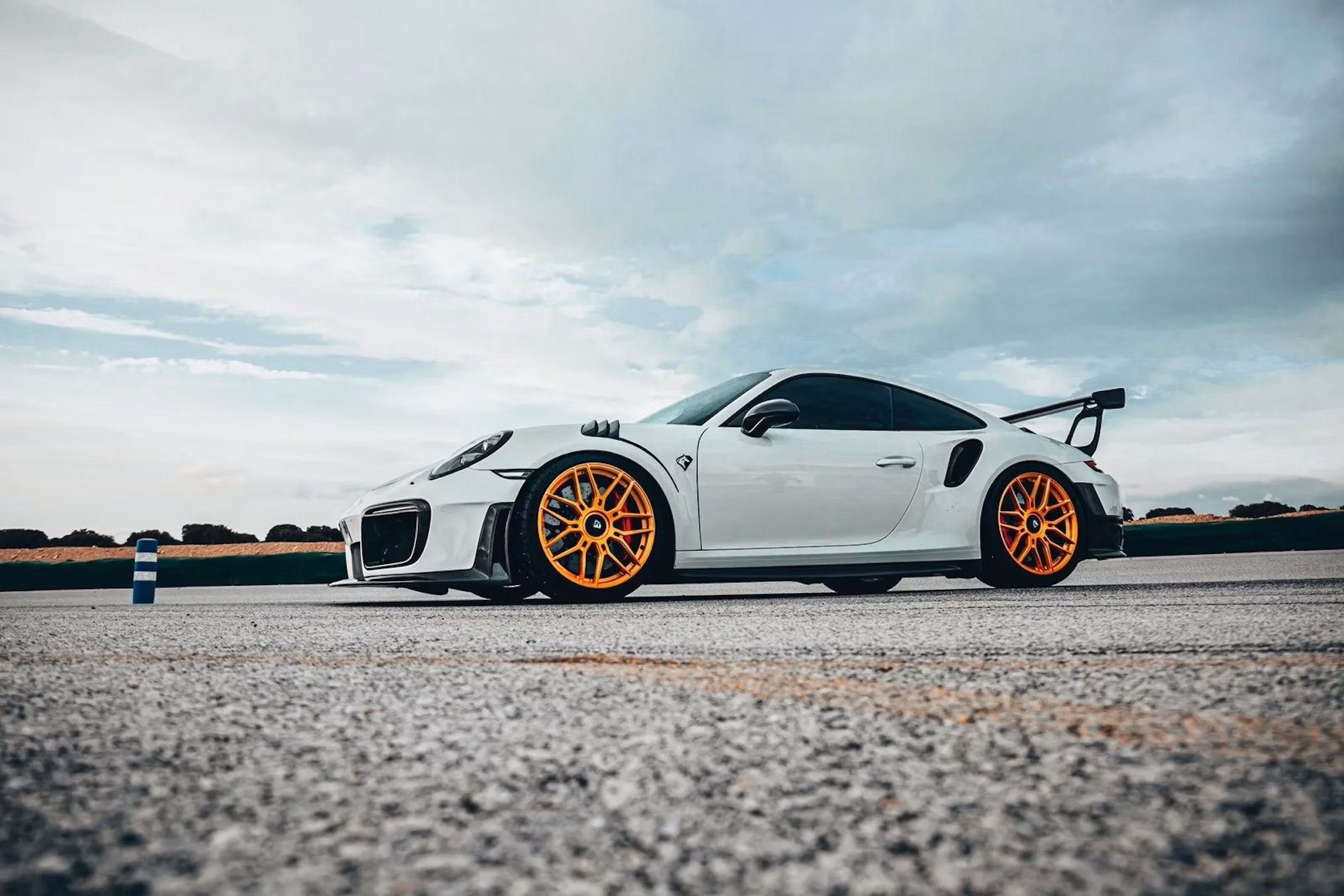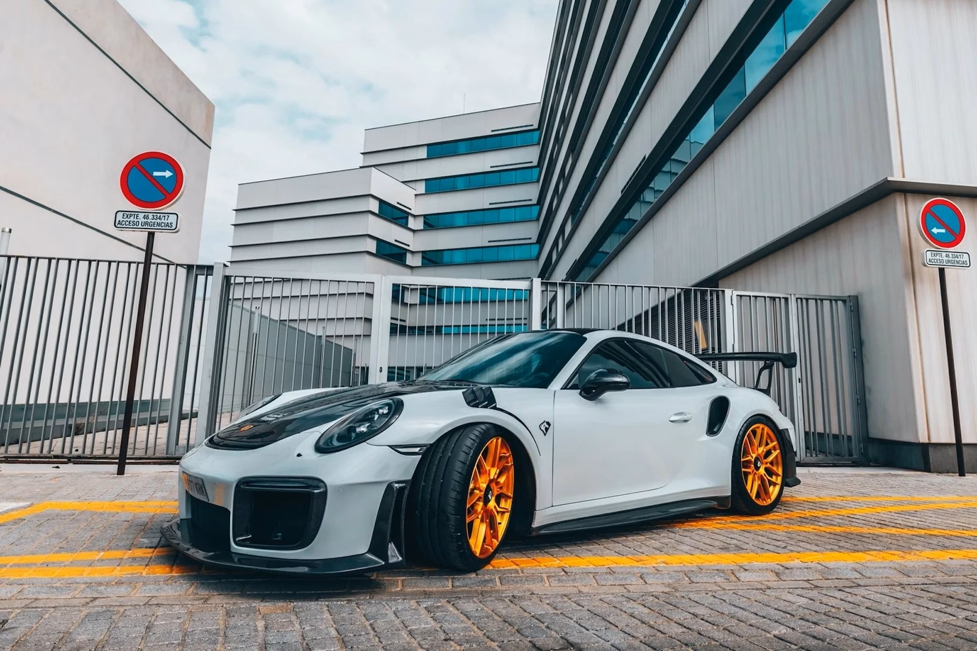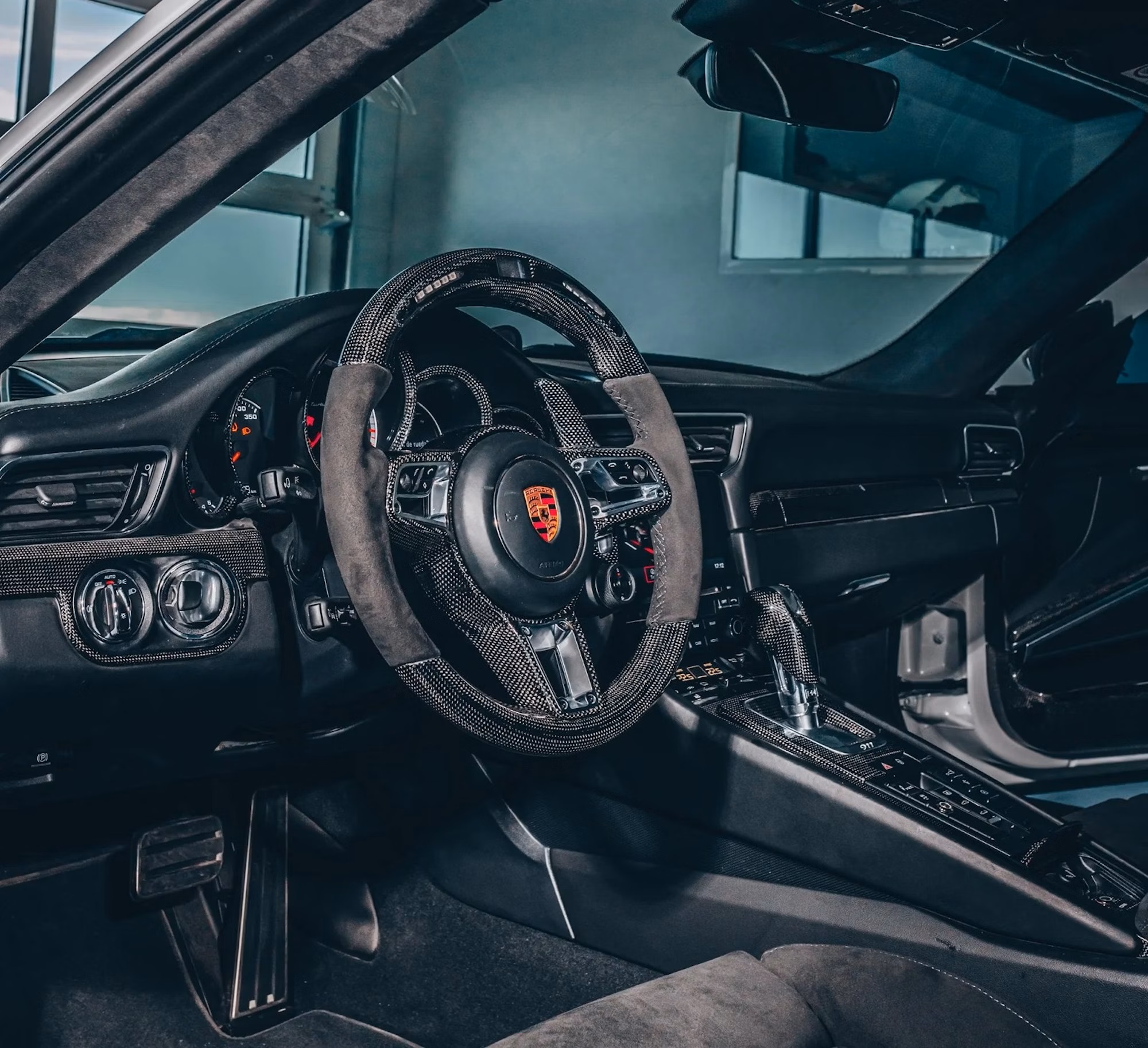 Fitted with a unique 26-piece carbon-fiber body kit designed by MRP Performance, it is finished in a popular white with a contrasting gloss black roof and numerous carbon-fiber trim elements. The interior features black leather and Alcantara upholstery, embroidered Porsche crests on the headrests, and brushed aluminum and carbon-fiber accents.