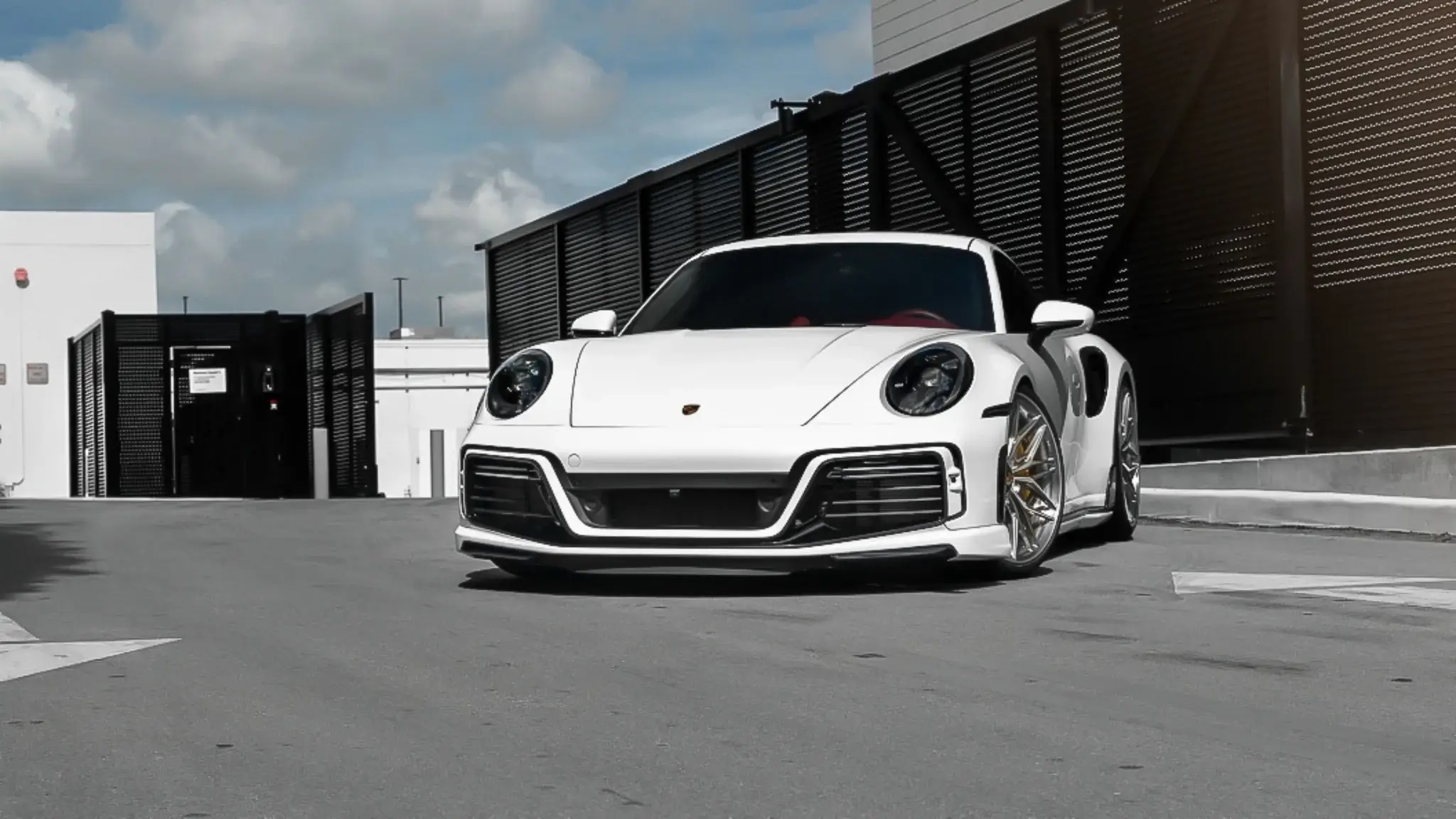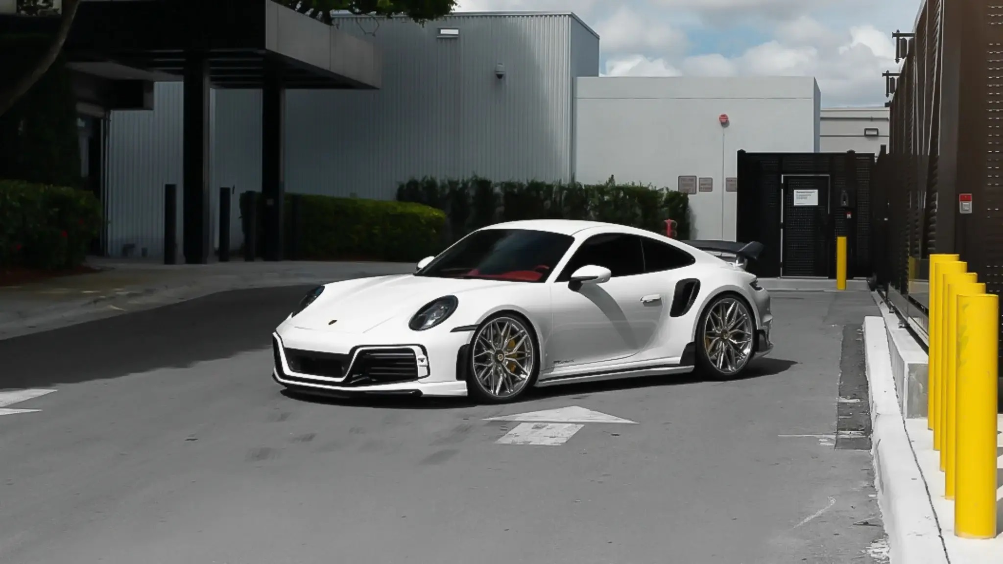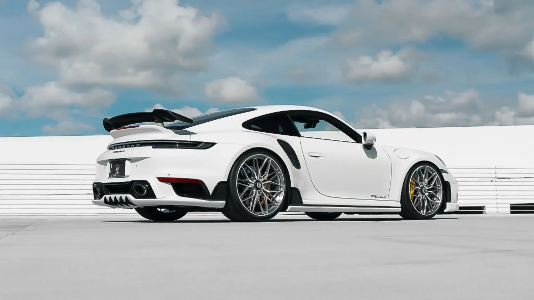 The Turbo S Coupe, finished in White, has been upgraded with a TechArt body kit, featuring a front bumper with gloss black accents and a painted spoiler, side skirts with carbon fiber fins, carbon fiber side air intake trim, a rear valence, and a carbon fiber spoiler wing.