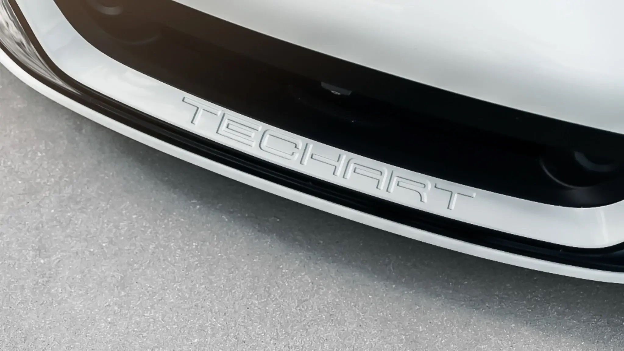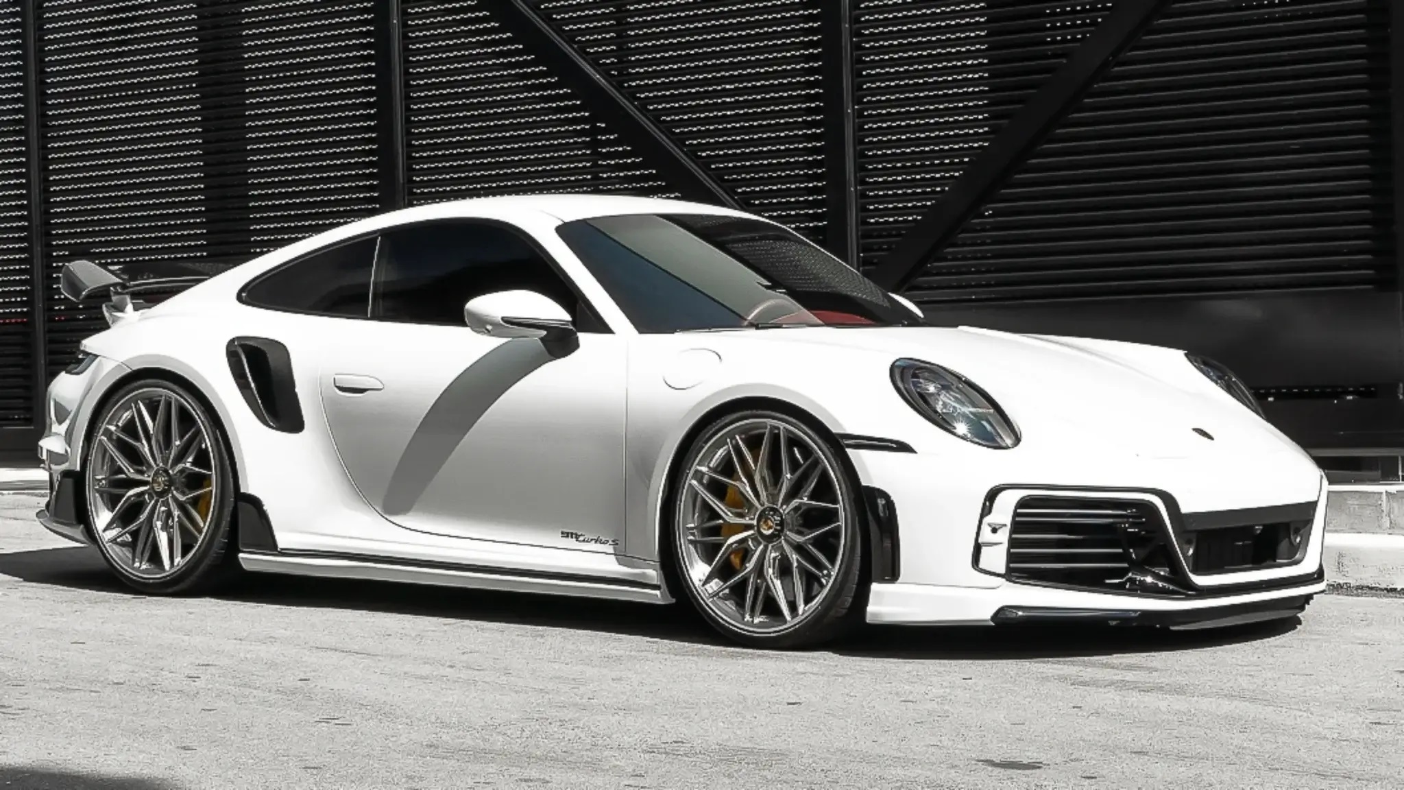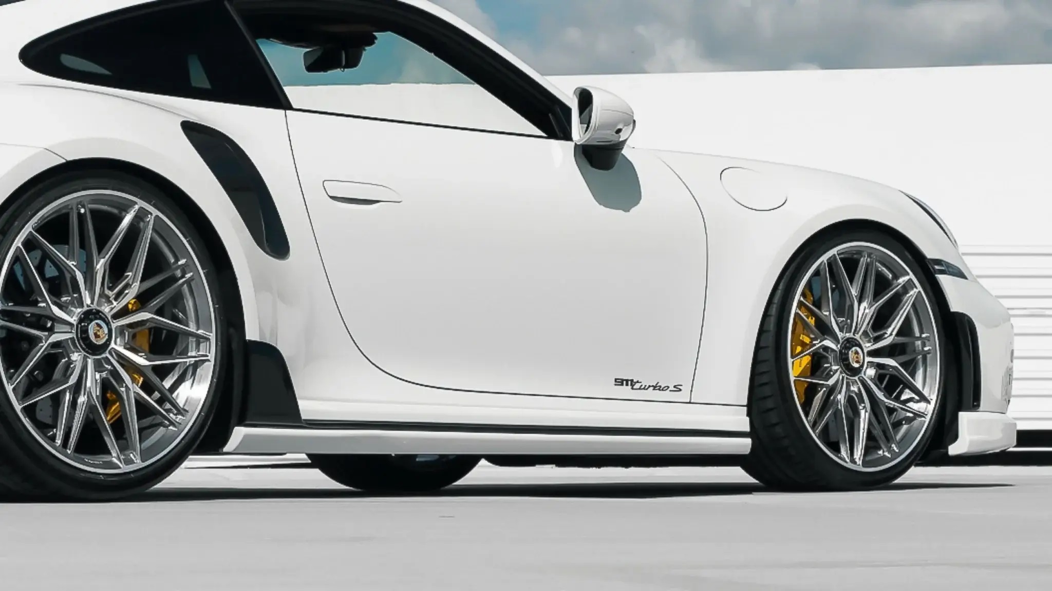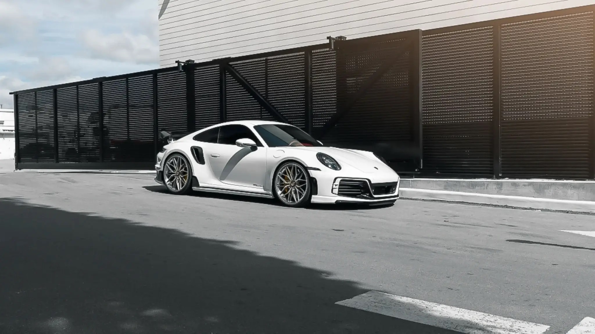 The Turbo S Coupe, finished in White, has been upgraded with a TechArt body kit, featuring a front bumper with gloss black accents and a painted spoiler, side skirts with carbon fiber fins, carbon fiber side air intake trim, a rear valence, and a carbon fiber spoiler wing.